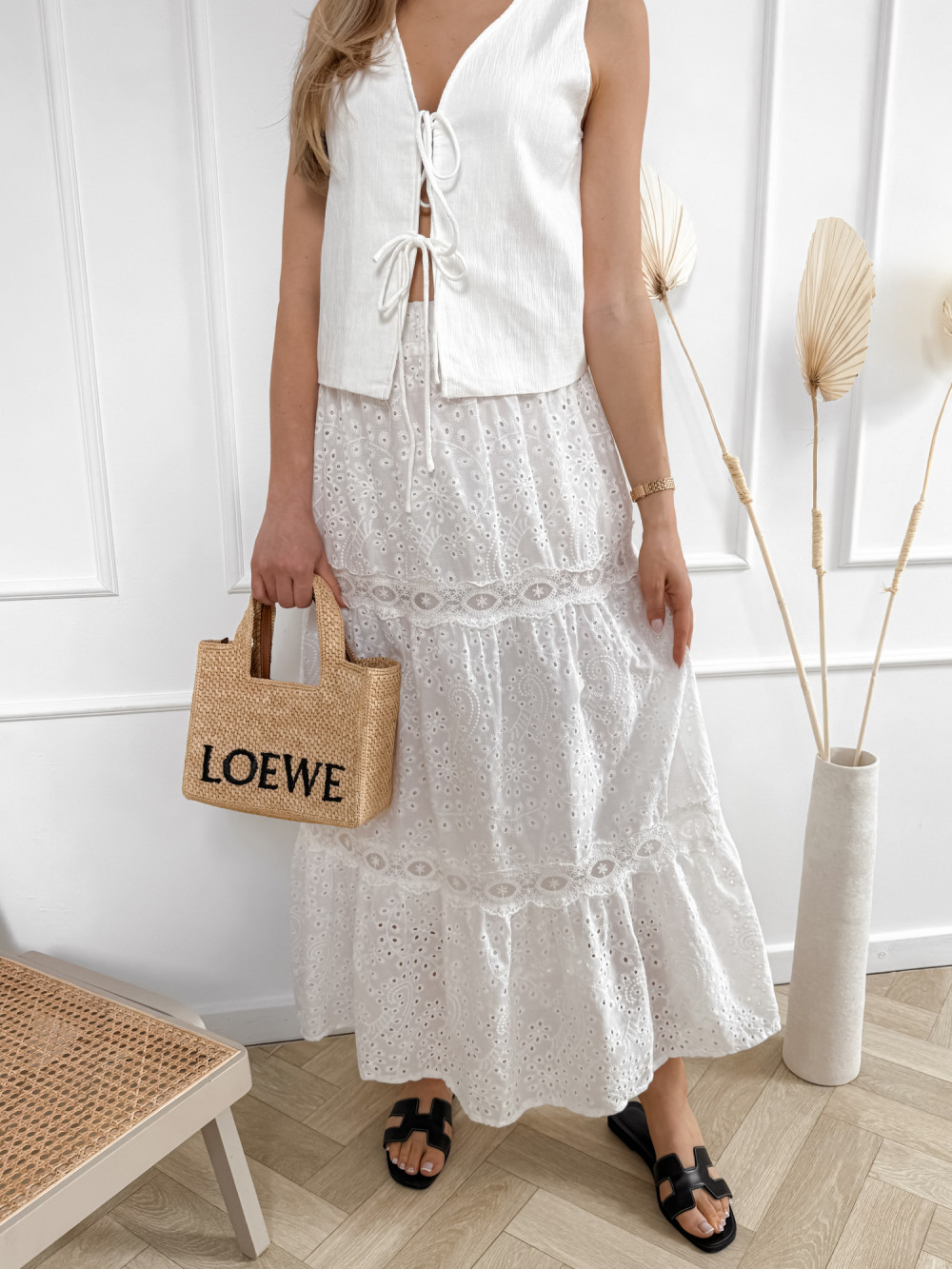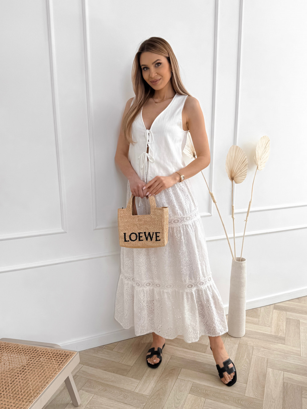 Biała kamizelka TISELLE z dekoracyjnym wiązaniem z przodu to stylowy i kobiecy element letnich stylizacji. Uszyta z lekkiej tkaniny (85% wiskoza, 15% poliamid), jest przewiewna, miękka i przyjemna w noszeniu. Subtelne wiązanie na całej długości nadaje jej oryginalny wygląd i pozwala na swobodne dopasowanie do sylwetki. Kamizelka TISELLE świetnie sprawdzi się jako narzutka na top, sukienkę czy kostium kąpielowy – to doskonały wybór na wakacje, plażę i letnie spacery w stylu boho.