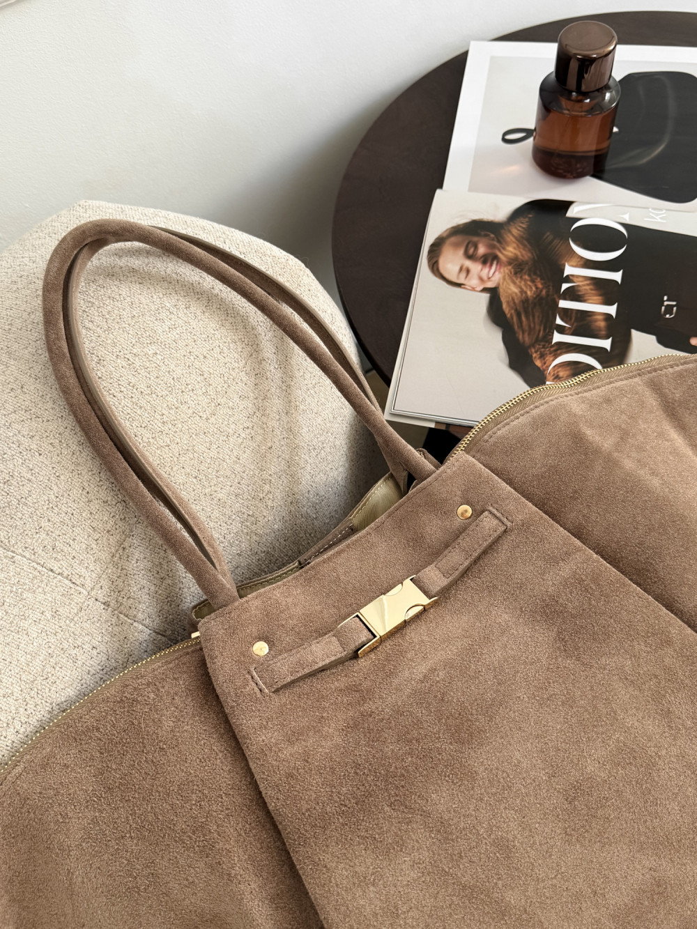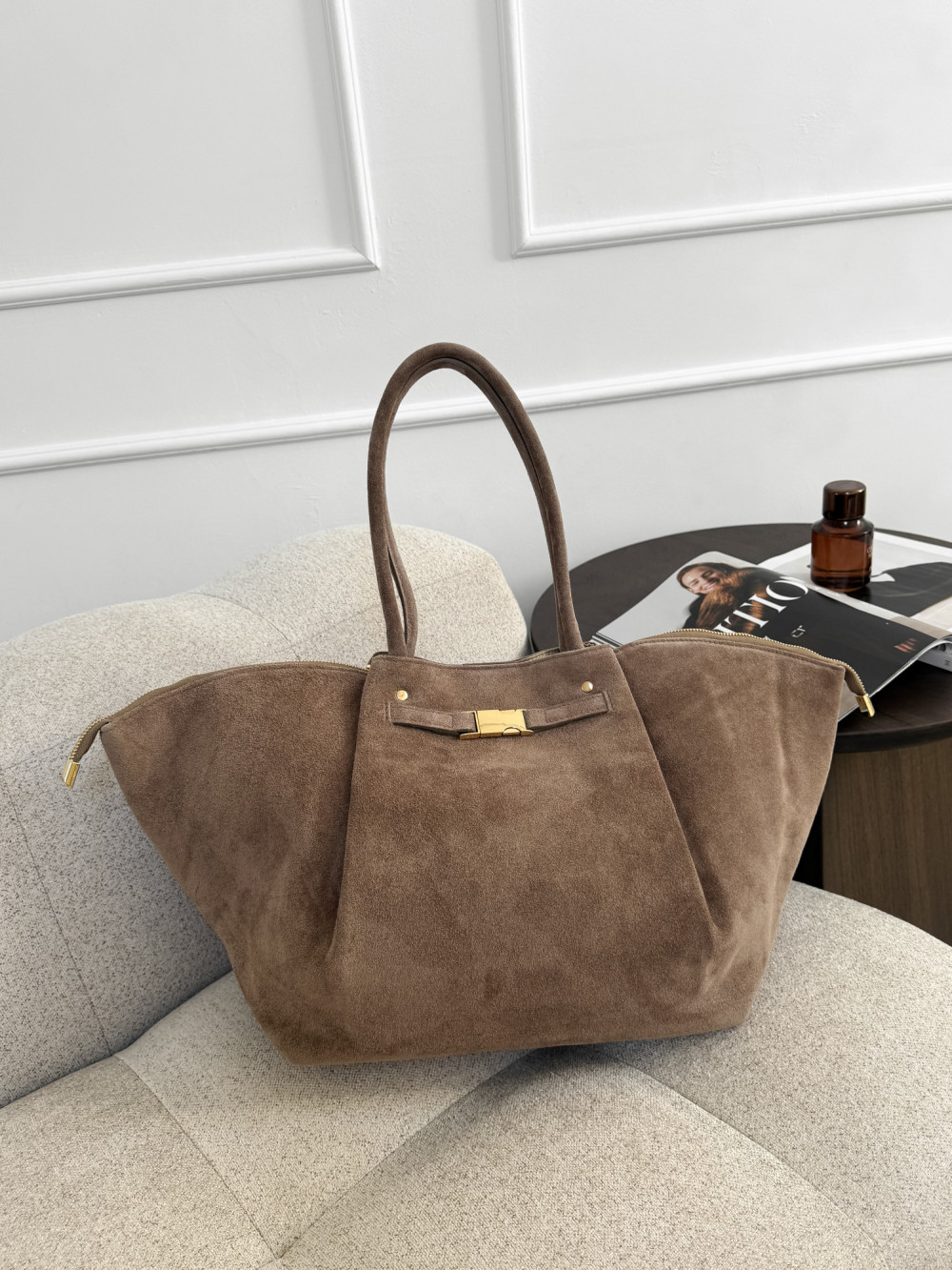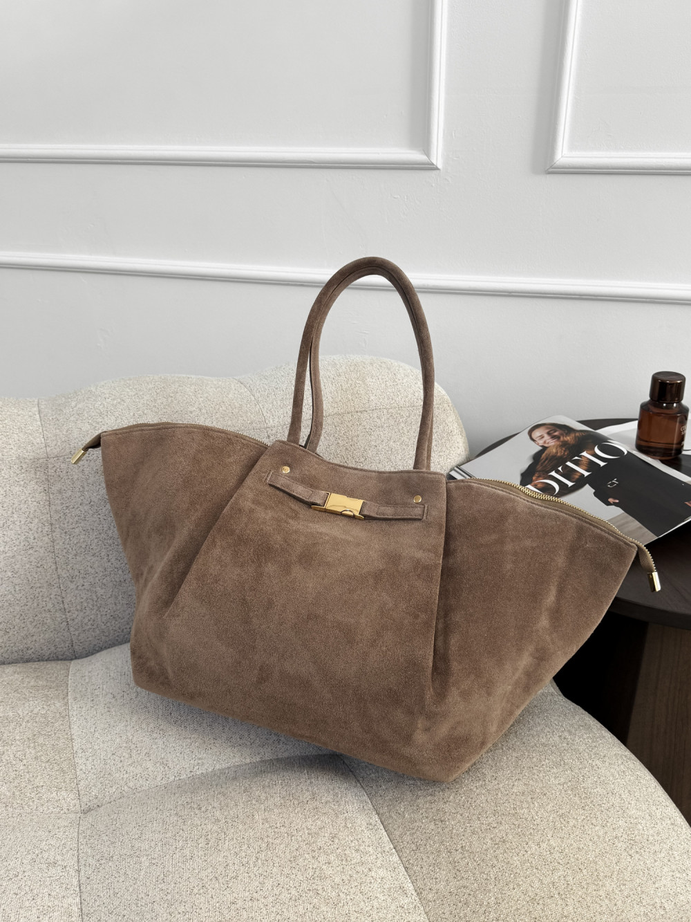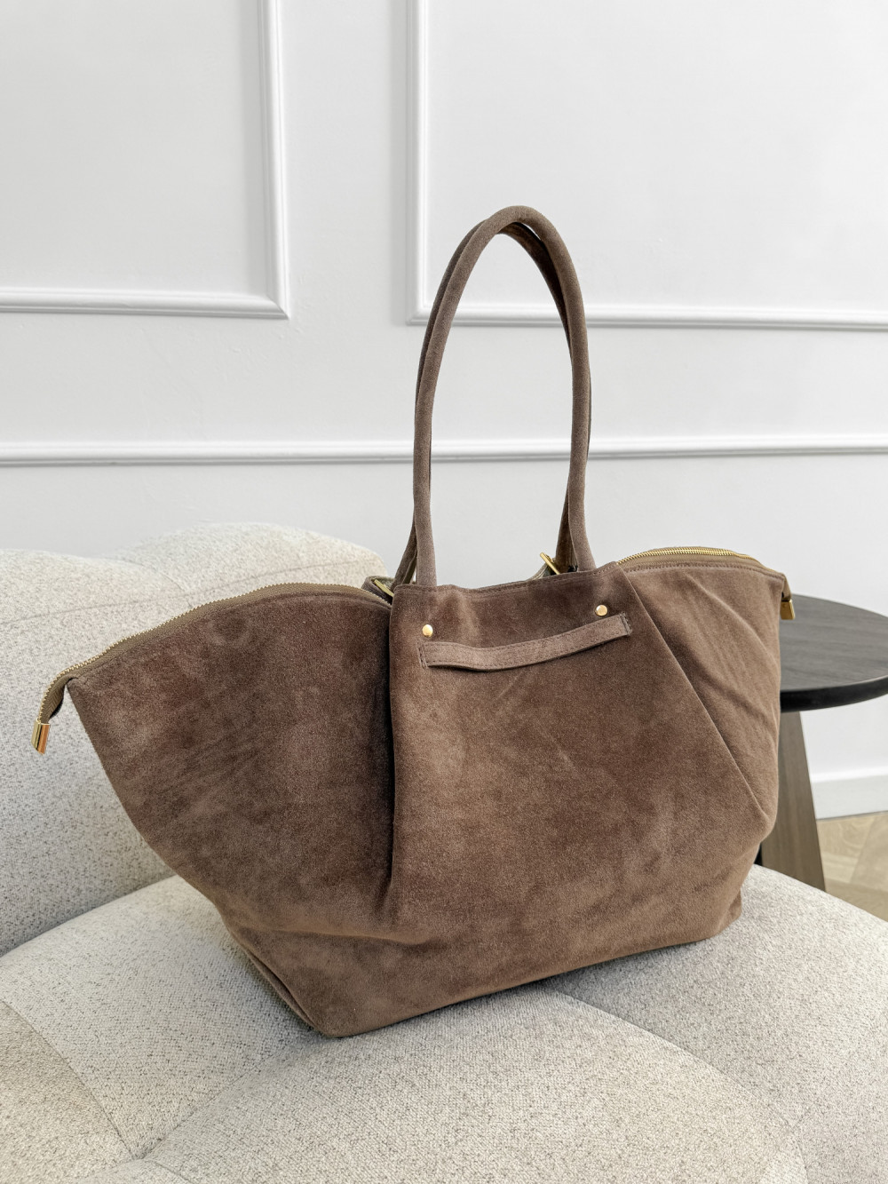 Torebka LEONIE MAXI z naturalnej skóry zamszowej w odcieniu mocha to elegancki i przestronny model, który łączy luksusowy materiał z subtelnymi detalami. Miękka skóra zamszowa zachwyca przyjemną fakturą, a ciepły odcień mocha nadaje torebce uniwersalnego i wyrafinowanego charakteru. Złote, delikatne akcenty podkreślają elegancję modelu, dzięki czemu LEONIE MAXI świetnie sprawdzi się zarówno w codziennych, jak i bardziej szykownych stylizacjach.