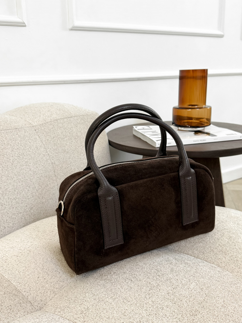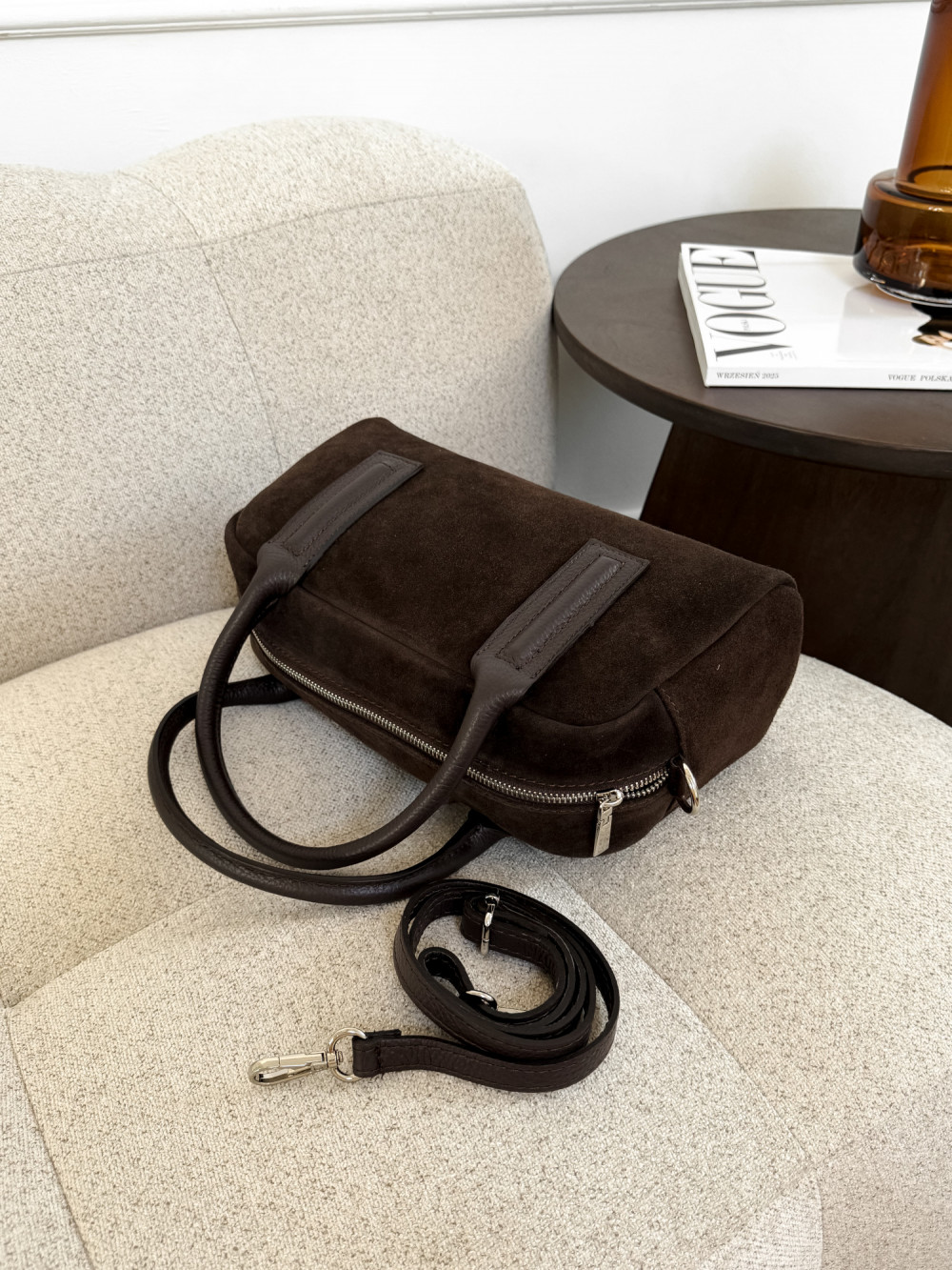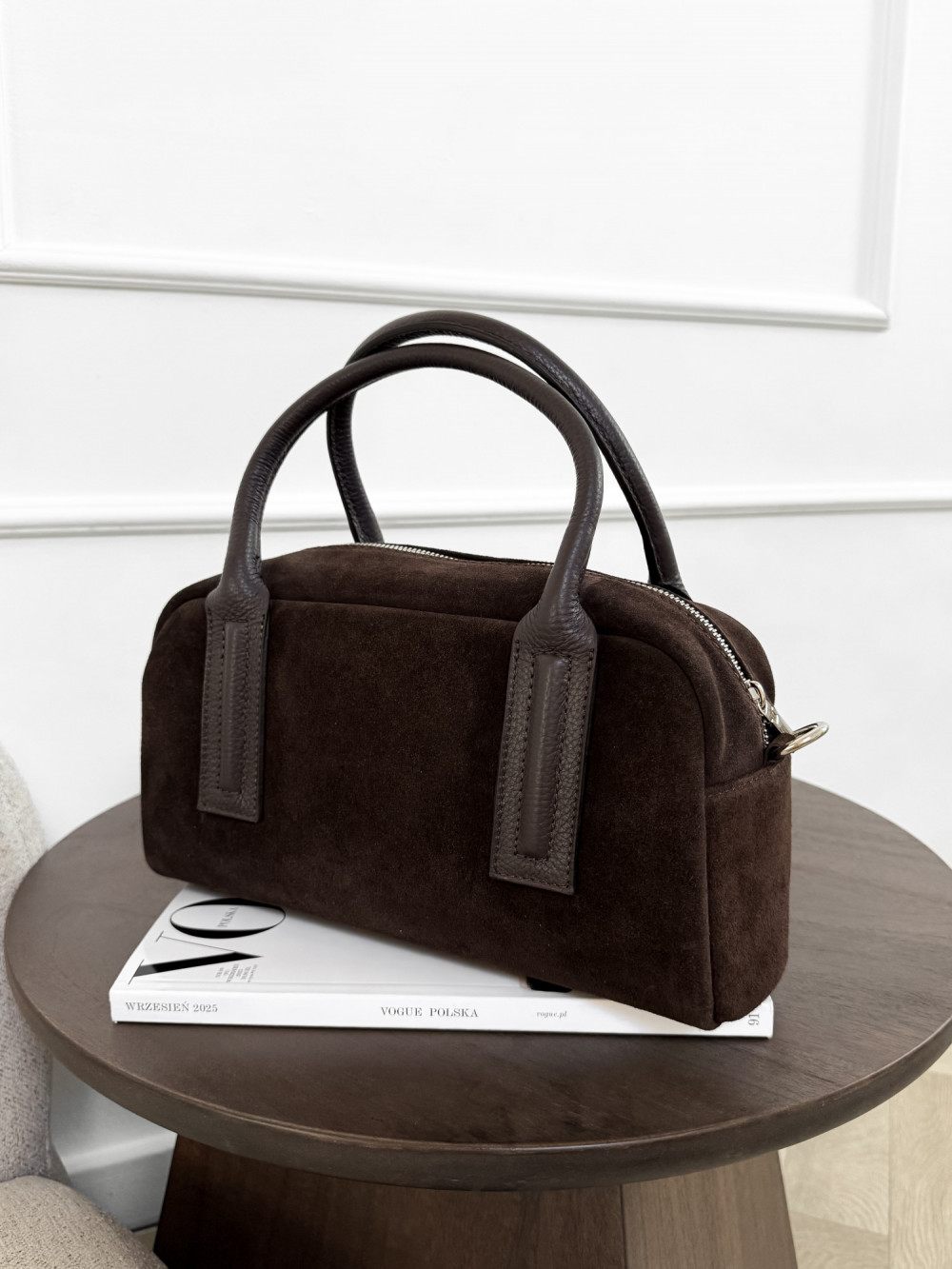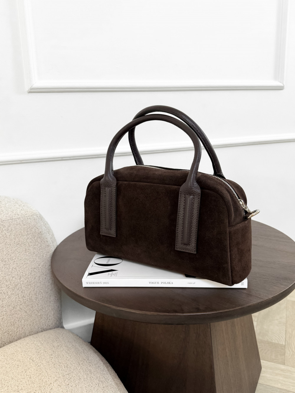 Torebka LASSE z naturalnej skóry zamszowej w kolorze czekolady to elegancki i ponadczasowy model, który wprowadza luksusowy akcent do każdej stylizacji. Miękka skóra zamszowa zachwyca przyjemną fakturą i subtelnym, matowym połyskiem, a głęboki odcień czekolady nadaje torebce wyrafinowanego, uniwersalnego charakteru. LASSE świetnie sprawdzi się zarówno w codziennych, jak i bardziej eleganckich zestawach, dodając stylowego i ponadczasowego akcentu.