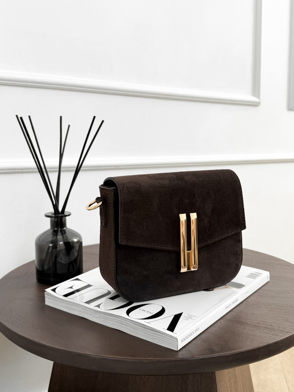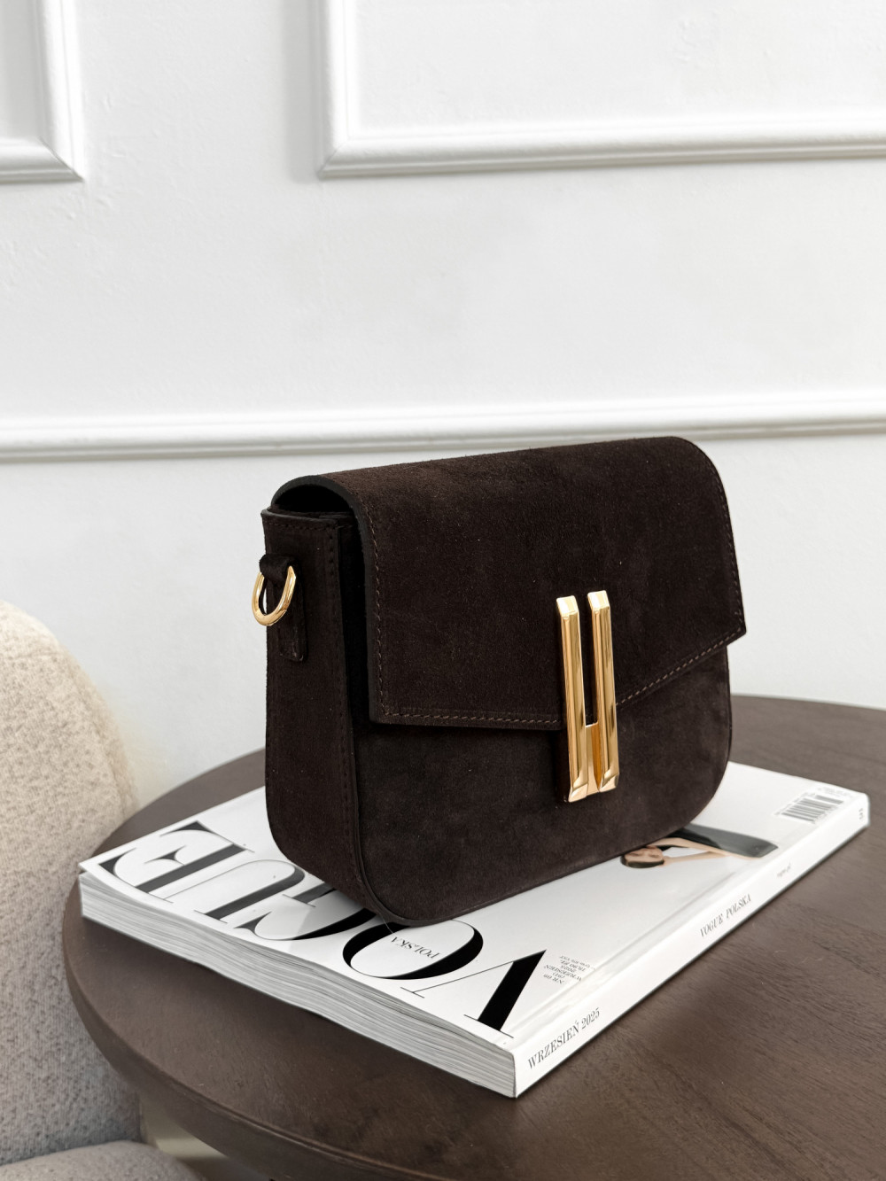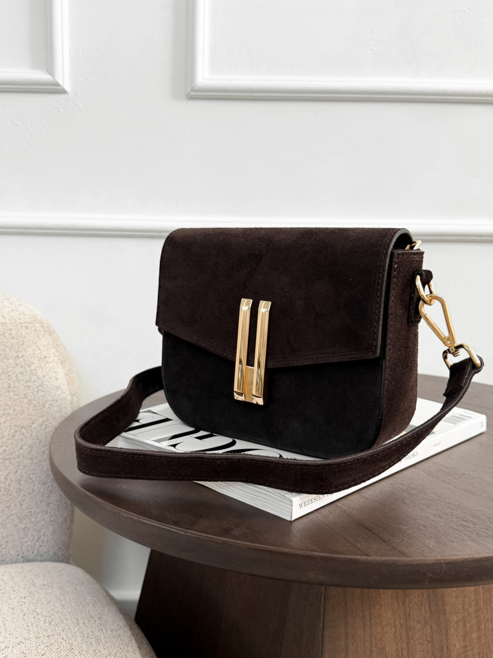 Torebka DEMMIE z naturalnej skóry zamszowej w kolorze czekolady to elegancki, ponadczasowy model, który wprowadza luksusowy akcent do każdej stylizacji. Miękka skóra zamszowa zachwyca przyjemną fakturą i subtelnym, matowym połyskiem, a głęboki odcień czekolady nadaje torebce wyrafinowanego charakteru. Złote zapięcie podkreśla elegancję modelu, dzięki czemu DEMMIE sprawdzi się zarówno w codziennych, jak i bardziej szykownych zestawach.