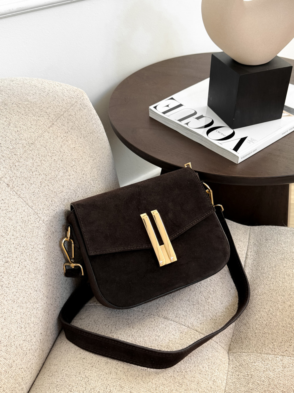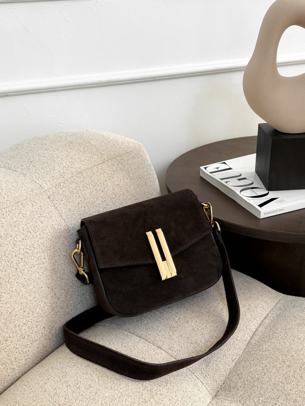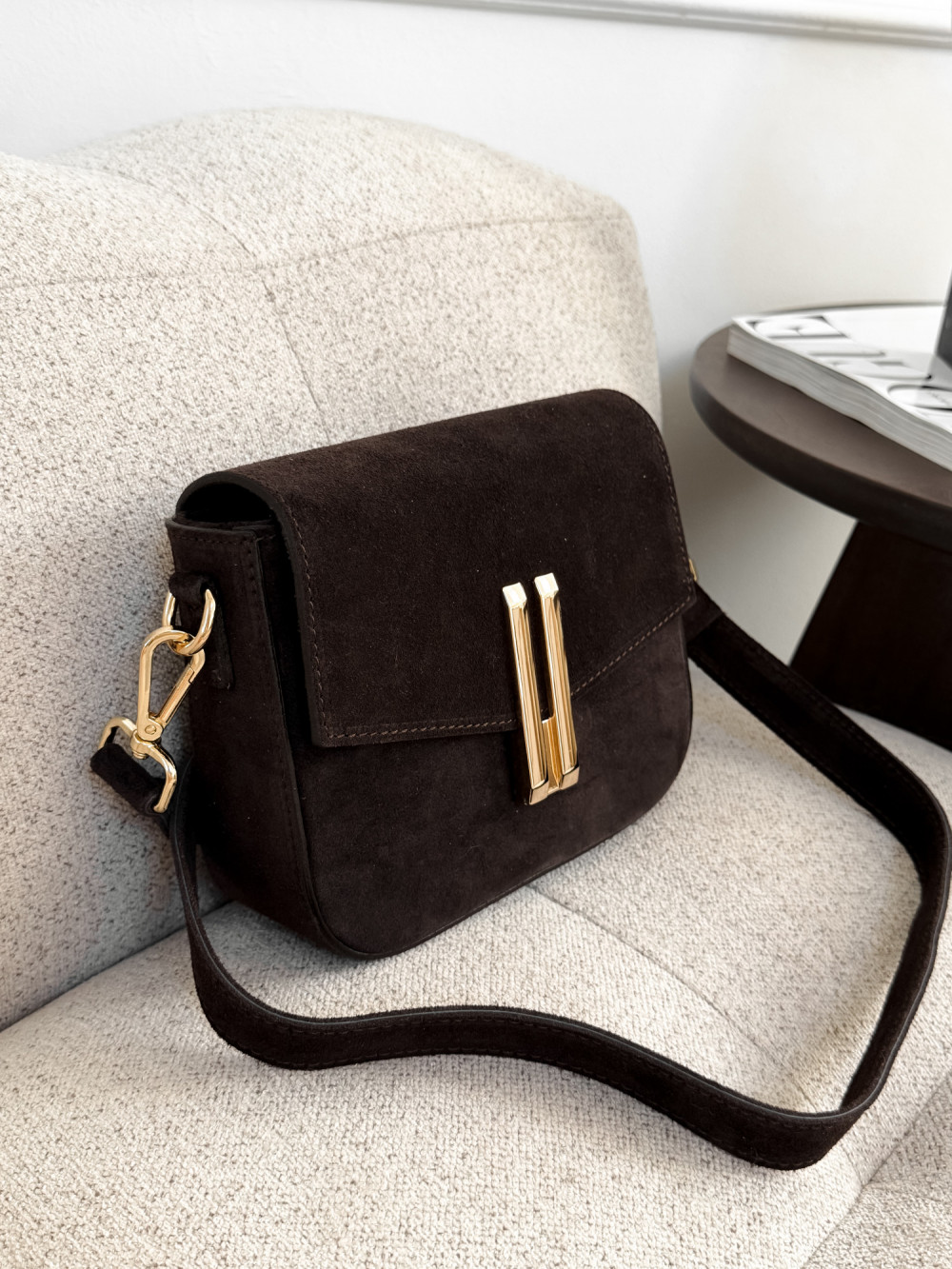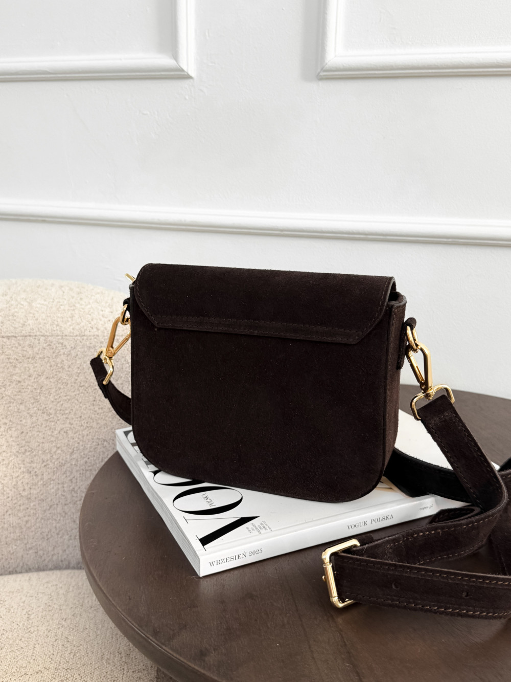 Torebka DEMMIE z naturalnej skóry zamszowej w kolorze czekolady to elegancki, ponadczasowy model, który wprowadza luksusowy akcent do każdej stylizacji. Miękka skóra zamszowa zachwyca przyjemną fakturą i subtelnym, matowym połyskiem, a głęboki odcień czekolady nadaje torebce wyrafinowanego charakteru. Złote zapięcie podkreśla elegancję modelu, dzięki czemu DEMMIE sprawdzi się zarówno w codziennych, jak i bardziej szykownych zestawach.