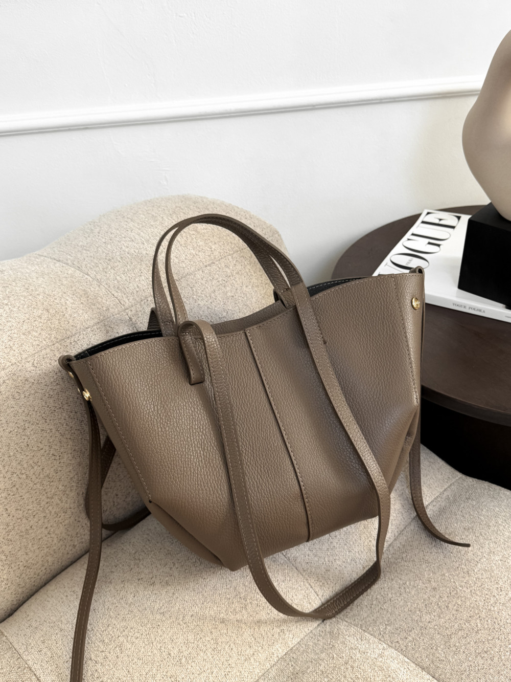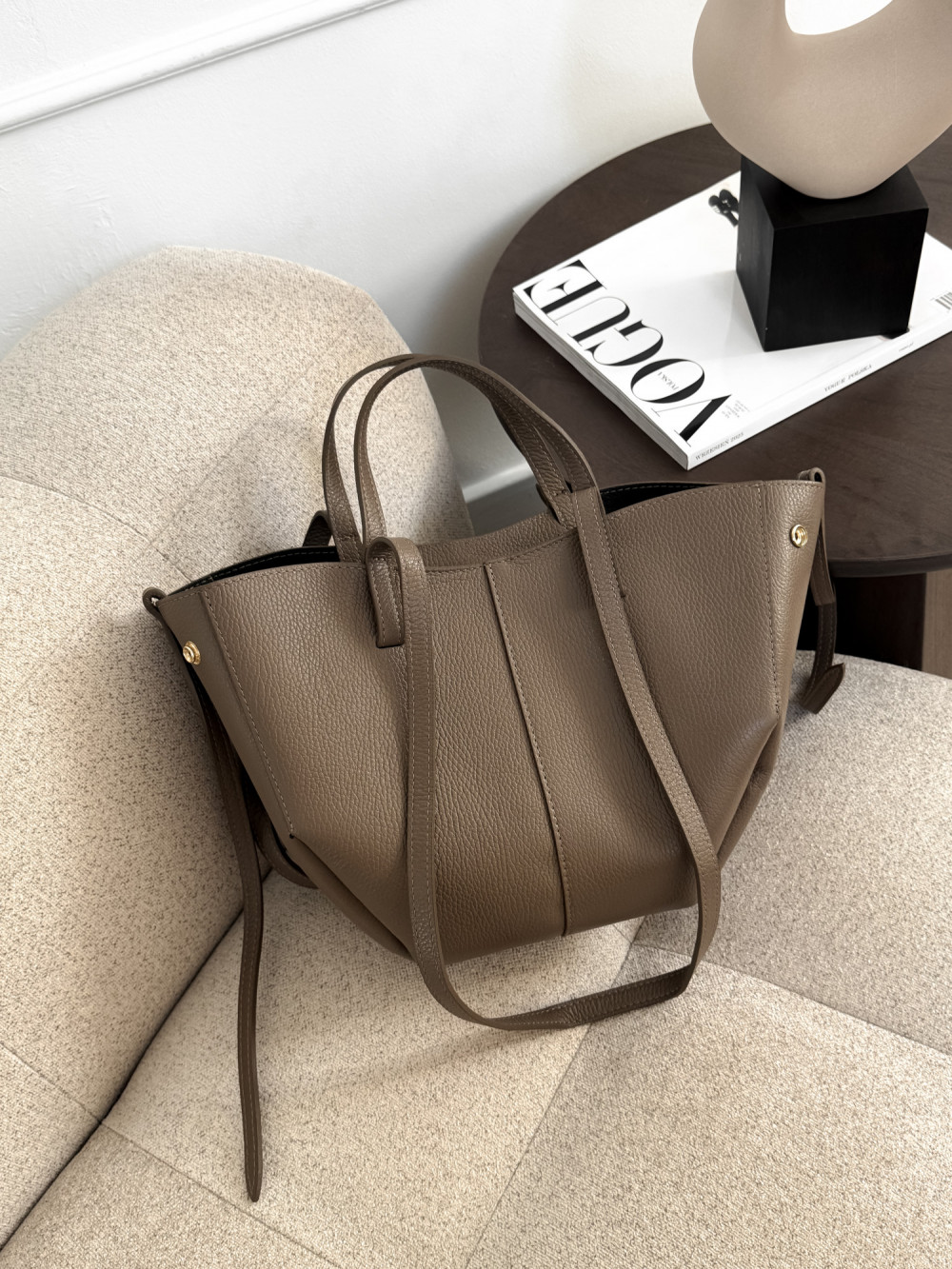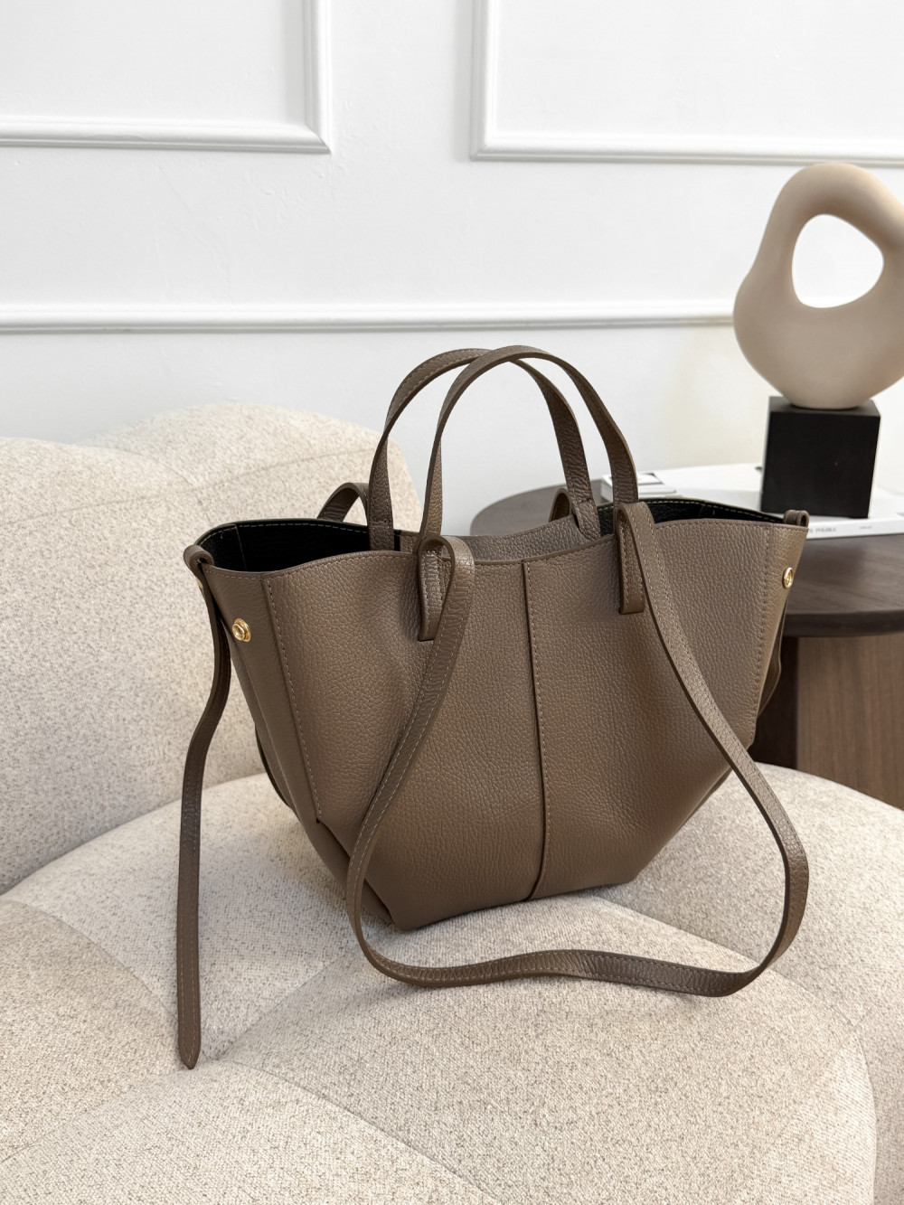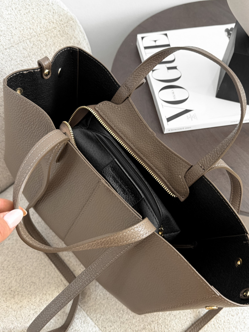 Torebka SOLENE z naturalnej skóry w kolorze taupe to elegancki i funkcjonalny model, który łączy luksusowy materiał z przemyślanym designem. Dzięki zatrzaskom na bokach można ją rozpiąć i powiększyć, a długie i krótkie rączki zapewniają wygodę noszenia na różne sposoby. W środku znajduje się dodatkowa kosmetyczka, która ułatwia organizację drobiazgów. Uniwersalny odcień taupe nadaje torebce subtelnego, wyrafinowanego charakteru, dzięki czemu SOLENE sprawdzi się zarówno w codziennych, jak i bardziej eleganckich stylizacjach.