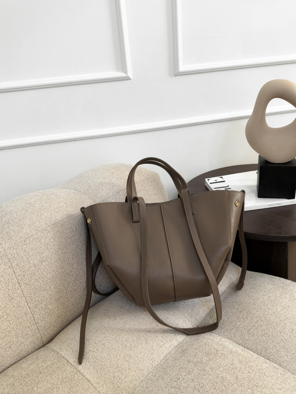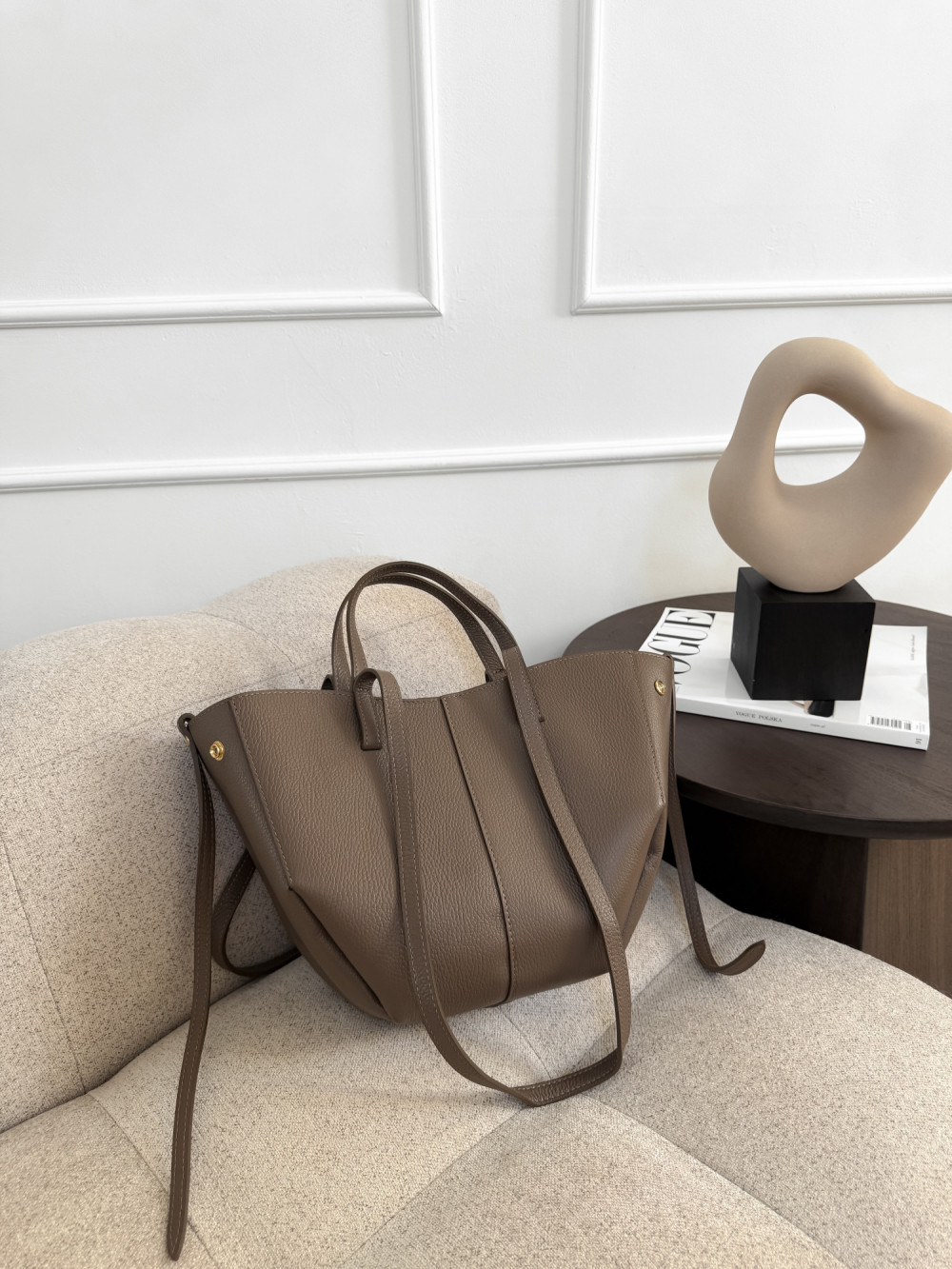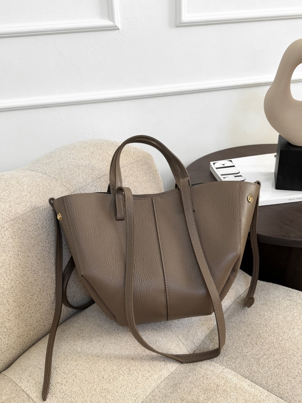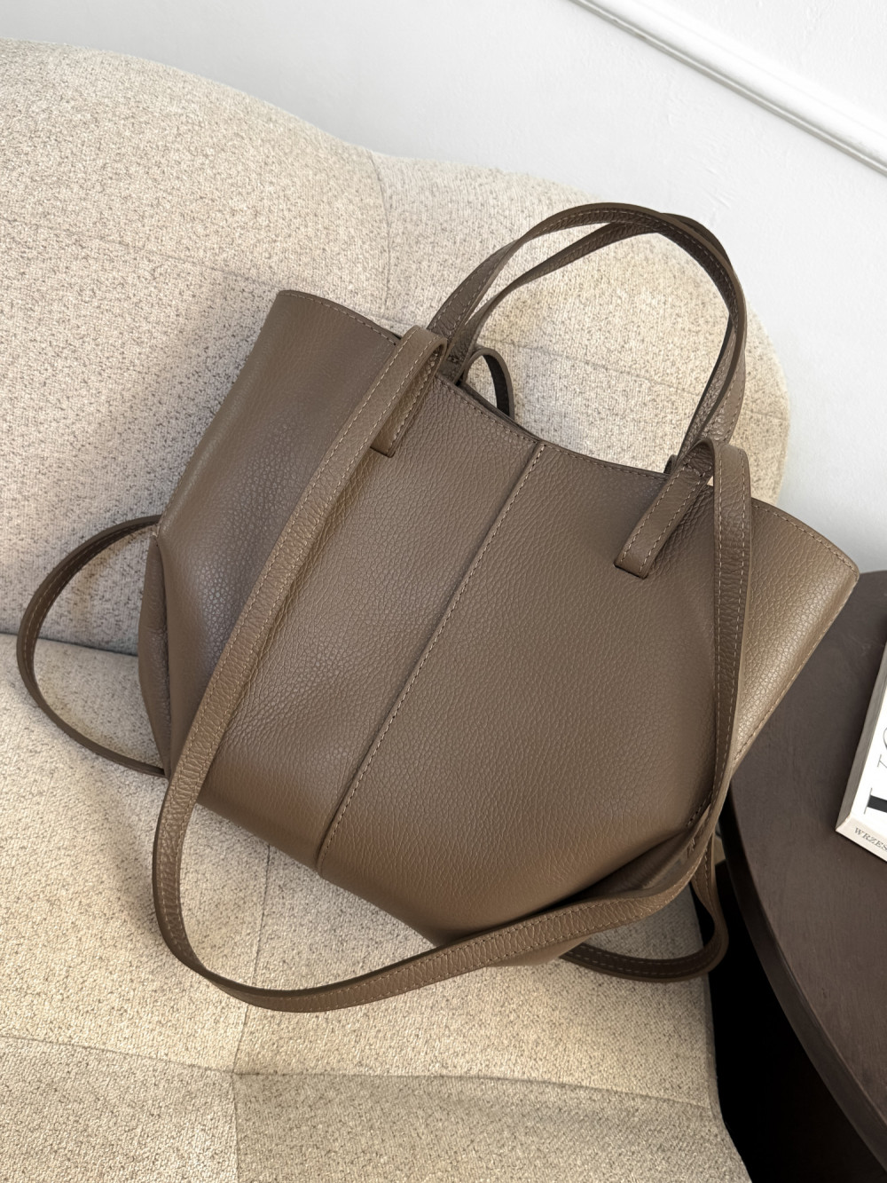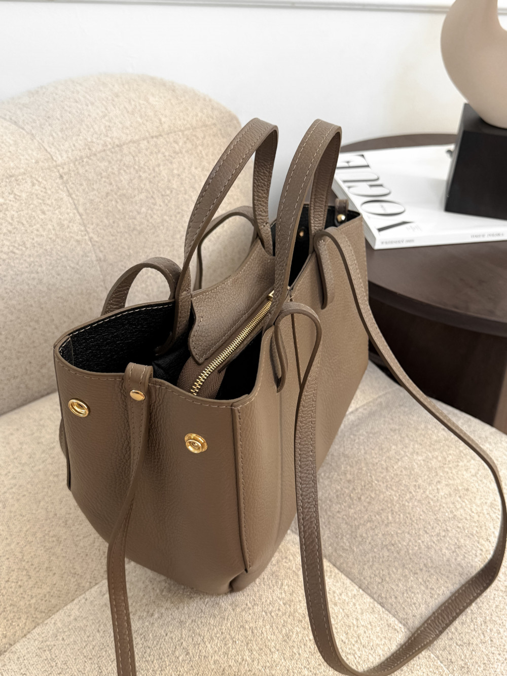 Torebka SOLENE z naturalnej skóry w kolorze taupe to elegancki i funkcjonalny model, który łączy luksusowy materiał z przemyślanym designem. Dzięki zatrzaskom na bokach można ją rozpiąć i powiększyć, a długie i krótkie rączki zapewniają wygodę noszenia na różne sposoby. W środku znajduje się dodatkowa kosmetyczka, która ułatwia organizację drobiazgów. Uniwersalny odcień taupe nadaje torebce subtelnego, wyrafinowanego charakteru, dzięki czemu SOLENE sprawdzi się zarówno w codziennych, jak i bardziej eleganckich stylizacjach.