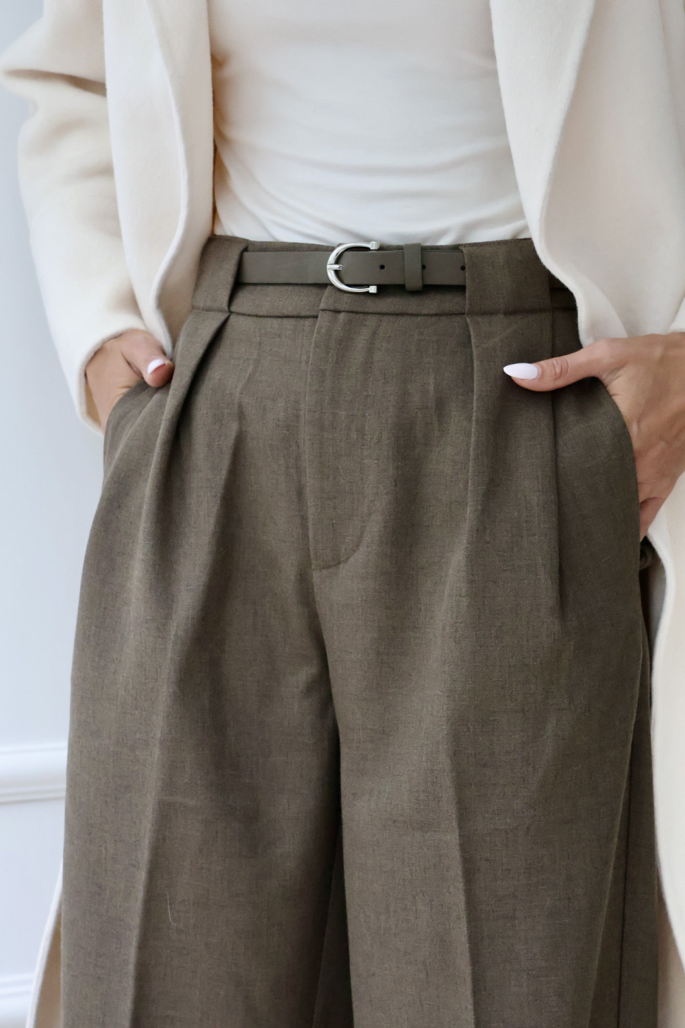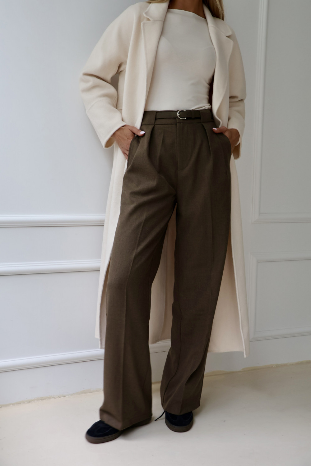 Spodnie rozszerzane z paskiem z wysokim stanem brąz CLARISE