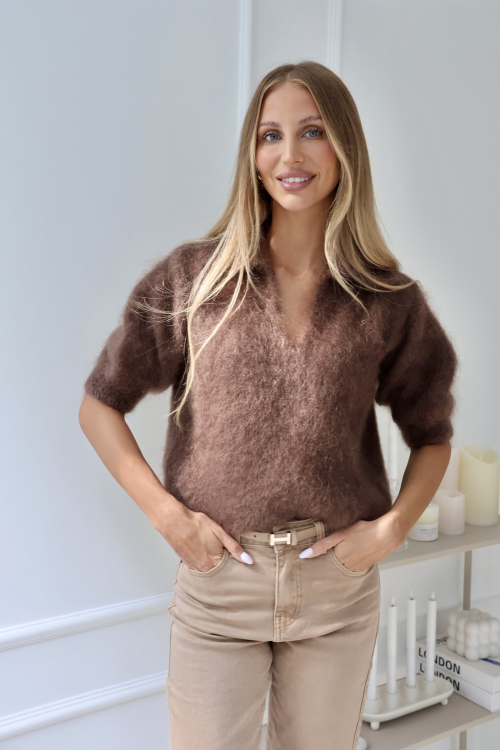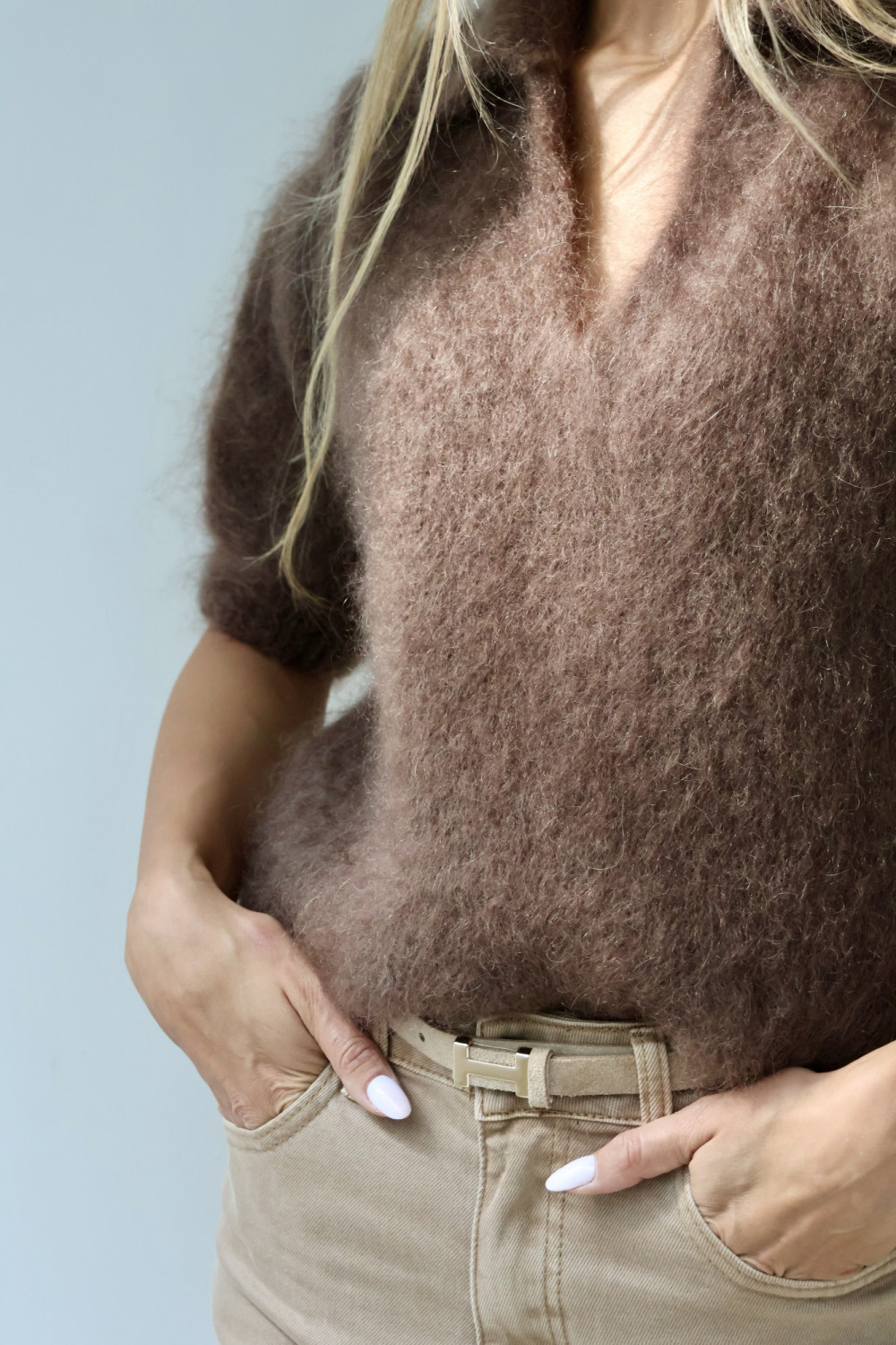 Sweter polo POLENE z kid moherem premium w czekoladzie to miękki, puszysty model, który wnosi luksus i ciepło do codziennych stylizacji. Kid moher premium otula delikatnością i lekkością, a dodatek poliamidu i elastanu zapewnia trwałość, wygodę i elastyczne dopasowanie. Klasyczny fason polo POLENE świetnie komponuje się zarówno z jeansami, jak i eleganckimi spodniami, tworząc stylizacje pełne szyku. Sweter polo z kid moherem premium POLENE to idealny wybór dla osób ceniących komfort i elegancki wygląd.