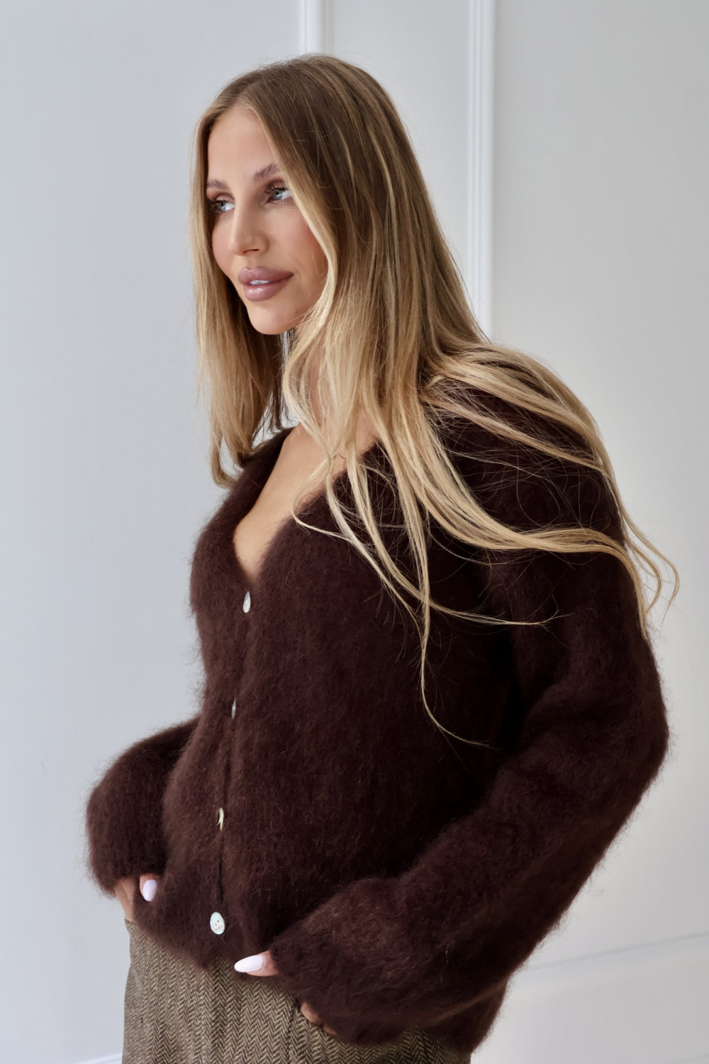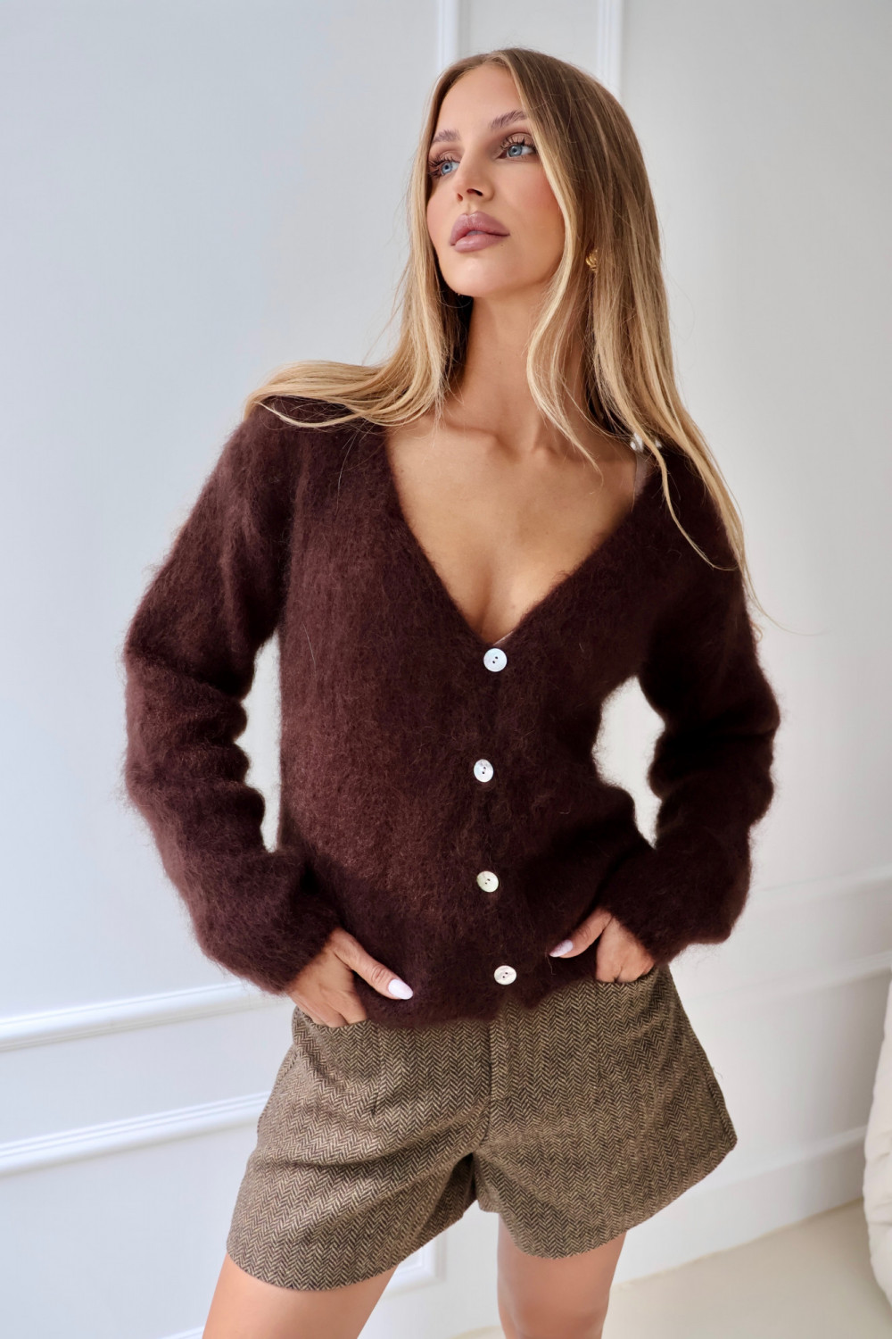 Kardigan 80% kid moher premium z dekoltem V czekolada ELWOOD
