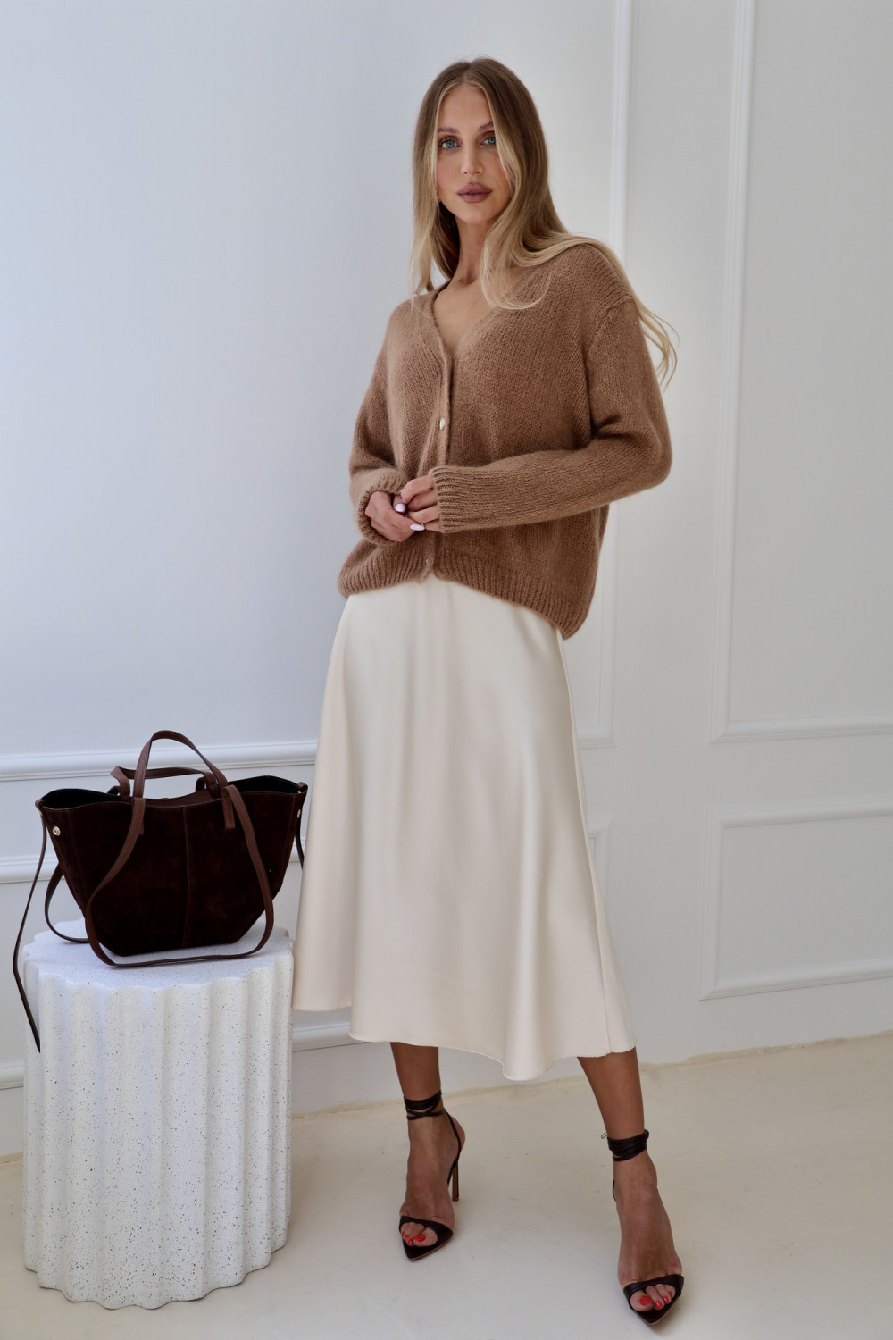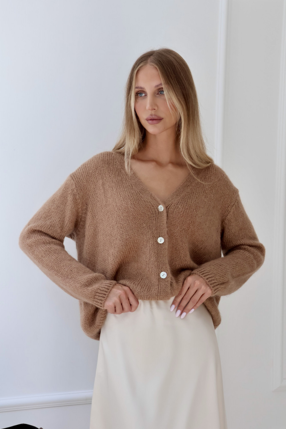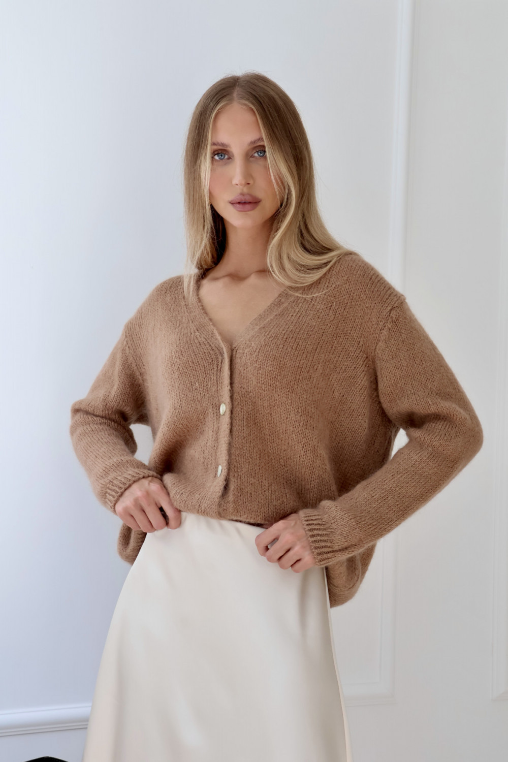 Kardigan TIVI z moherem w odcieniu camel to miękki, puszysty model, który dodaje ciepła i subtelnej elegancji codziennym stylizacjom. Delikatny moher otula przyjemnością w dotyku, a akryl z poliamidem zapewniają trwałość, komfort noszenia i elastyczne dopasowanie. Camelowy kolor nadaje kardiganowi uniwersalnego charakteru, dzięki czemu świetnie komponuje się zarówno z jeansami, jak i spódnicą. Kardigan TIVI to idealny wybór dla osób ceniących wygodę, miękkość materiału i modny wygląd.