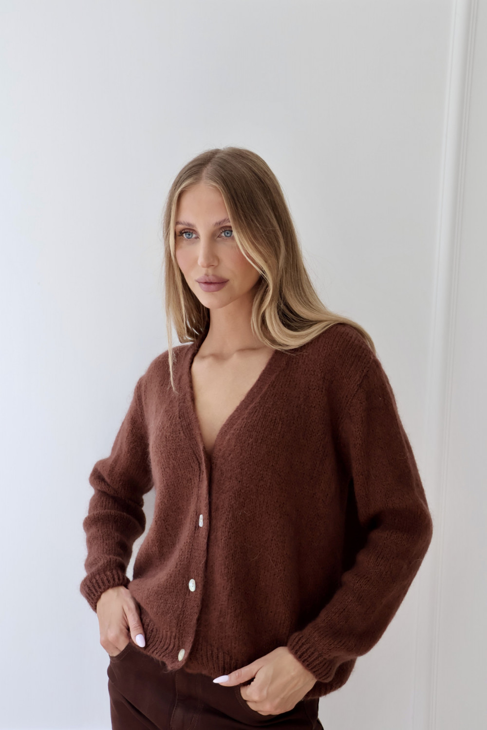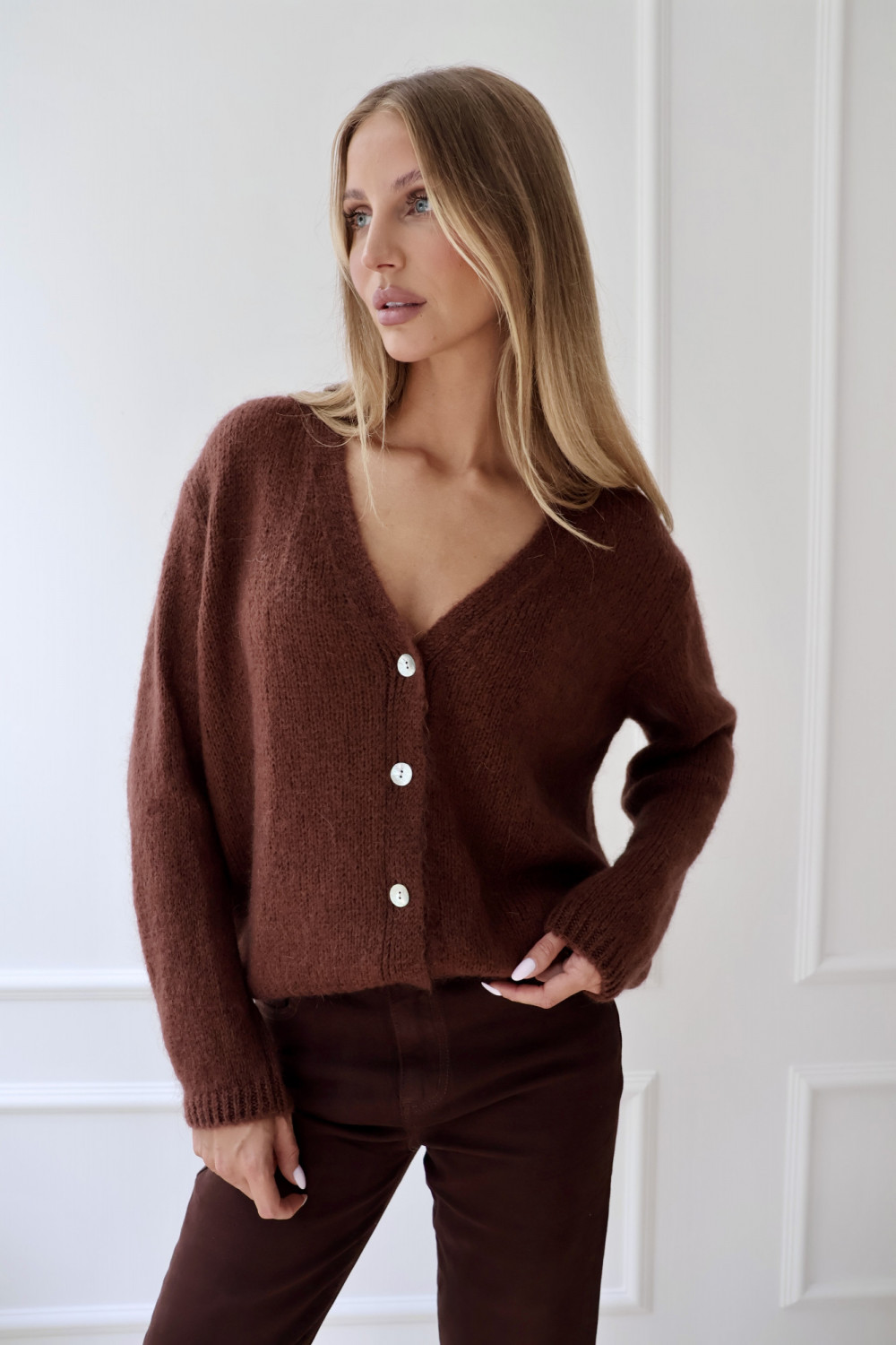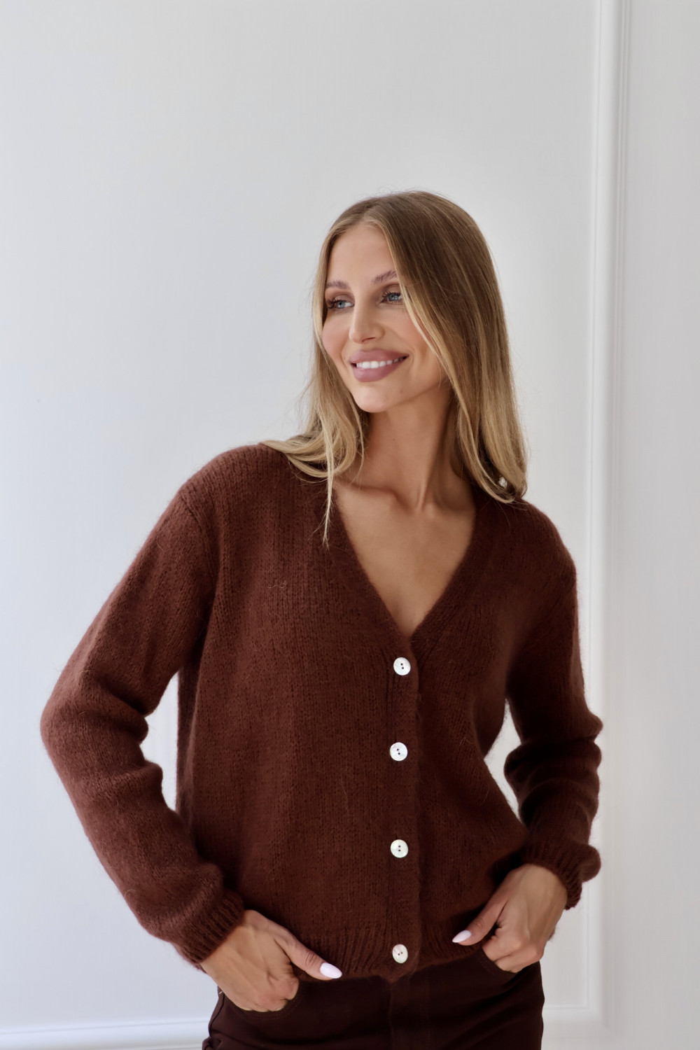 Kardigan TIVI z moherem w brązie to miękki, puszysty model, który zapewnia ciepło i subtelną elegancję codziennym stylizacjom. Delikatny moher otula przyjemnym dotykiem, a akryl z poliamidem gwarantują trwałość, komfort noszenia i elastyczne dopasowanie. Brązowy kolor nadaje kardiganowi uniwersalnego charakteru, dzięki czemu świetnie komponuje się zarówno z jeansami, jak i spódnicą. Kardigan TIVI to idealny wybór dla osób ceniących wygodę, miękkość materiału i modny wygląd.