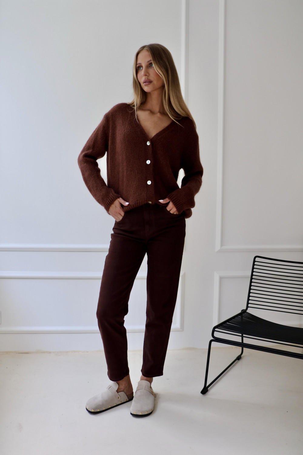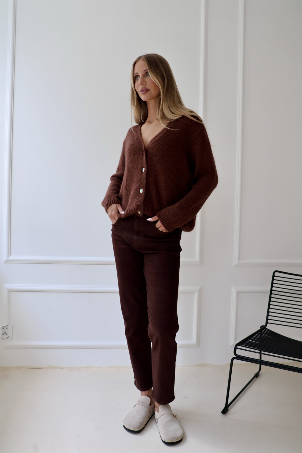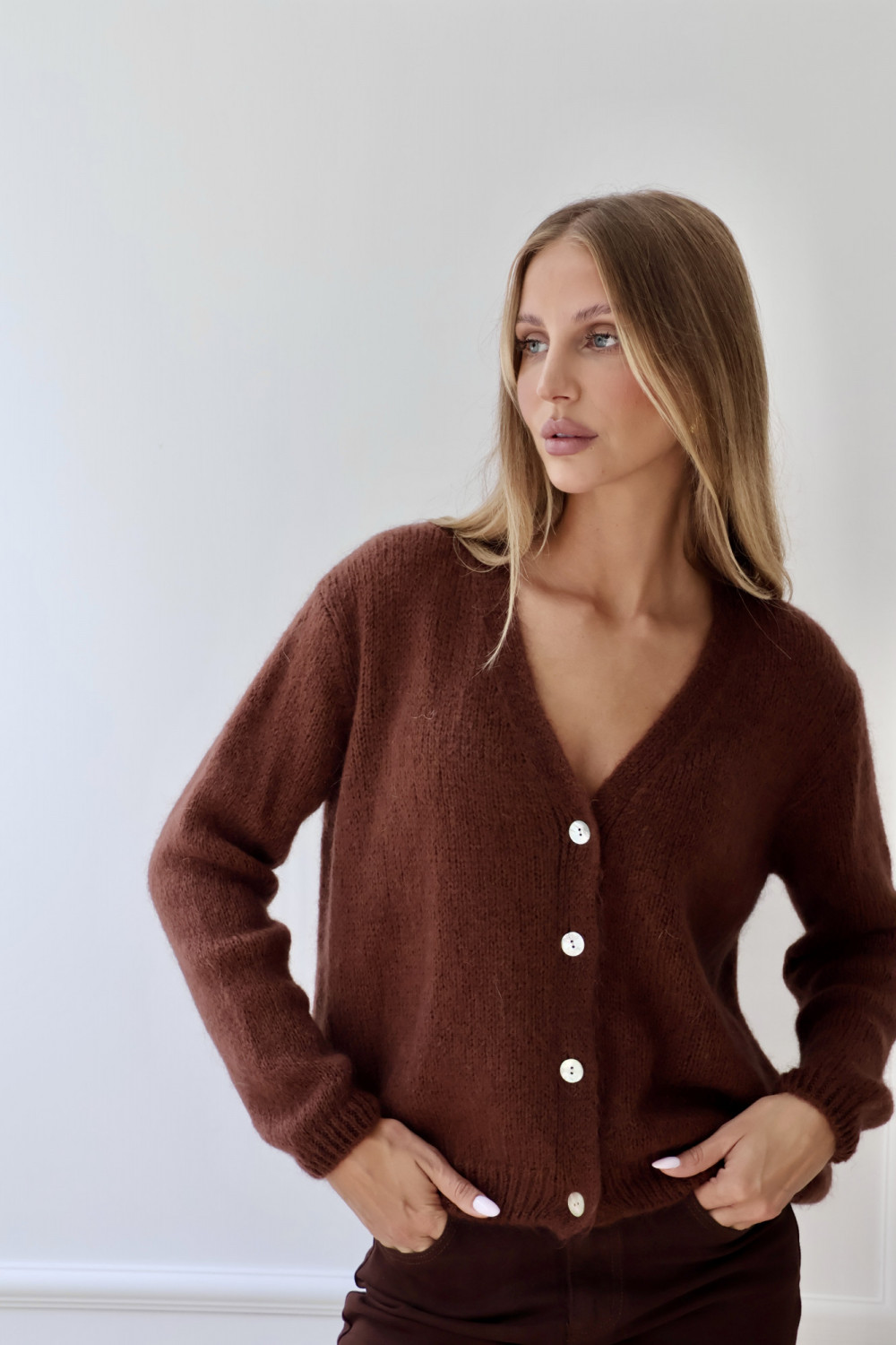 Kardigan TIVI z moherem w brązie to miękki, puszysty model, który zapewnia ciepło i subtelną elegancję codziennym stylizacjom. Delikatny moher otula przyjemnym dotykiem, a akryl z poliamidem gwarantują trwałość, komfort noszenia i elastyczne dopasowanie. Brązowy kolor nadaje kardiganowi uniwersalnego charakteru, dzięki czemu świetnie komponuje się zarówno z jeansami, jak i spódnicą. Kardigan TIVI to idealny wybór dla osób ceniących wygodę, miękkość materiału i modny wygląd.
