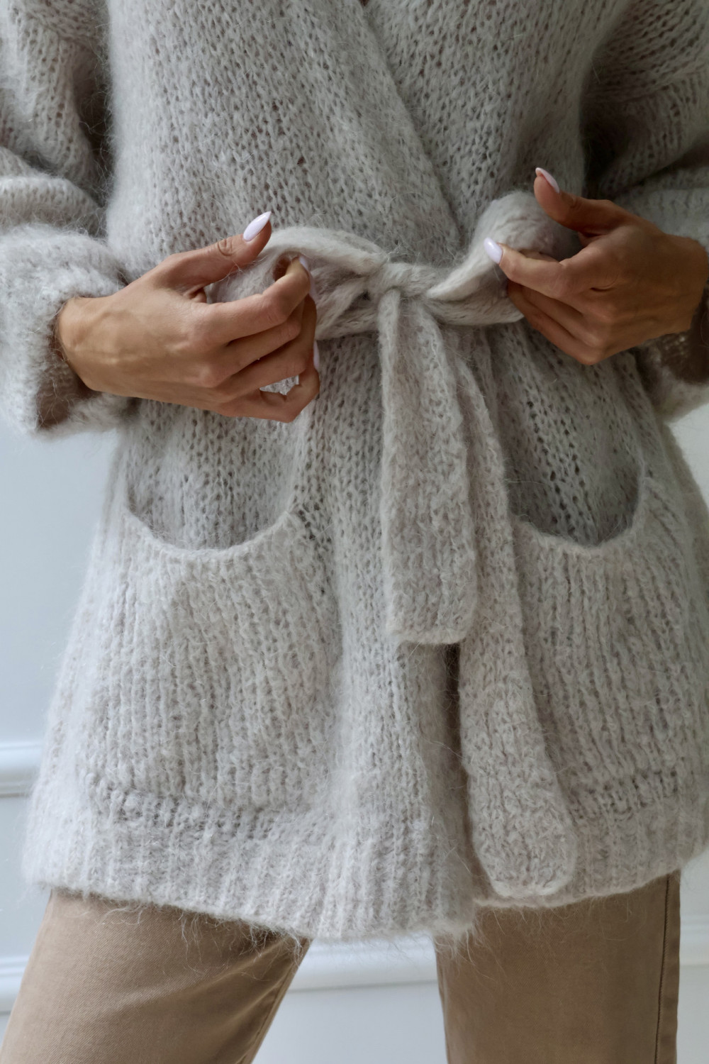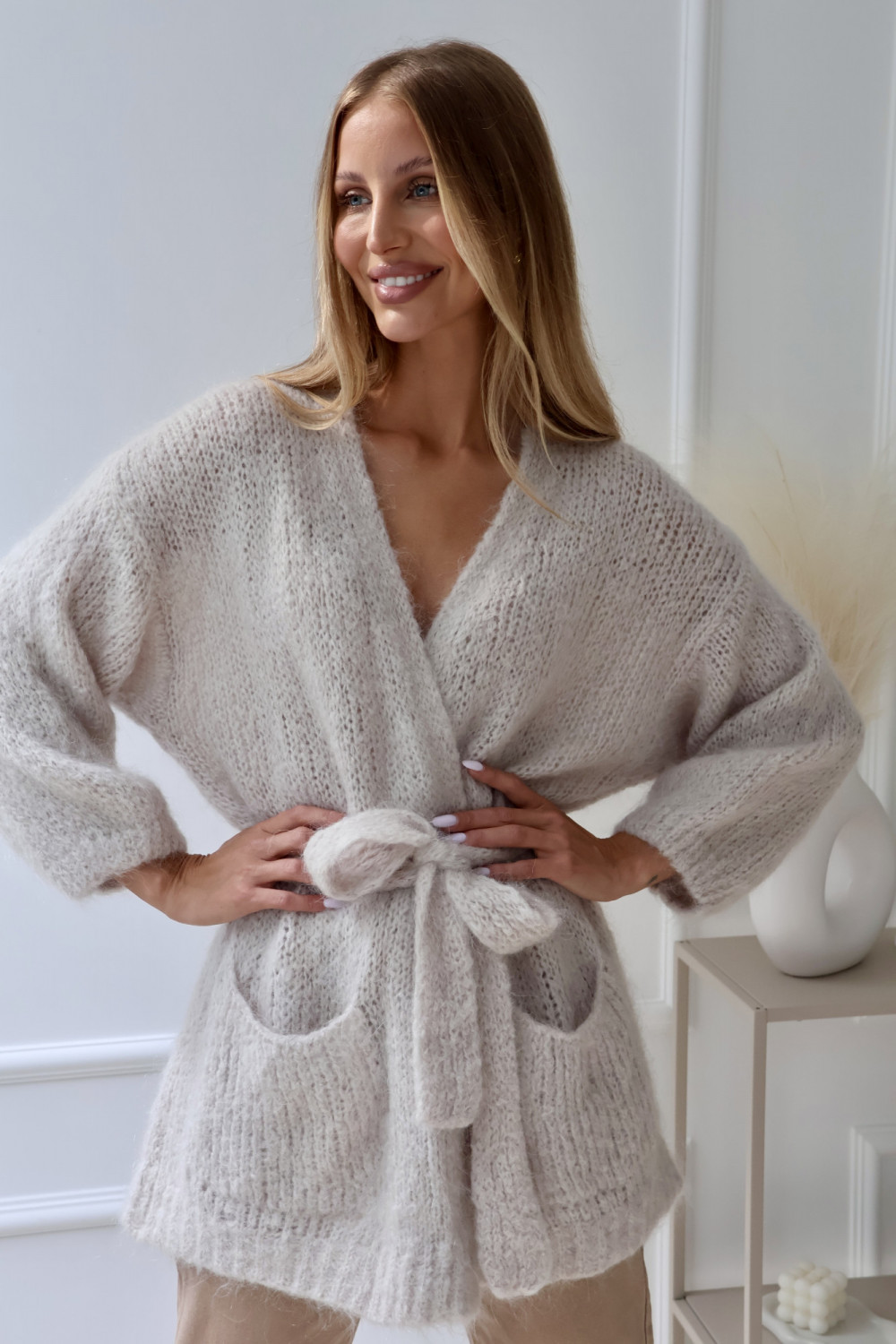 Kardigan VELY z moherem wiązany w jasnym beżu to miękki, puszysty model o lekko wydłużonym fasonie, który pięknie otula sylwetkę. Delikatny moher zapewnia ciepło i przyjemny dotyk, a poliamid dodaje trwałości i komfortu noszenia. Jasny beż nadaje kardiganowi uniwersalnego charakteru, dzięki czemu świetnie komponuje się zarówno z jeansami, jak i spódnicą. Kardigan VELY łączy wygodę, elegancję i modny, lekko dłuższy krój, idealny na chłodniejsze dni.