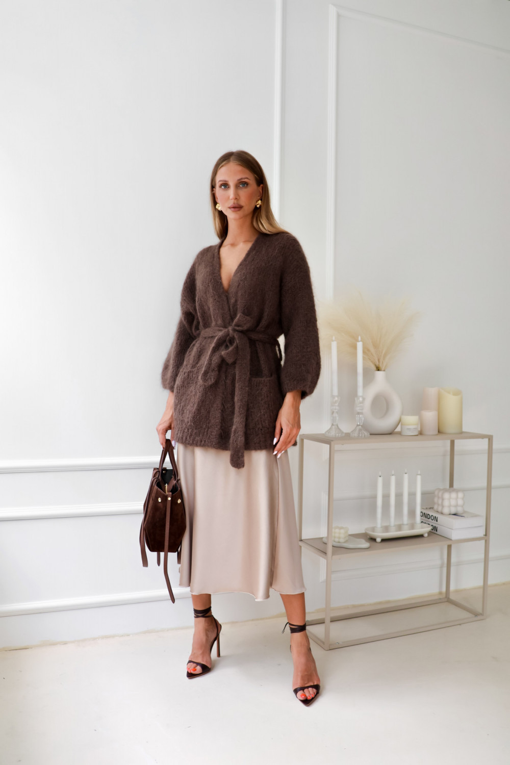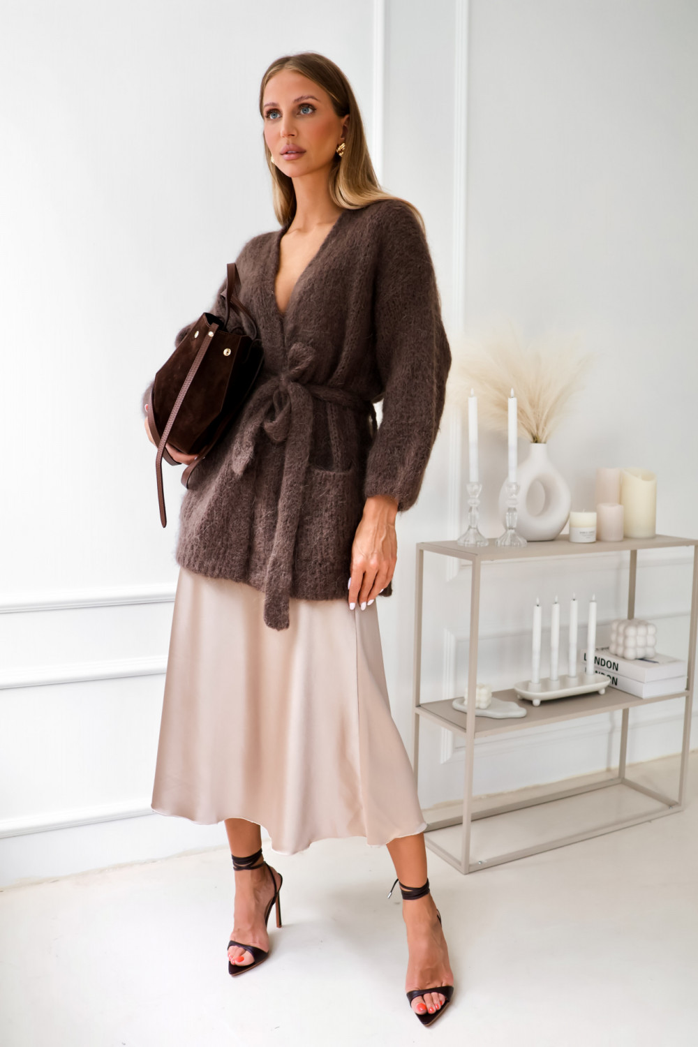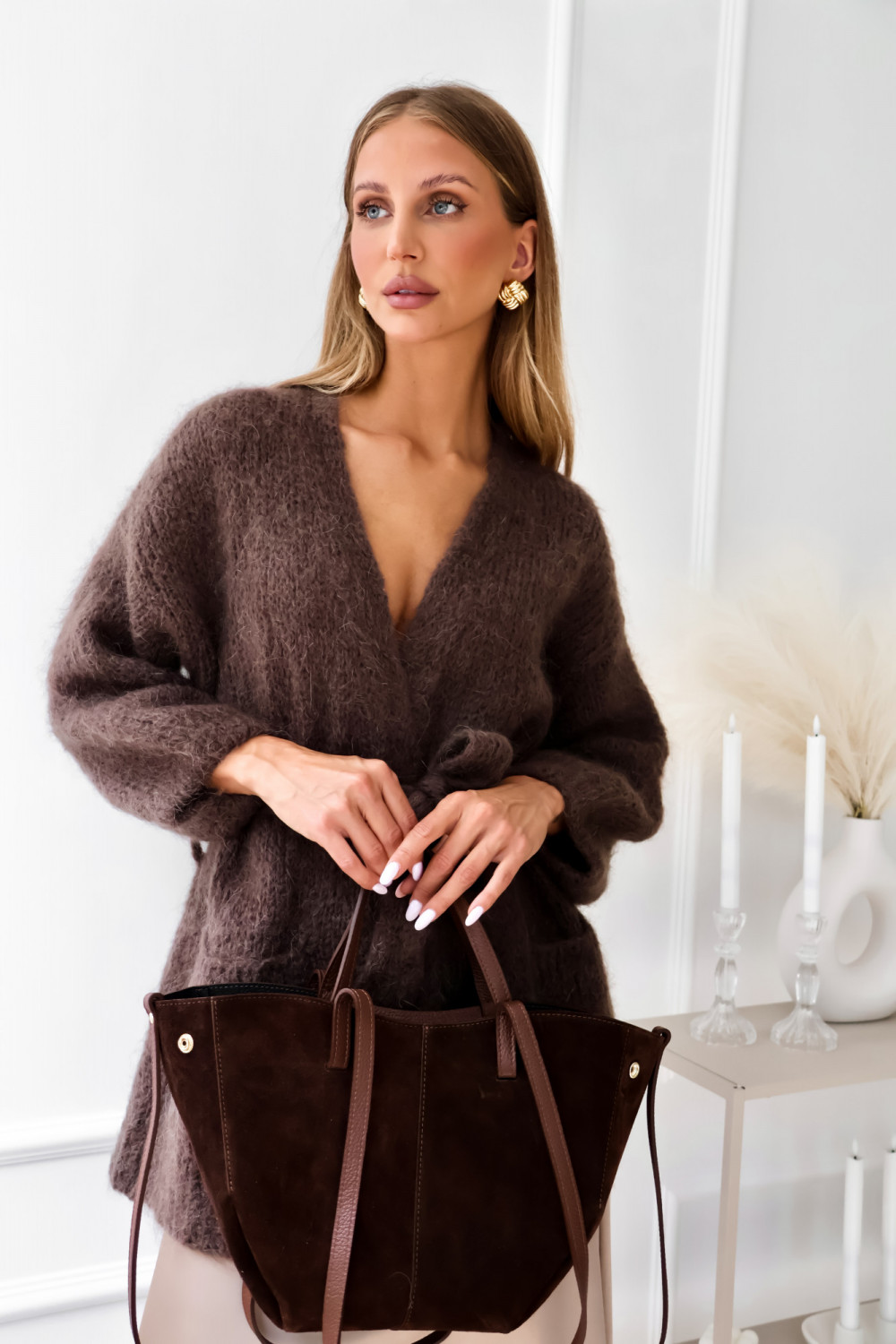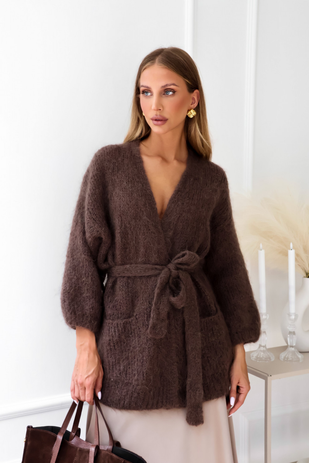Kardigan VELY z moherem wiązany w czekoladzie to miękki, puszysty model o lekko wydłużonym fasonie, który pięknie otula sylwetkę. Delikatny moher zapewnia ciepło i przyjemny dotyk, a poliamid dodaje trwałości i komfortu noszenia. Czekoladowy kolor nadaje kardiganowi eleganckiego, uniwersalnego charakteru, dzięki czemu świetnie komponuje się zarówno z jeansami, jak i spódnicą. Kardigan VELY łączy wygodę, styl i modny, lekko dłuższy krój, idealny na chłodniejsze dni.