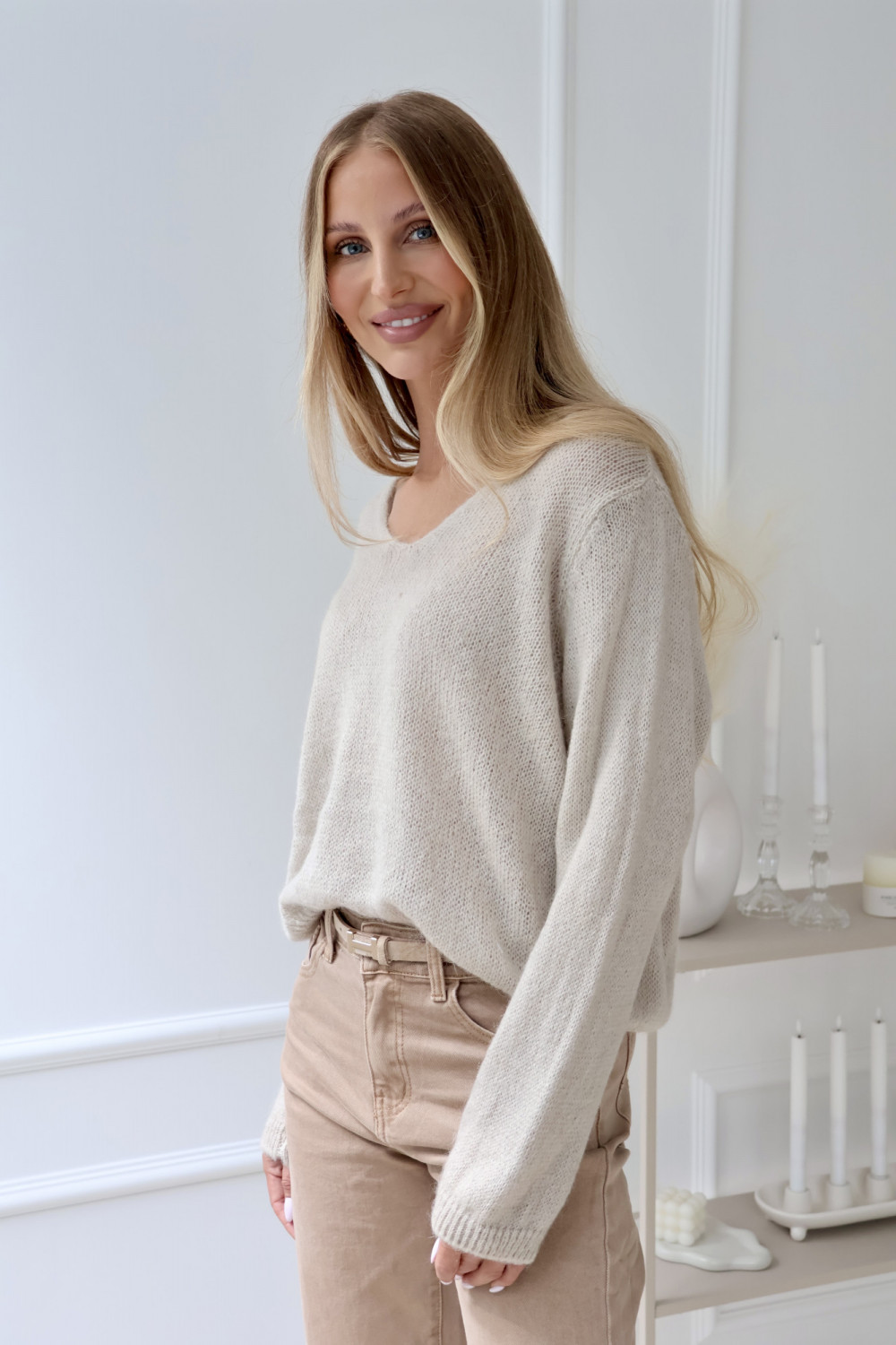 Sweter z moherem z dekoltem V jasny beż ANGELO