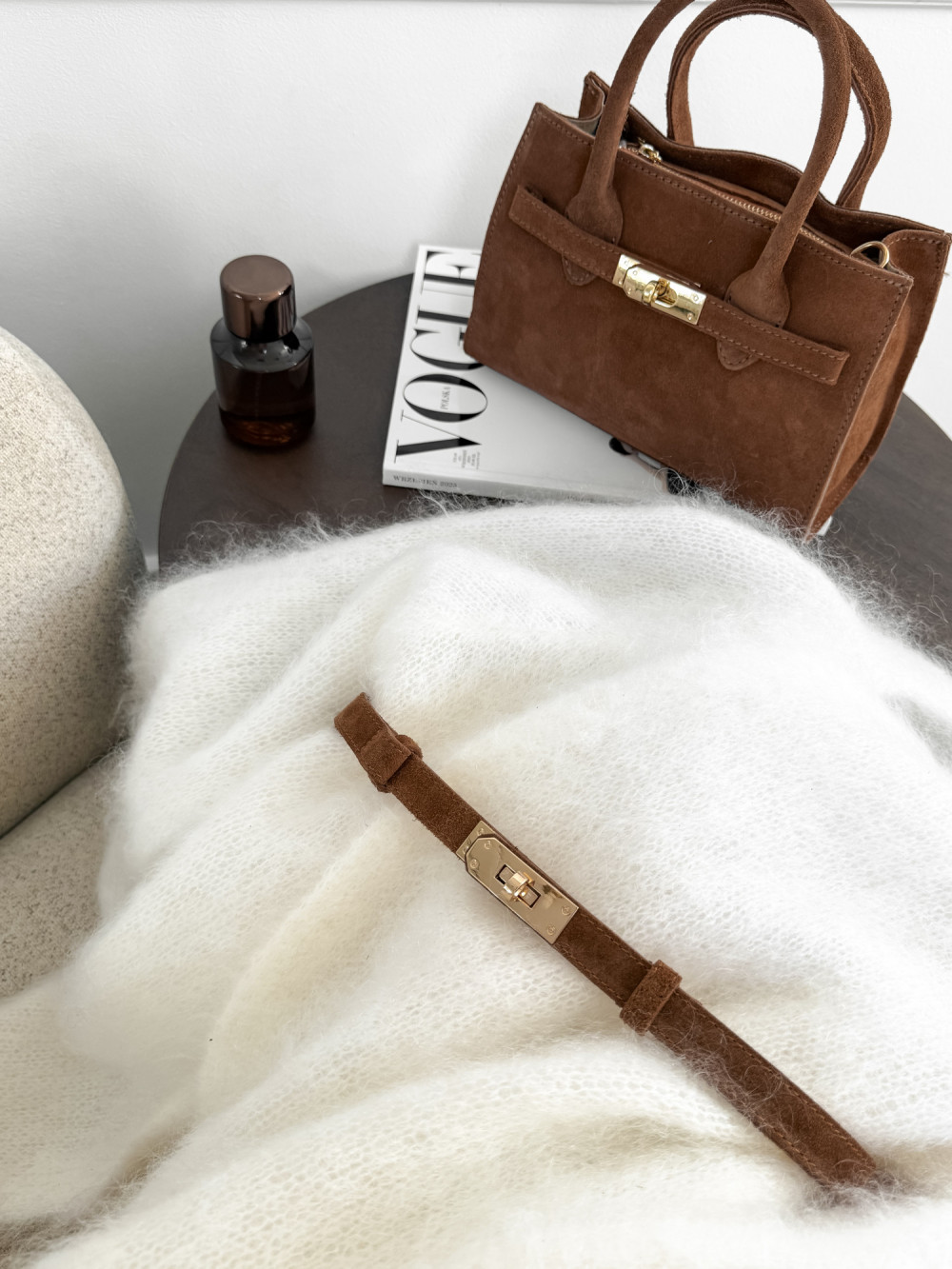 Pasek HERME z naturalnej skóry zamszowej w cynamonowym odcieniu to elegancki dodatek, który podkreśla charakter każdej stylizacji. Miękka skóra zamszowa zachwyca przyjemną fakturą i trwałością, a złote zapięcie dodaje luksusowego, efektownego akcentu. Pasek jest regulowany, dzięki czemu pasuje na obwód od 55 do 94 cm, co czyni go bardzo uniwersalnym. Doskonale komponuje się zarówno z eleganckimi spodniami, jak i casualowymi zestawami, wnosząc wyrafinowany detal do codziennego looku. Pasek HERME to ponadczasowy dodatek, łączący wygodę z modnym wykończeniem.