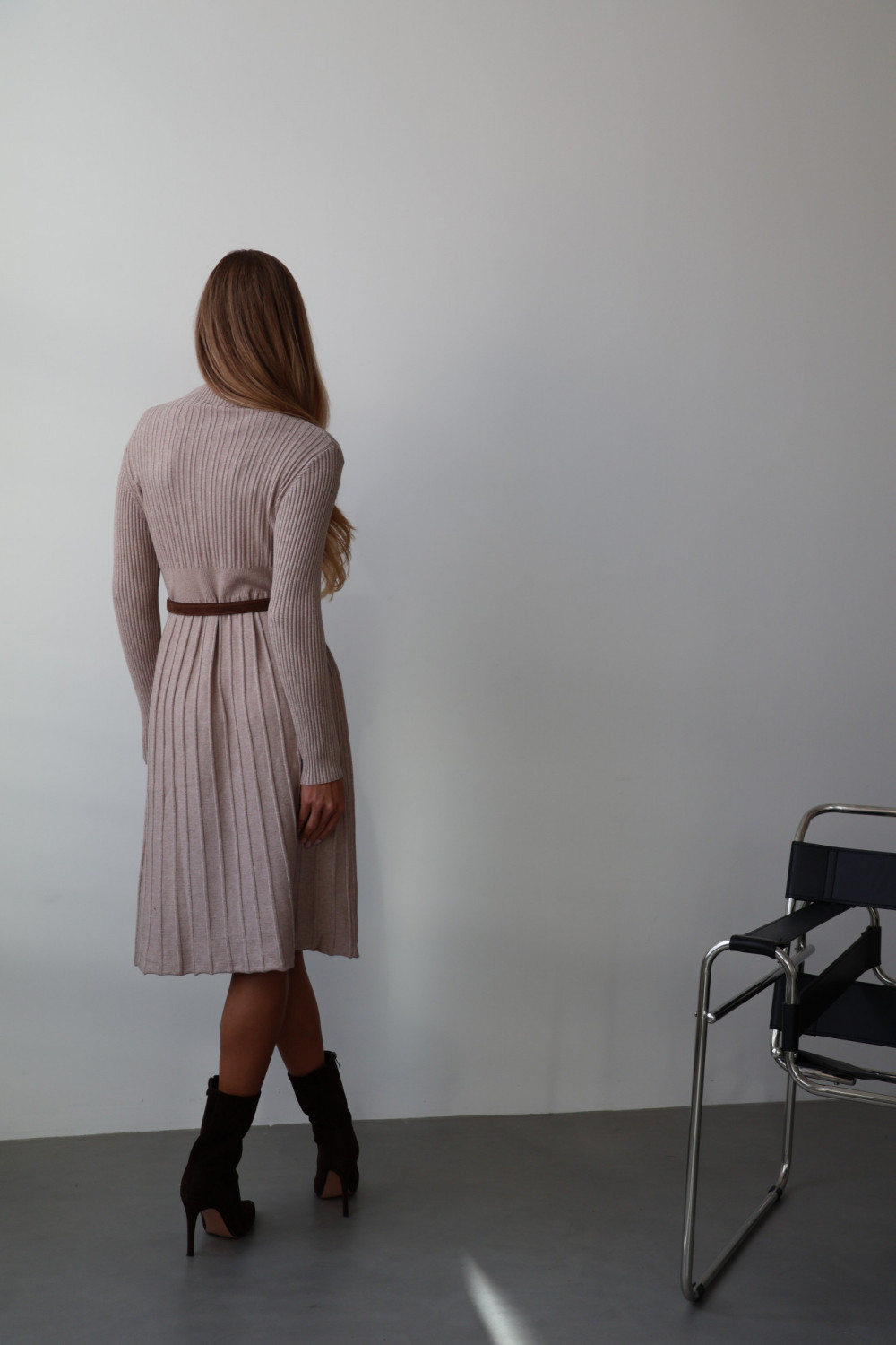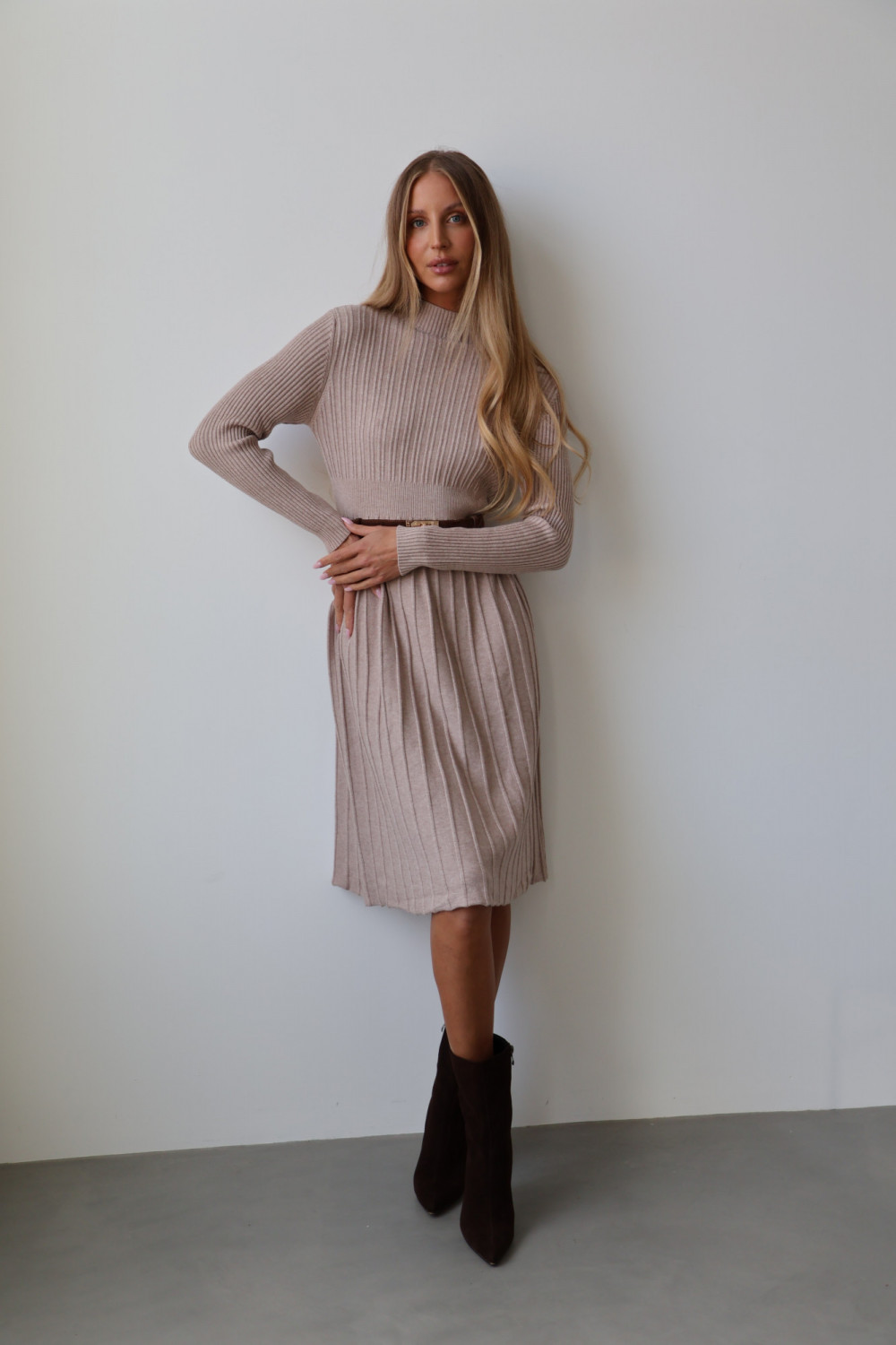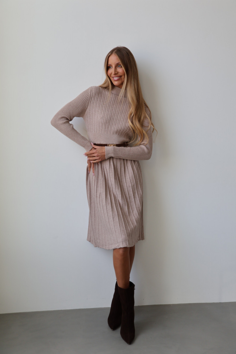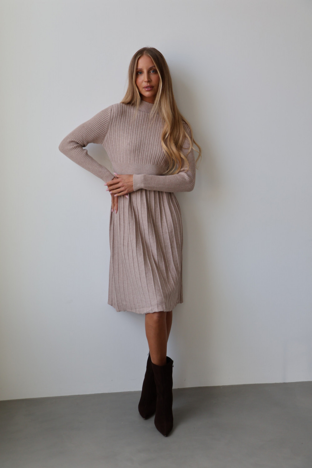 Sukienka CHARLOTTE w odcieniu beż to połączenie subtelnej elegancji i ponadczasowego stylu. Wykonana z wysokiej jakości materiału, zachwyca delikatnym, plisowanym fasonem, który nadaje lekkości i ruchu przy każdym kroku. Długi krój sprawia, że sukienka jest idealna zarówno na wyjątkowe okazje, jak i eleganckie, codzienne stylizacje.