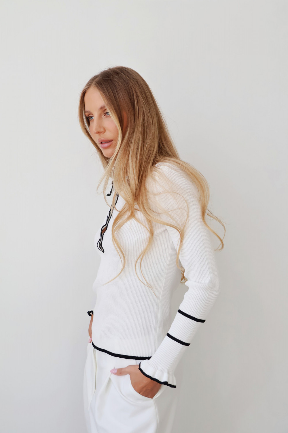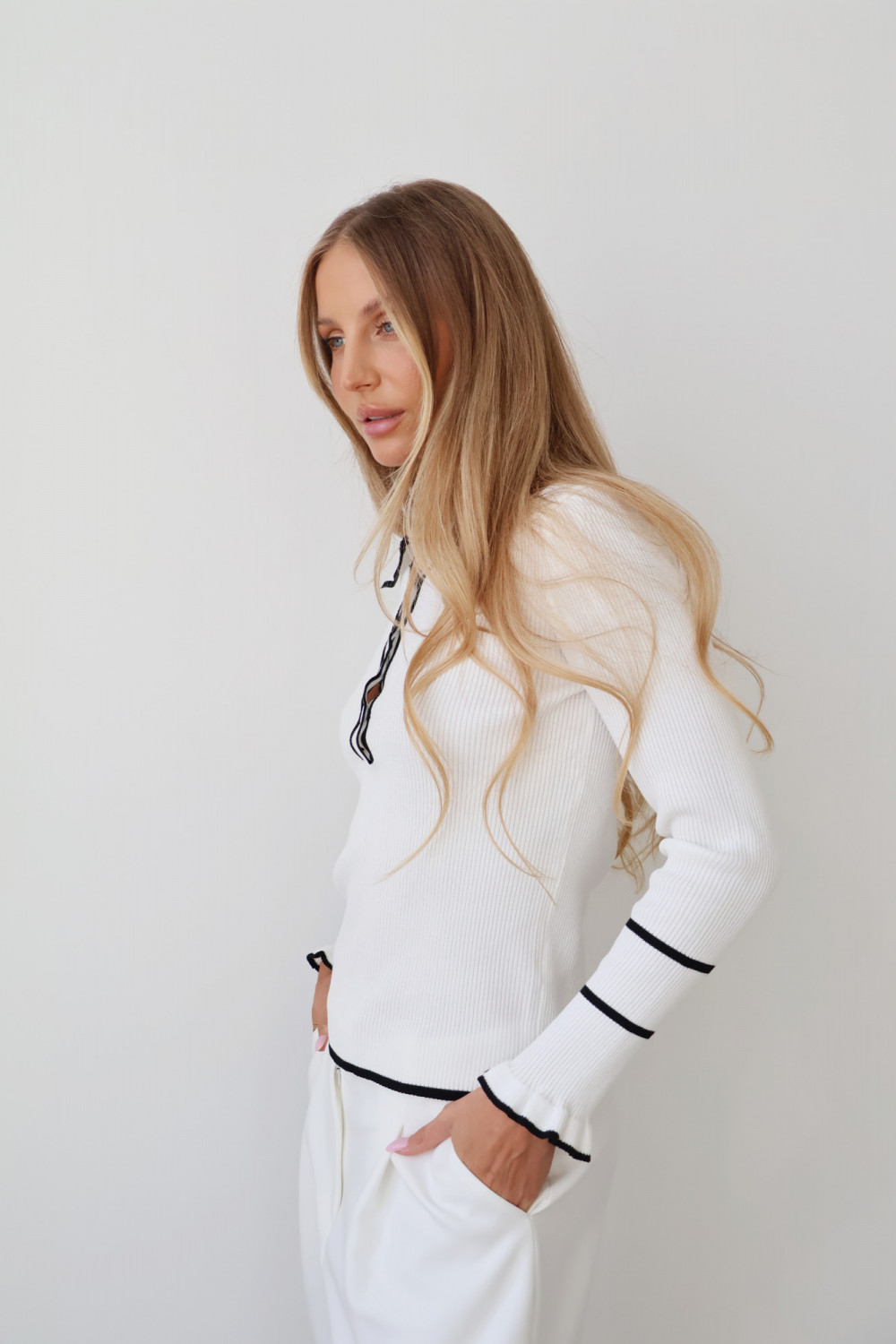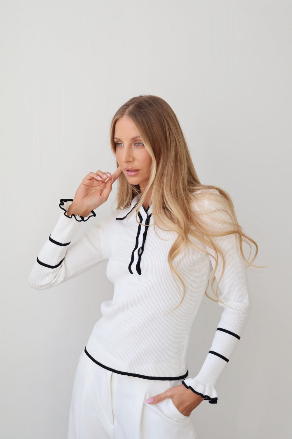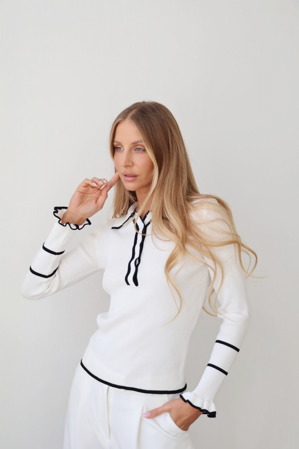 Sweter polo Piano w białym odcieniu z kontrastującą czarną wstawką wykonany jest w 100% z wiskozy, która nadaje mu lekkość, miękkość i subtelny połysk. Czarna wstawka delikatnie podkreśla linię dekoltu, wprowadzając elegancki kontrast i nowoczesny akcent. Materiał jest przyjemny dla skóry i naturalnie oddychający, a klasyczny fason polo sprawia, że sweter doskonale łączy codzienny komfort z wyrafinowanym stylem.