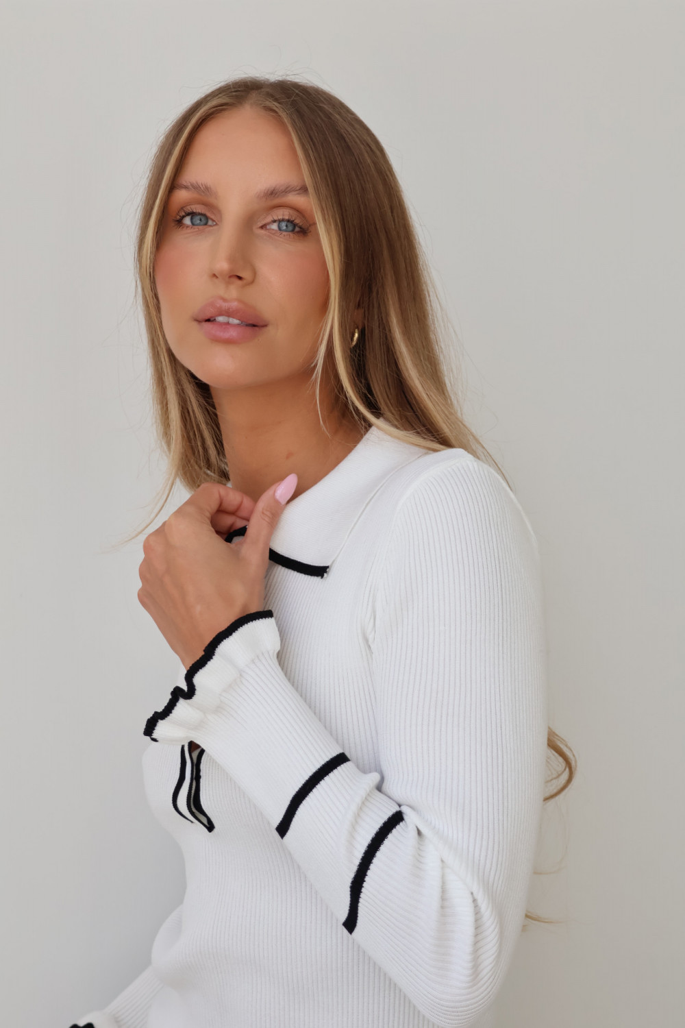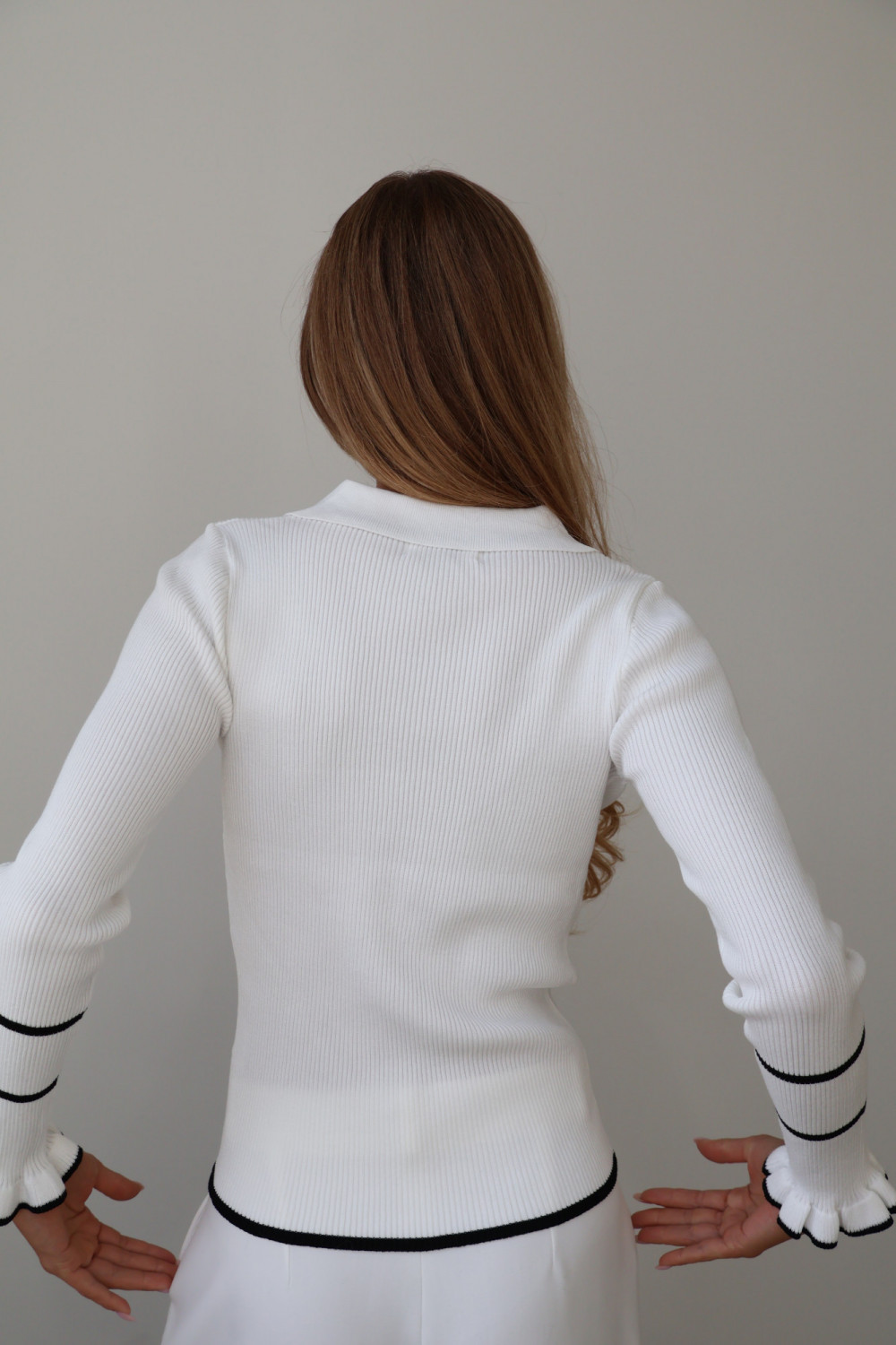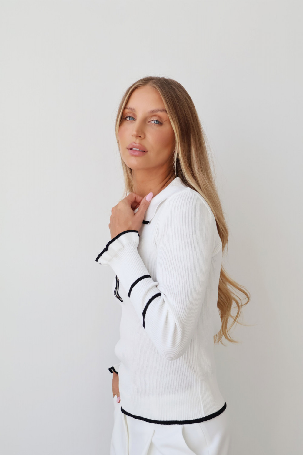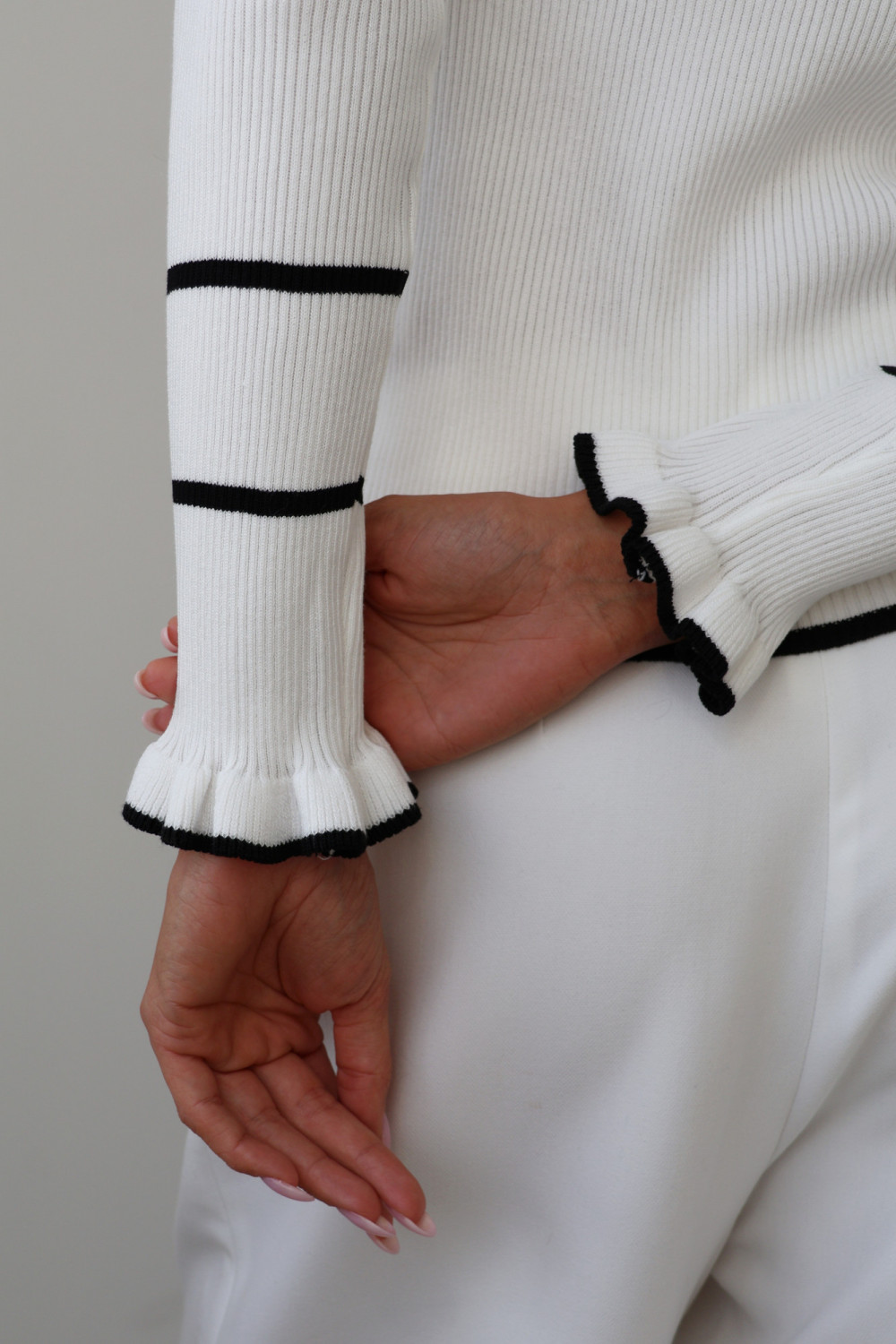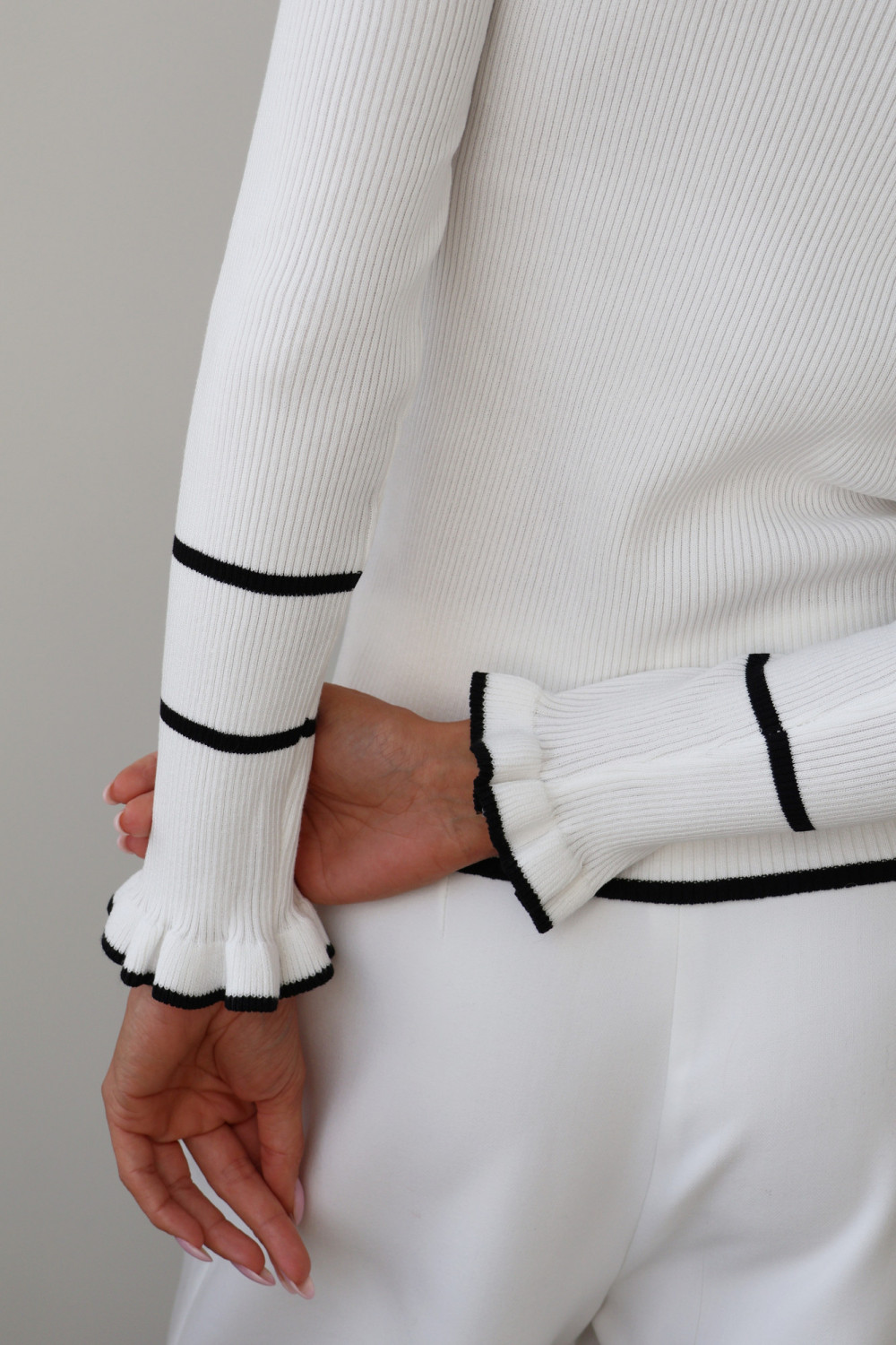 Sweter polo Piano w białym odcieniu z kontrastującą czarną wstawką wykonany jest w 100% z wiskozy, która nadaje mu lekkość, miękkość i subtelny połysk. Czarna wstawka delikatnie podkreśla linię dekoltu, wprowadzając elegancki kontrast i nowoczesny akcent. Materiał jest przyjemny dla skóry i naturalnie oddychający, a klasyczny fason polo sprawia, że sweter doskonale łączy codzienny komfort z wyrafinowanym stylem.