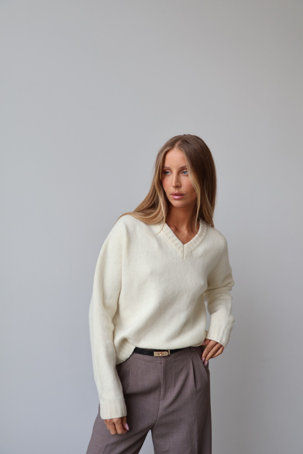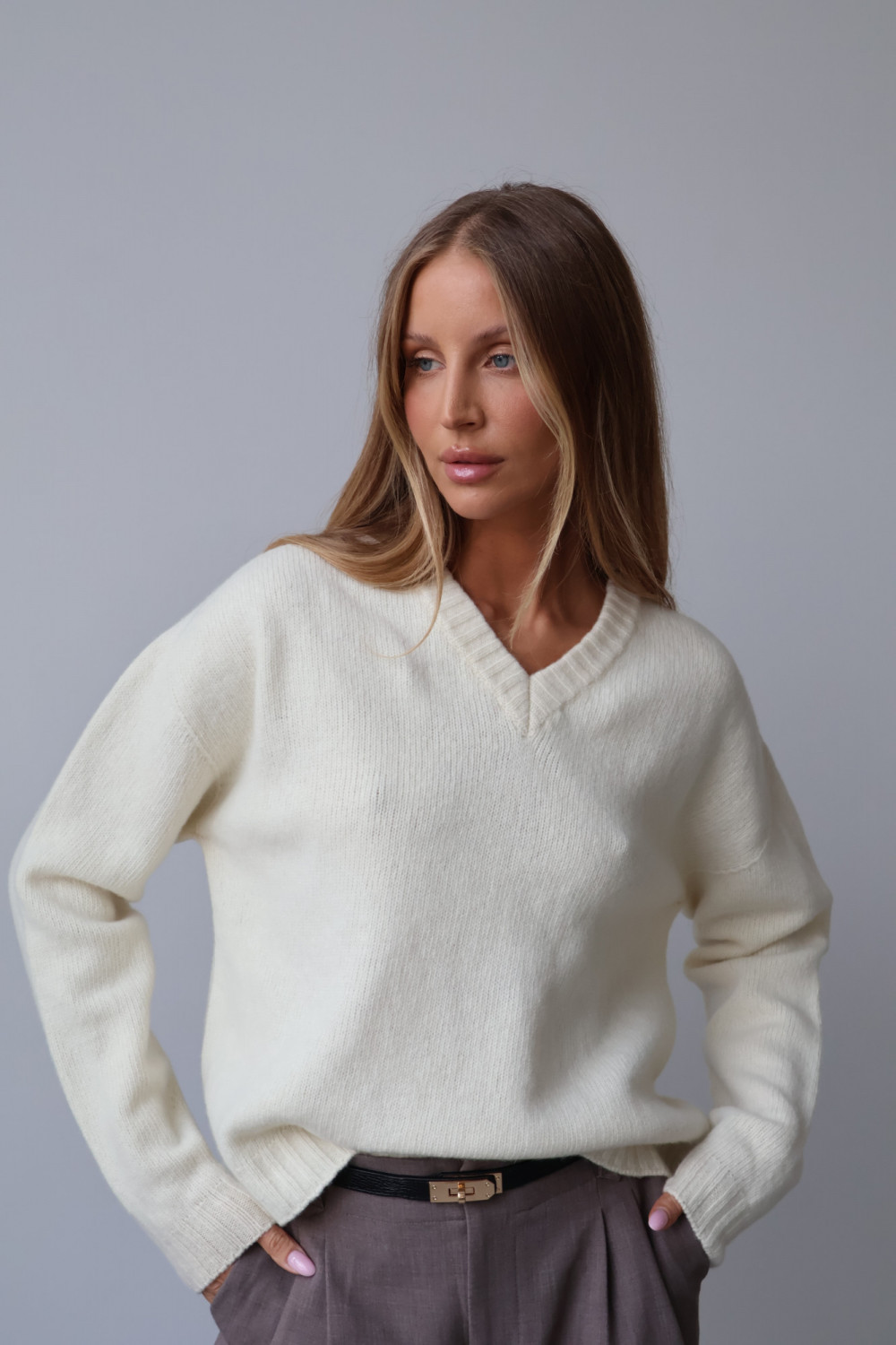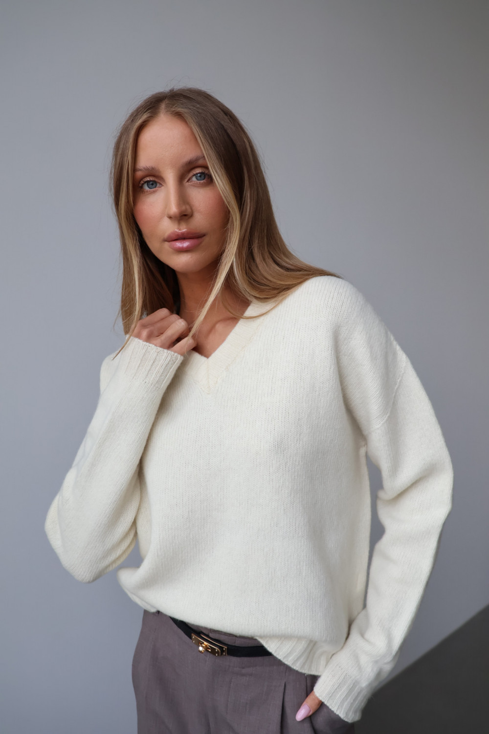 Sweter z dekoltem V 100% wełna merino premium śmietanka SELINE