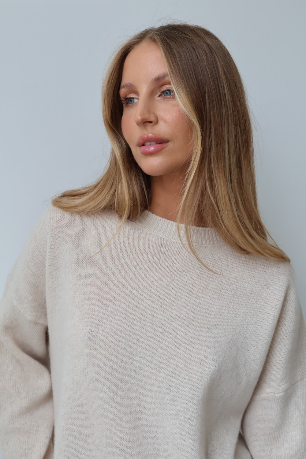 Sweter Merene w jasnym beżu wykonany jest w 100% z wełny merino premium, która zachwyca miękkością, lekkością i naturalnym ciepłem. Materiał jest przyjemny dla skóry, otula komfortem przez cały dzień, a klasyczny fason nadaje swetrowi subtelnej elegancji i ponadczasowego charakteru. Idealny wybór dla osób ceniących luksusowy komfort i wyrafinowany styl.