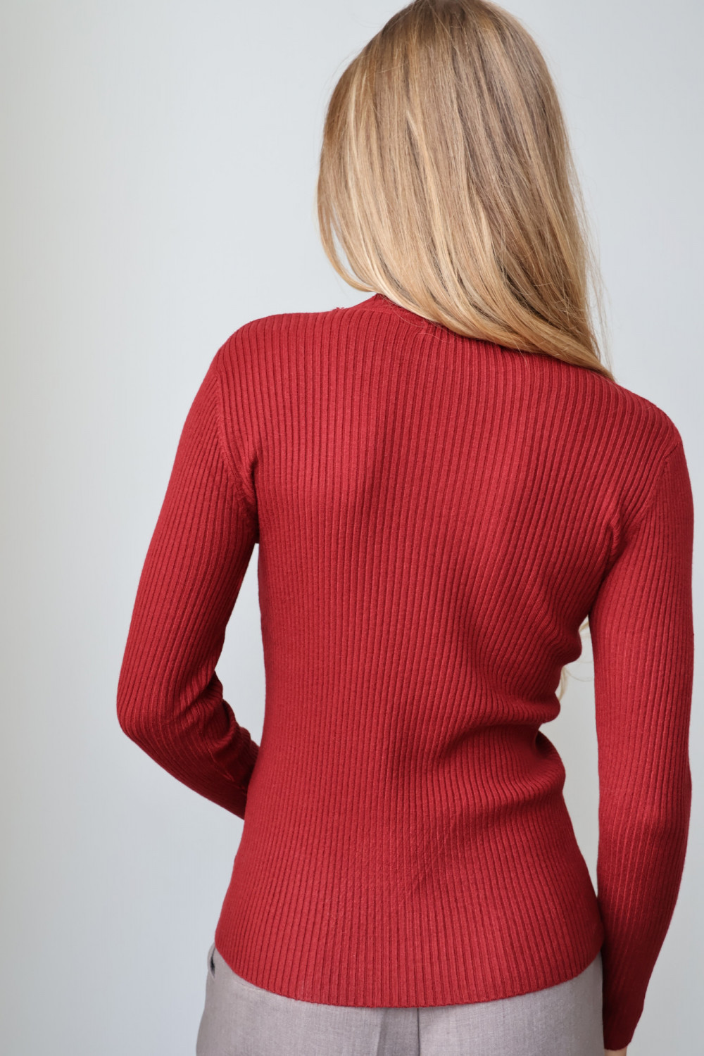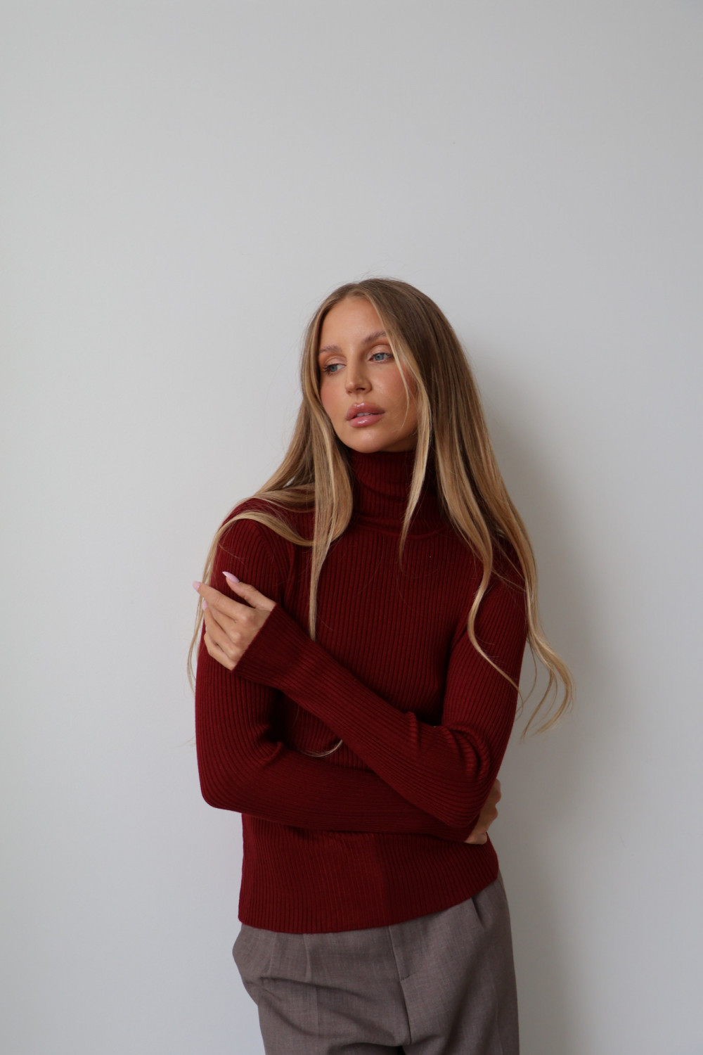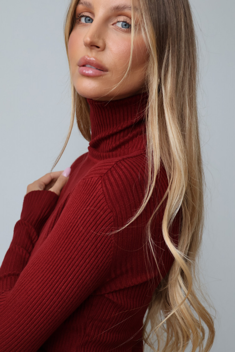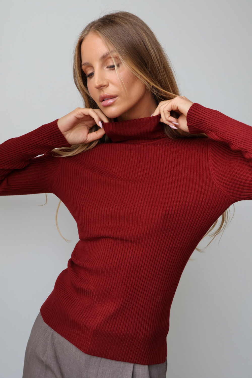 Prążkowana struktura nadaje golfowi subtelnej tekstury i modnego charakteru, a głęboki, bordowy kolor wprowadza wyrafinowanie i uniwersalność, dzięki czemu można go łatwo zestawić z różnymi elementami garderoby – zarówno w codziennych, jak i eleganckich stylizacjach.