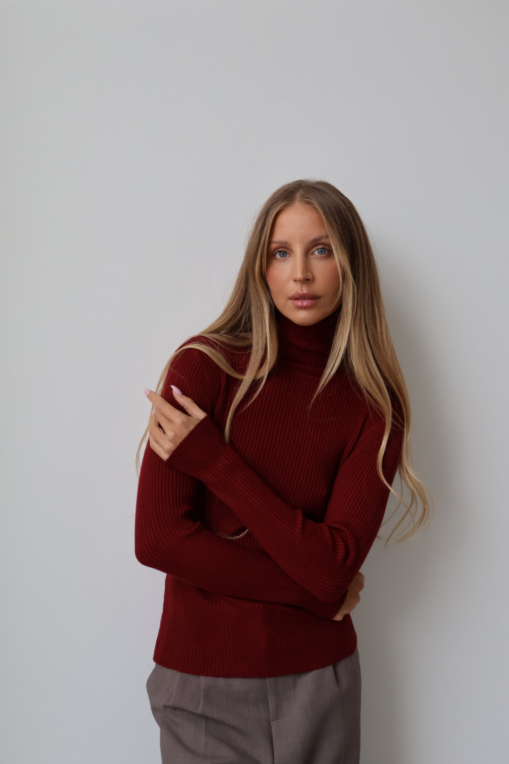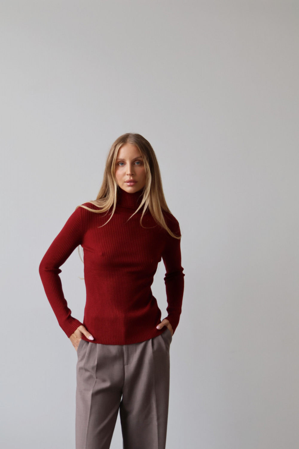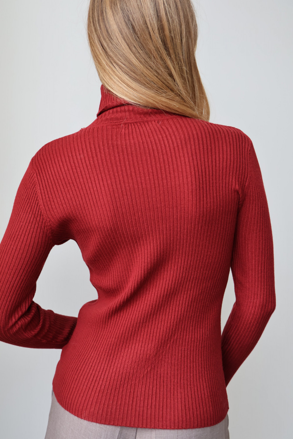 Prążkowana struktura nadaje golfowi subtelnej tekstury i modnego charakteru, a głęboki, bordowy kolor wprowadza wyrafinowanie i uniwersalność, dzięki czemu można go łatwo zestawić z różnymi elementami garderoby – zarówno w codziennych, jak i eleganckich stylizacjach.