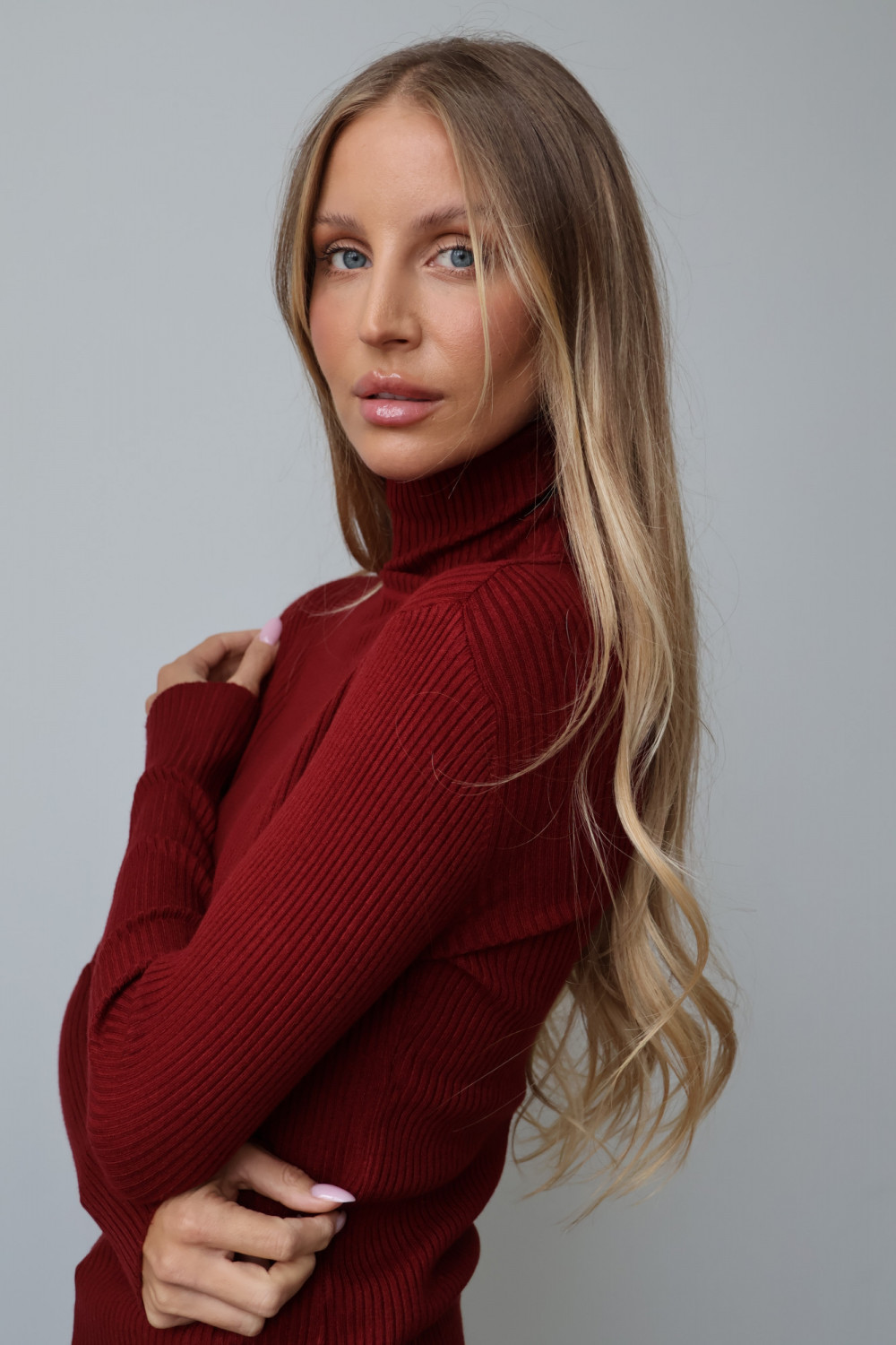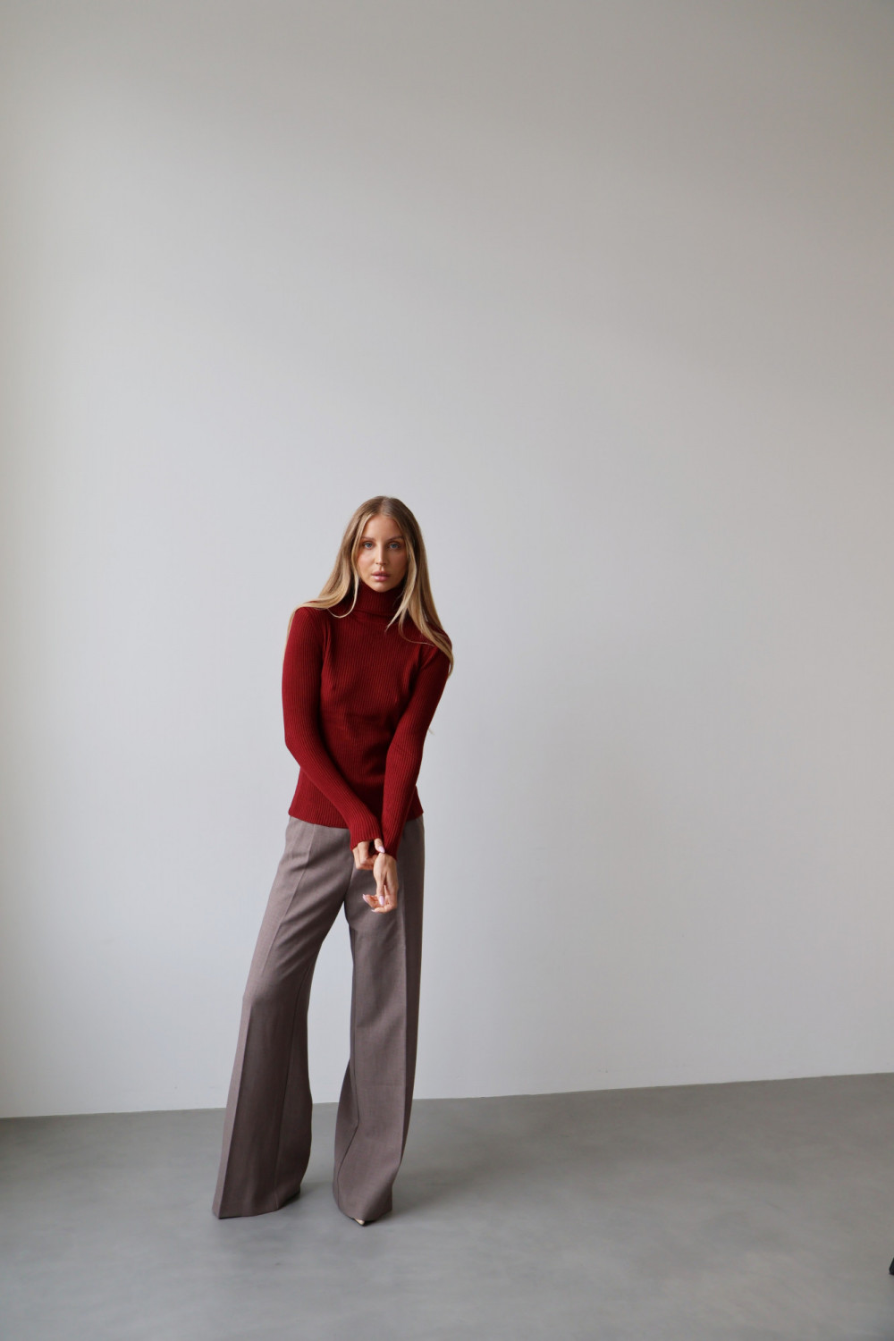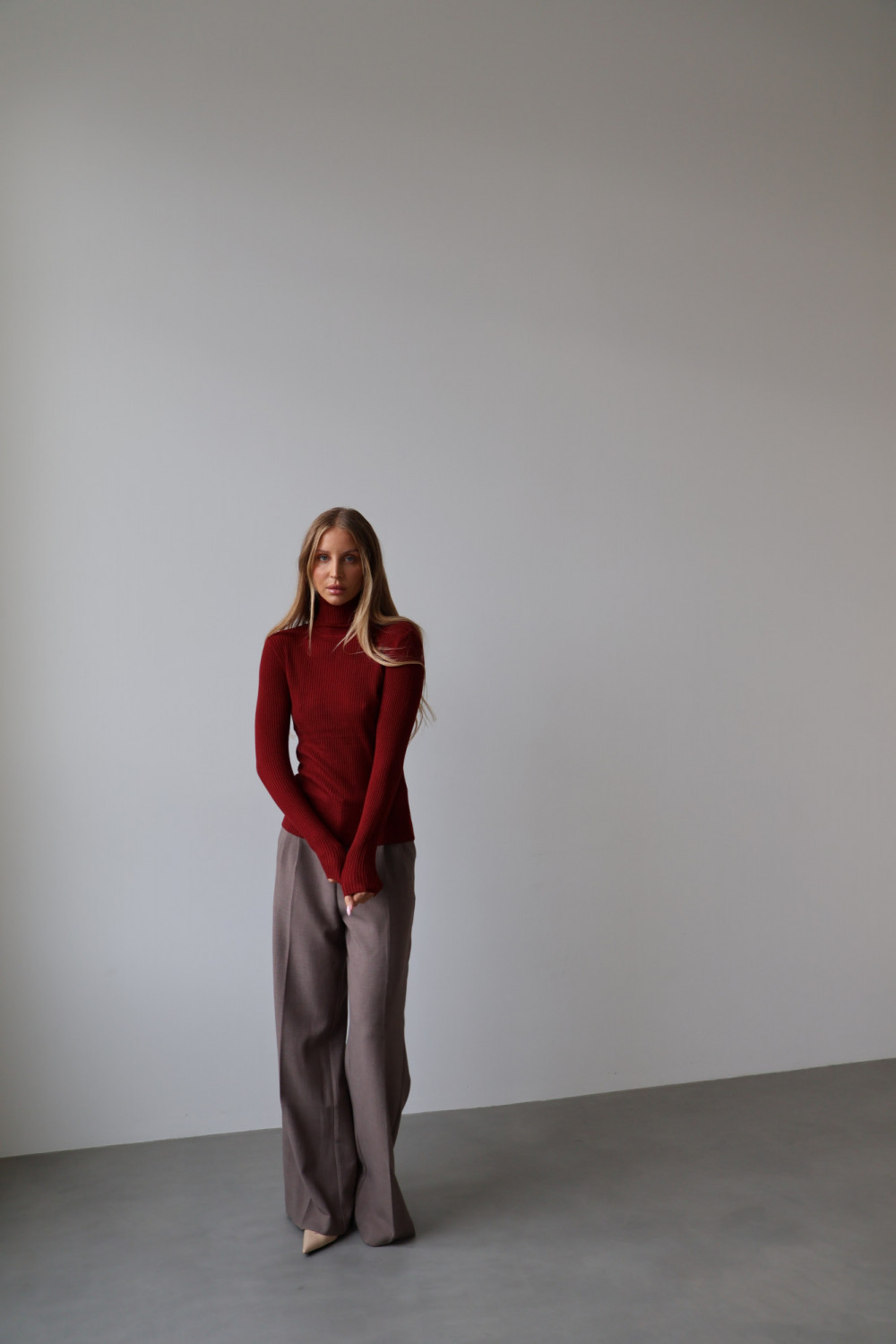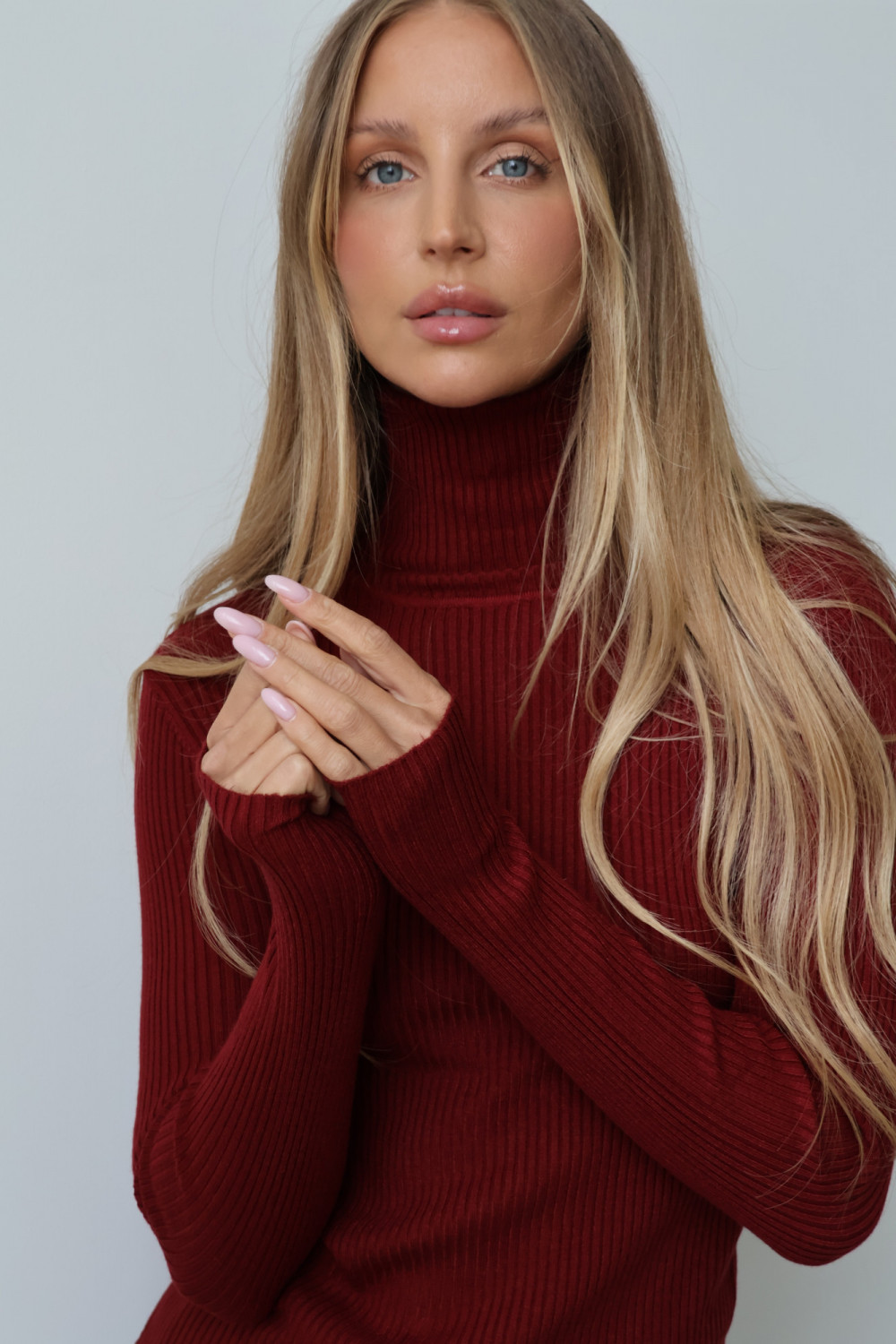 Prążkowana struktura nadaje golfowi subtelnej tekstury i modnego charakteru, a głęboki, bordowy kolor wprowadza wyrafinowanie i uniwersalność, dzięki czemu można go łatwo zestawić z różnymi elementami garderoby – zarówno w codziennych, jak i eleganckich stylizacjach.