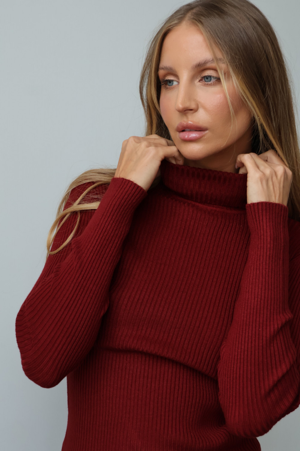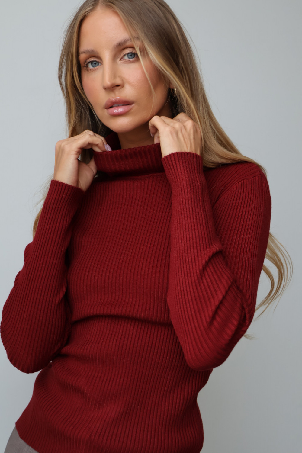 Golf prążkowany HUG w kolorze bordo to idealny wybór dla kobiet ceniących komfort, modny detal i ponadczasowy szyk w każdej stylizacji.