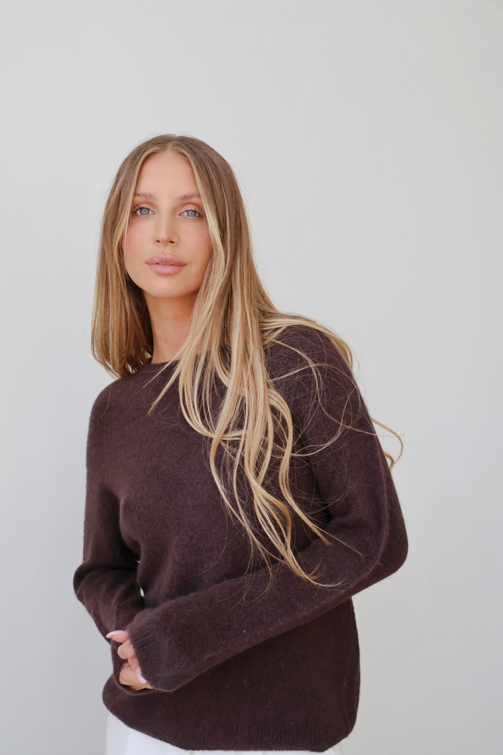 Sweter Arosa w odcieniu gorzkiej czekolady wykonany jest z miękkiego materiału z domieszką baby alpaki, która otula komfortem i zapewnia naturalne ciepło. Delikatny w dotyku materiał jest przyjemny dla skóry i nadaje swetrowi luksusowy, subtelny charakter. Idealny wybór dla osób ceniących komfort i ponadczasową elegancję w codziennych stylizacjach.