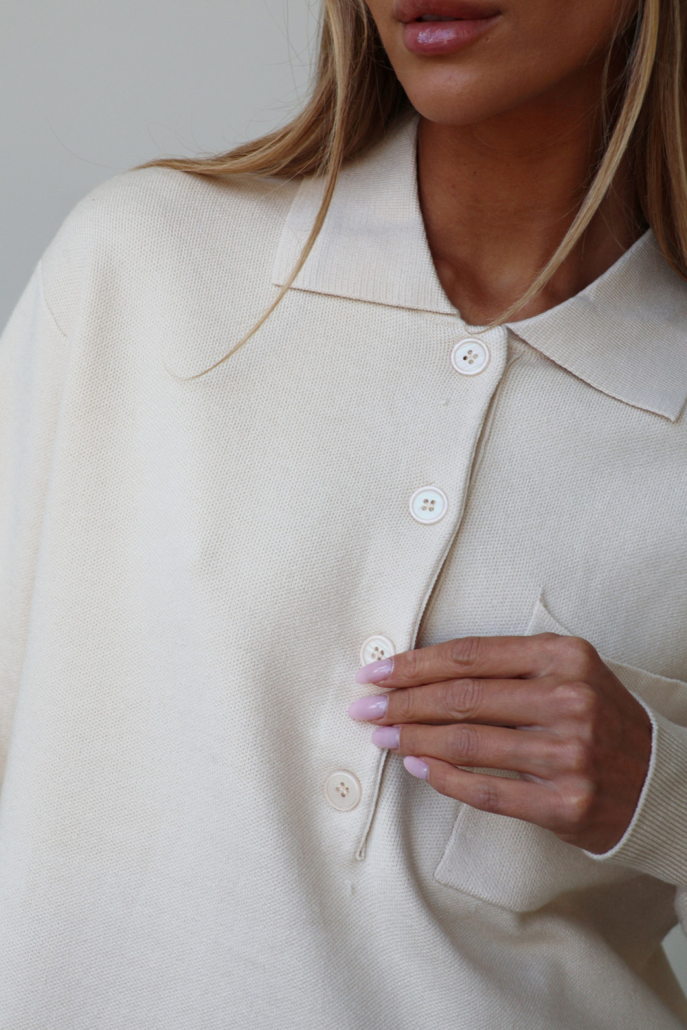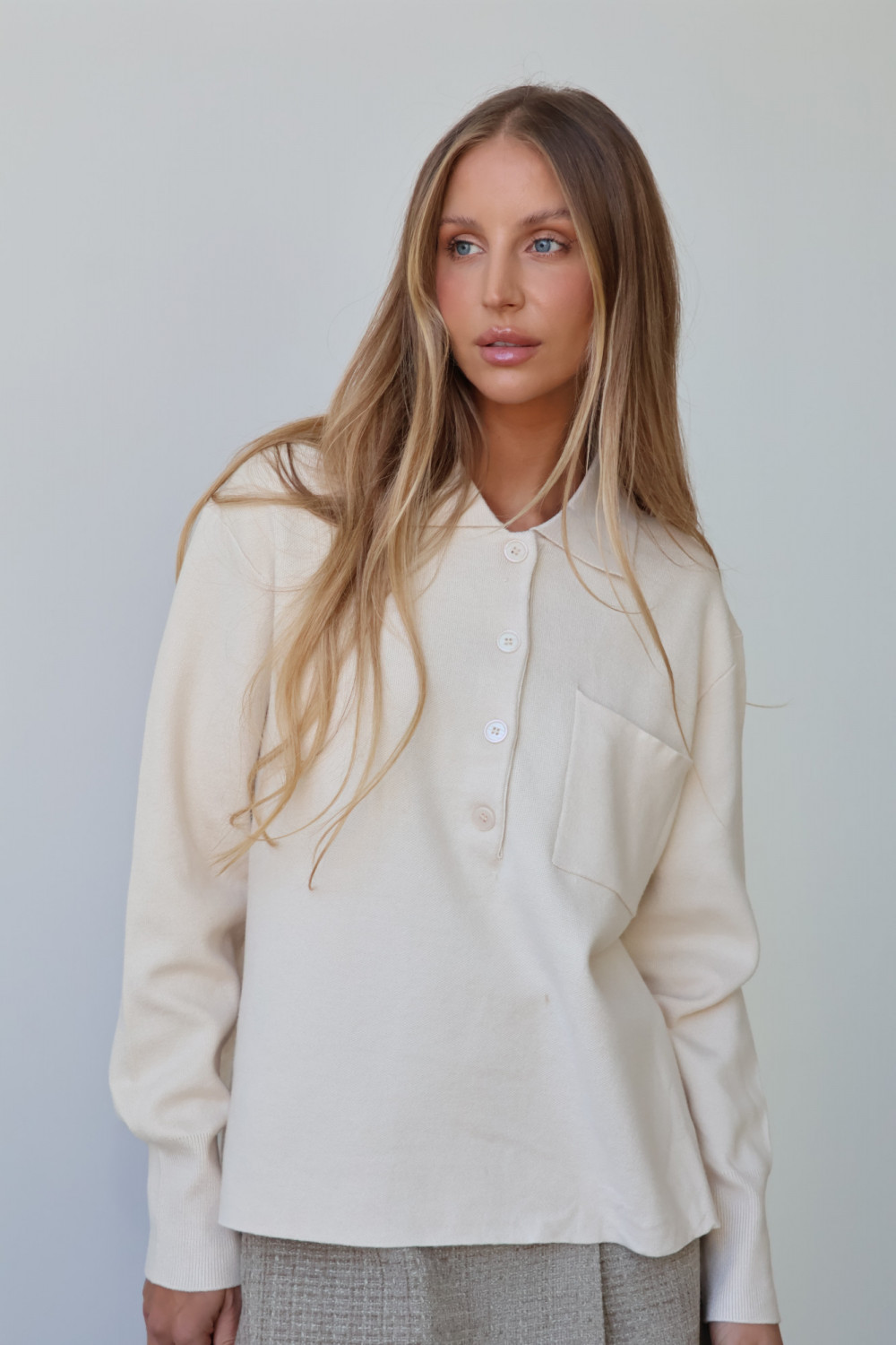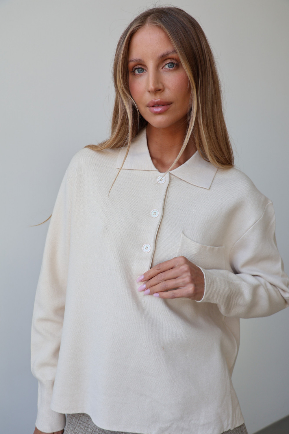 Sweter polo Mons w beżowym odcieniu wykonany jest z miękkiego i przyjemnego dla skóry materiału, który zapewnia komfort przez cały dzień. Klasyczny fason polo z guzikami dodaje subtelnej elegancji i ponadczasowego charakteru, a lekka, delikatna w dotyku tkanina sprawia, że sweter świetnie sprawdza się w codziennych i bardziej wyszukanych stylizacjach.
