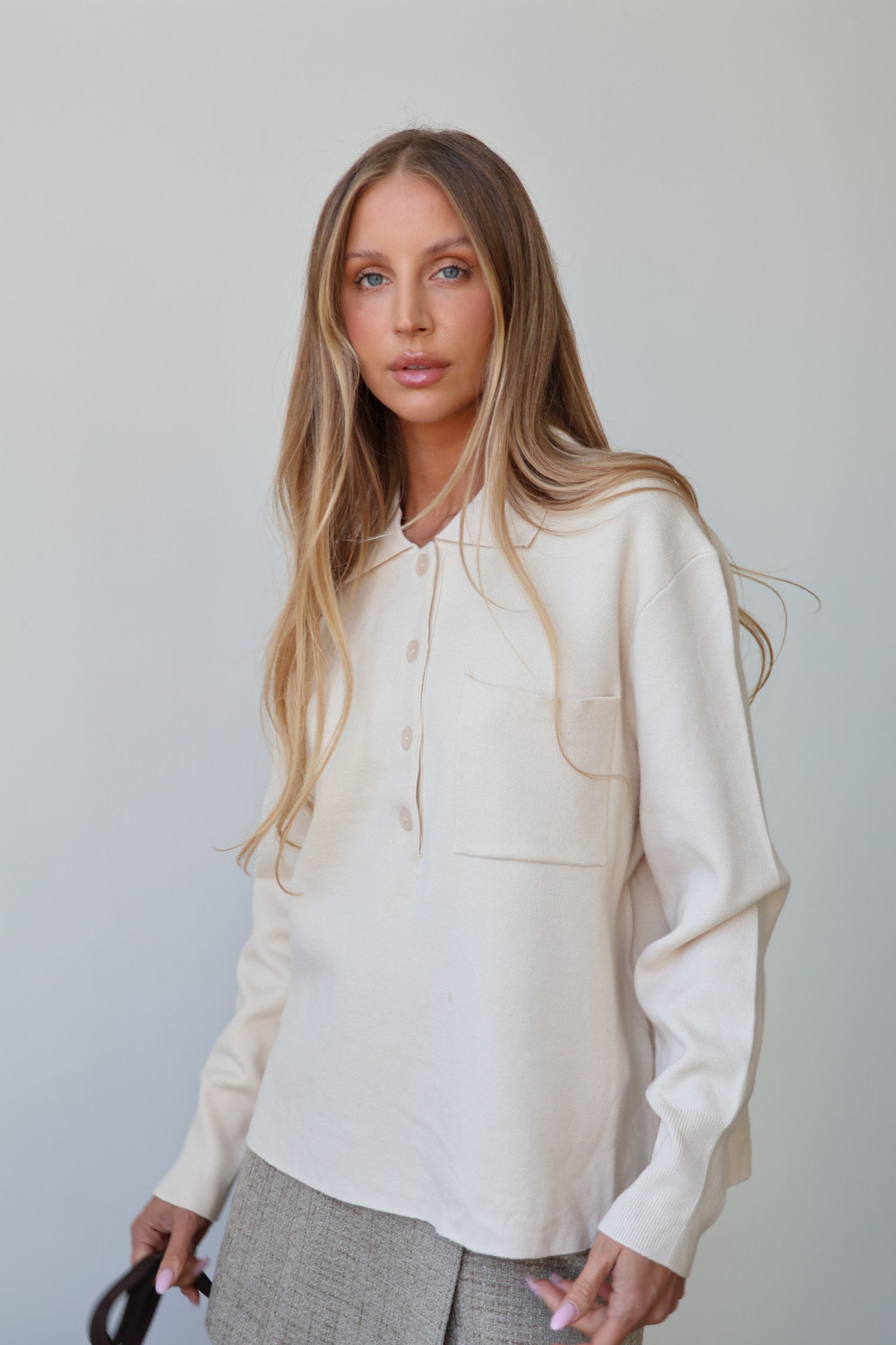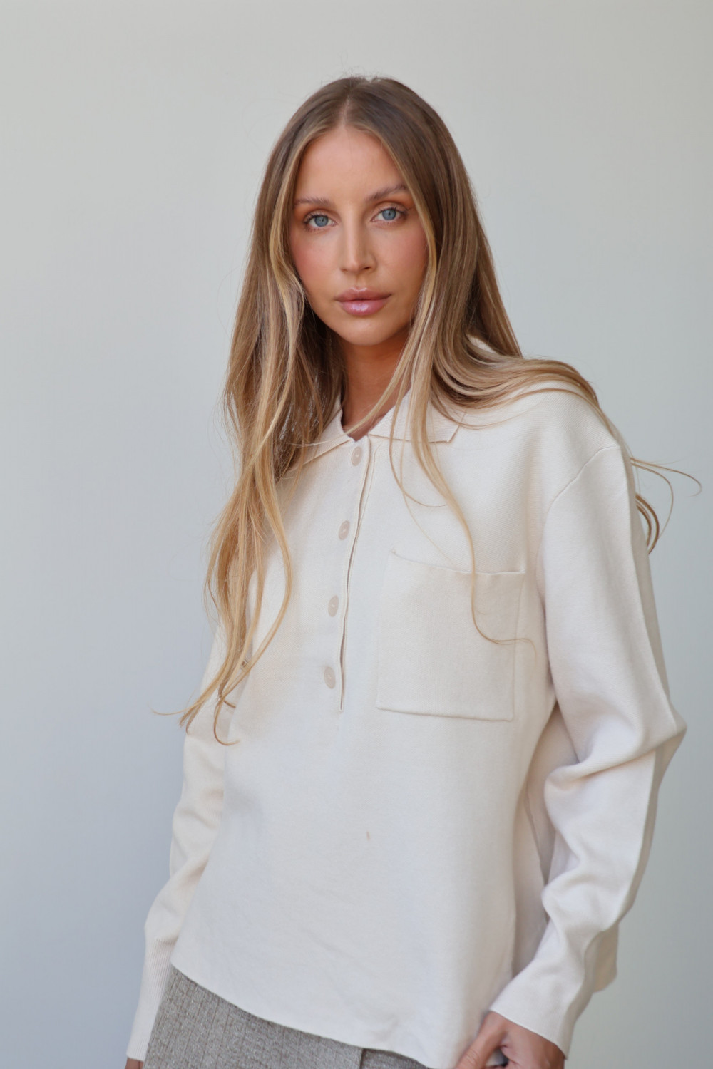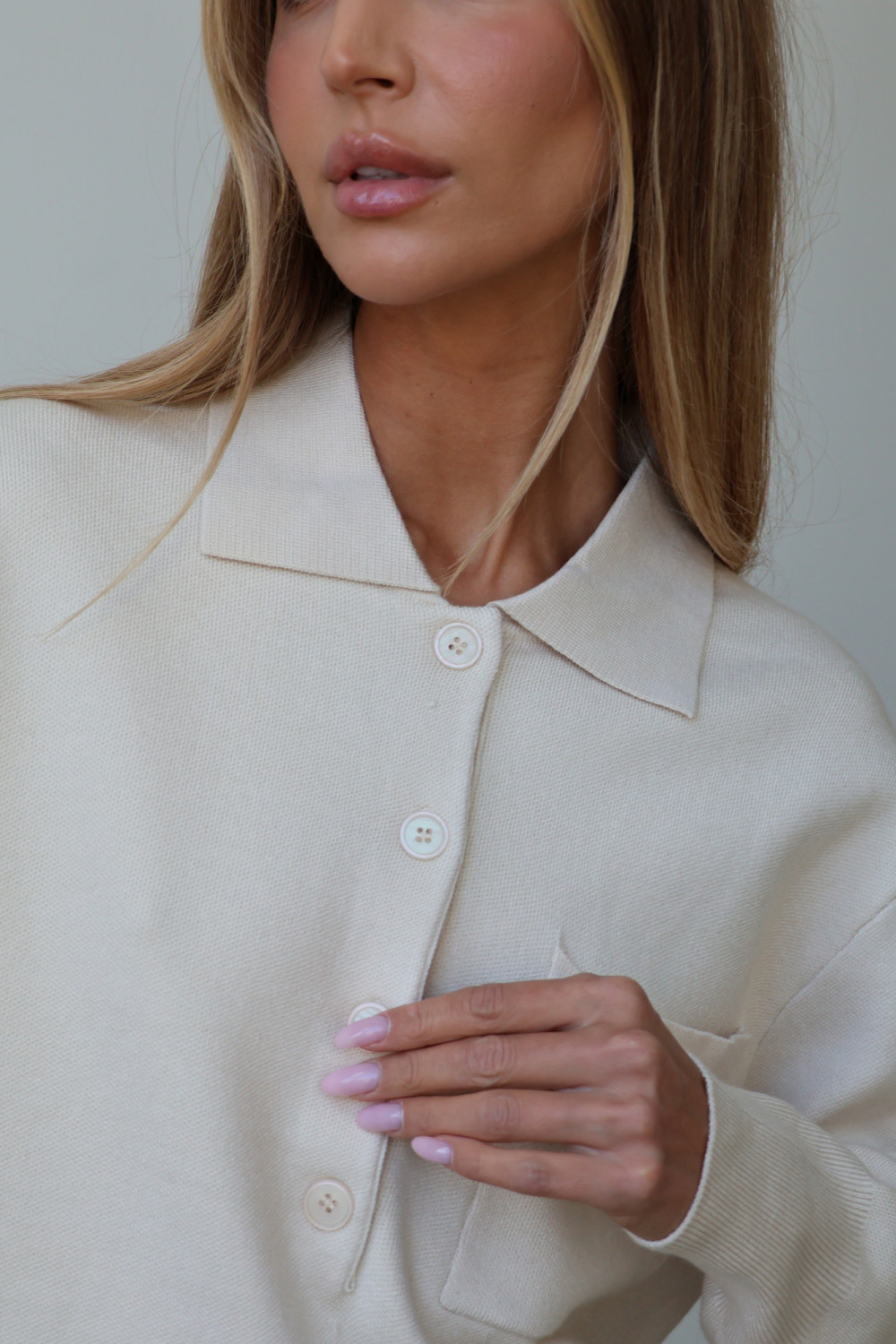 Sweter polo Mons w beżowym odcieniu wykonany jest z miękkiego i przyjemnego dla skóry materiału, który zapewnia komfort przez cały dzień. Klasyczny fason polo z guzikami dodaje subtelnej elegancji i ponadczasowego charakteru, a lekka, delikatna w dotyku tkanina sprawia, że sweter świetnie sprawdza się w codziennych i bardziej wyszukanych stylizacjach.