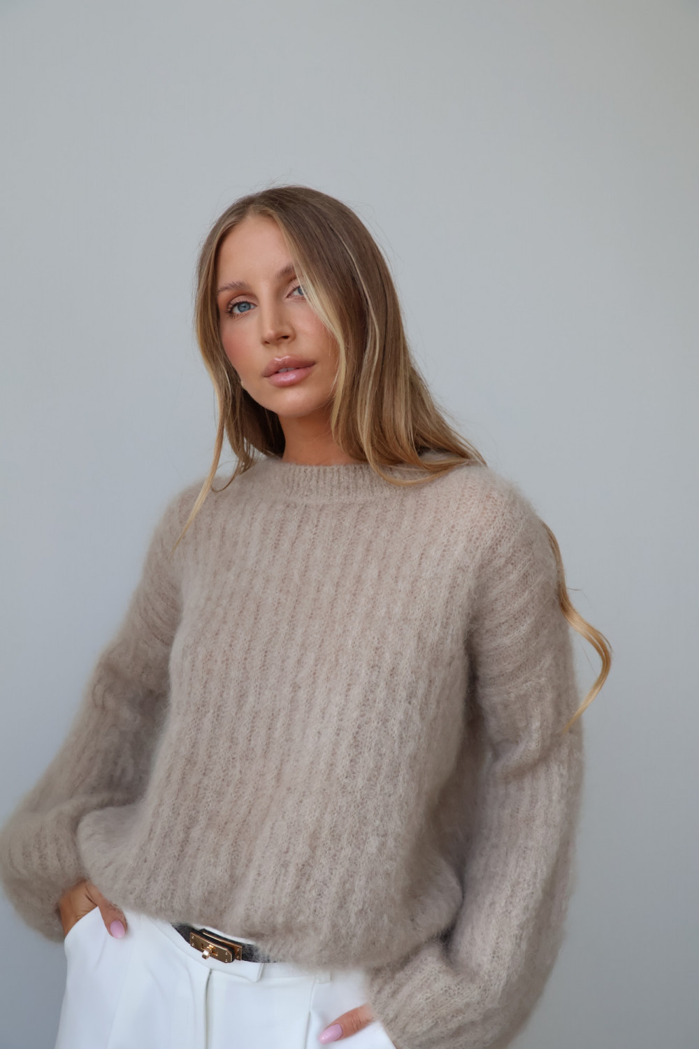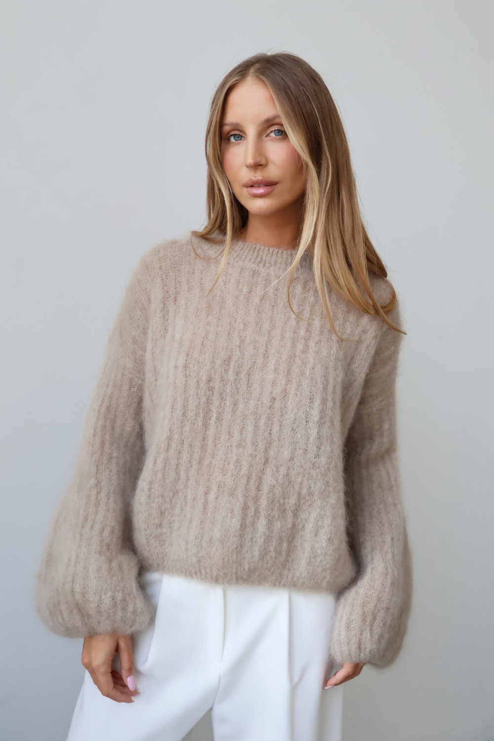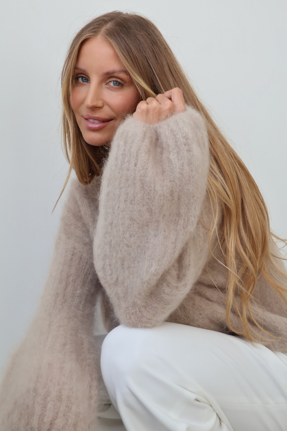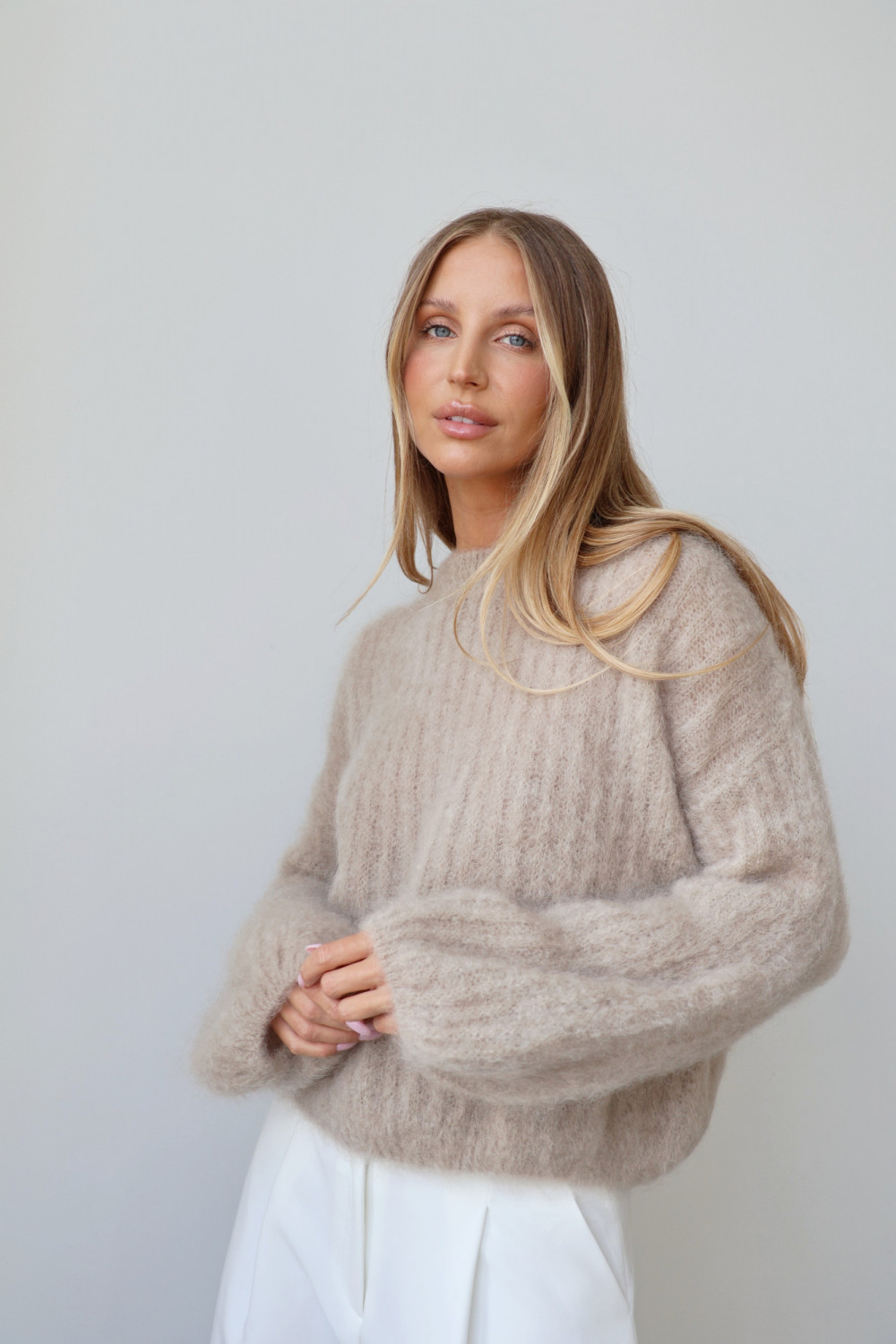 Sweter Bristol w beżowym odcieniu wykonany jest z wyjątkowego super kid moheru premium, który zachwyca puszystością, lekkością i naturalnym ciepłem. Miękki w dotyku i delikatny dla skóry, zapewnia luksusowy komfort noszenia przez cały dzień. Klasyczny fason łączy ponadczasową elegancję z przytulnym stylem, tworząc idealny element garderoby na chłodniejsze dni.