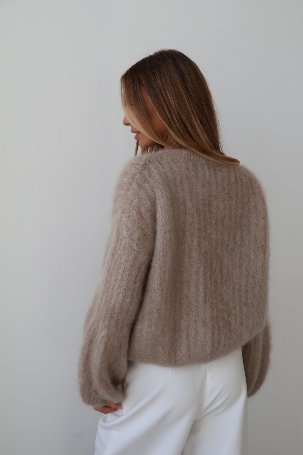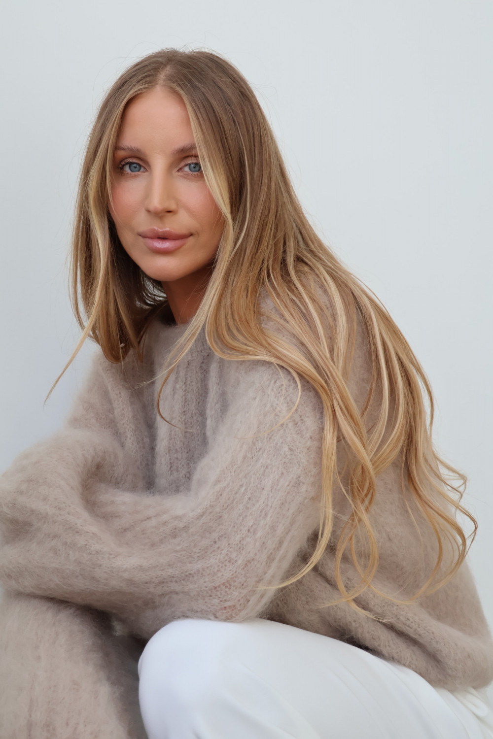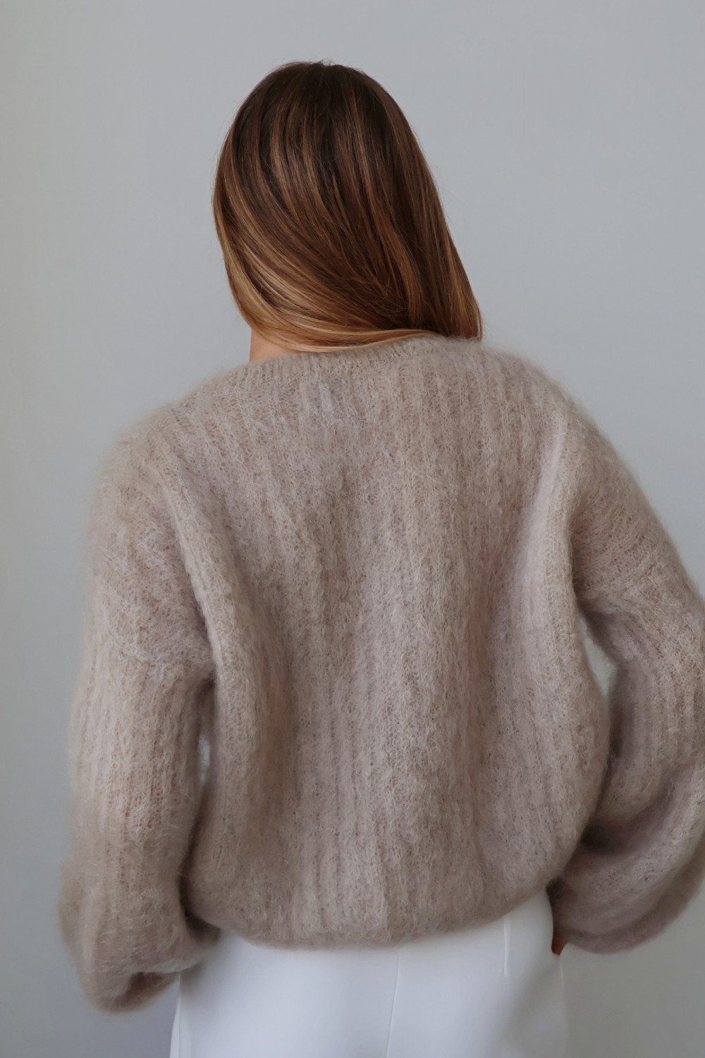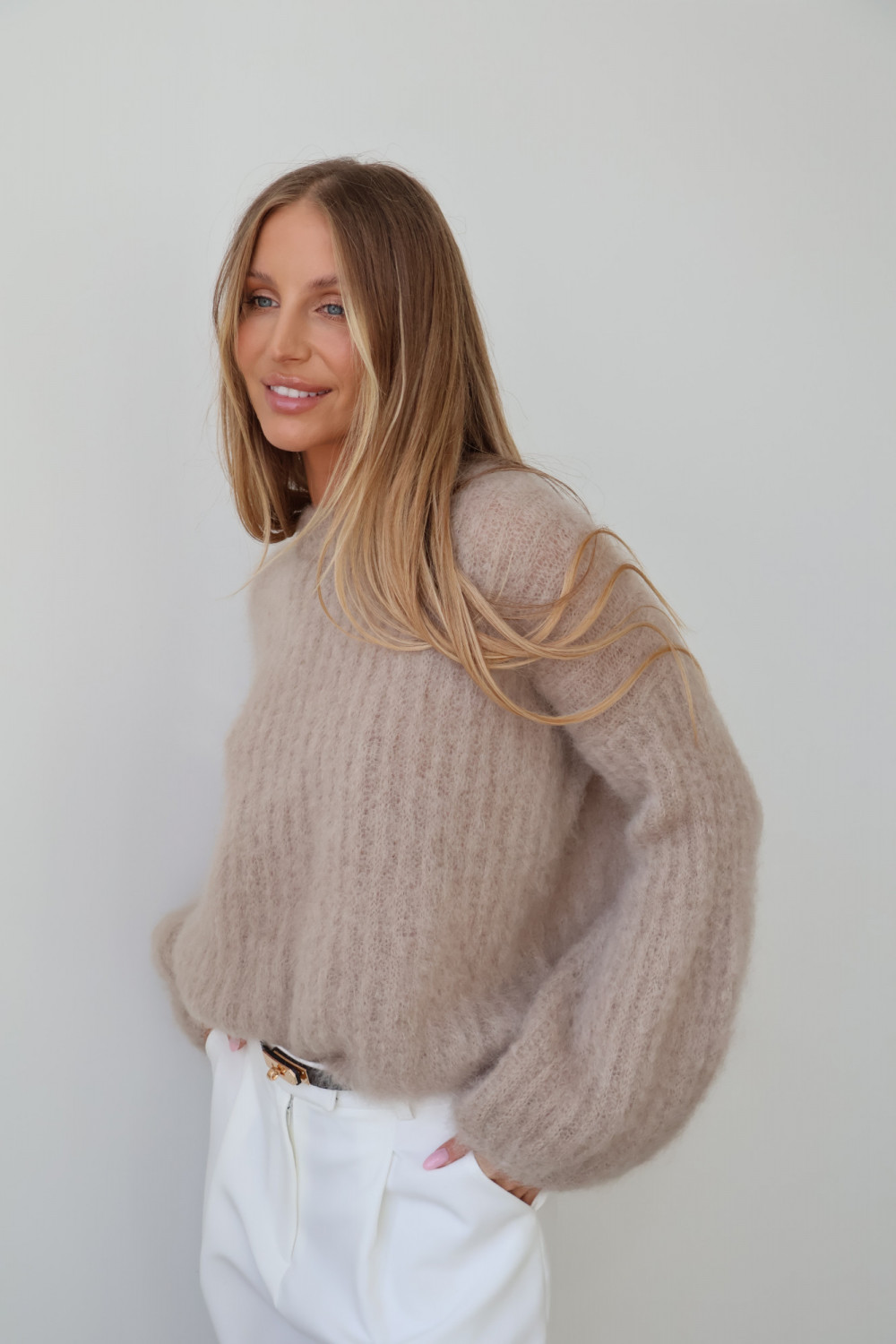 Sweter Bristol w beżowym odcieniu wykonany jest z wyjątkowego super kid moheru premium, który zachwyca puszystością, lekkością i naturalnym ciepłem. Miękki w dotyku i delikatny dla skóry, zapewnia luksusowy komfort noszenia przez cały dzień. Klasyczny fason łączy ponadczasową elegancję z przytulnym stylem, tworząc idealny element garderoby na chłodniejsze dni.
