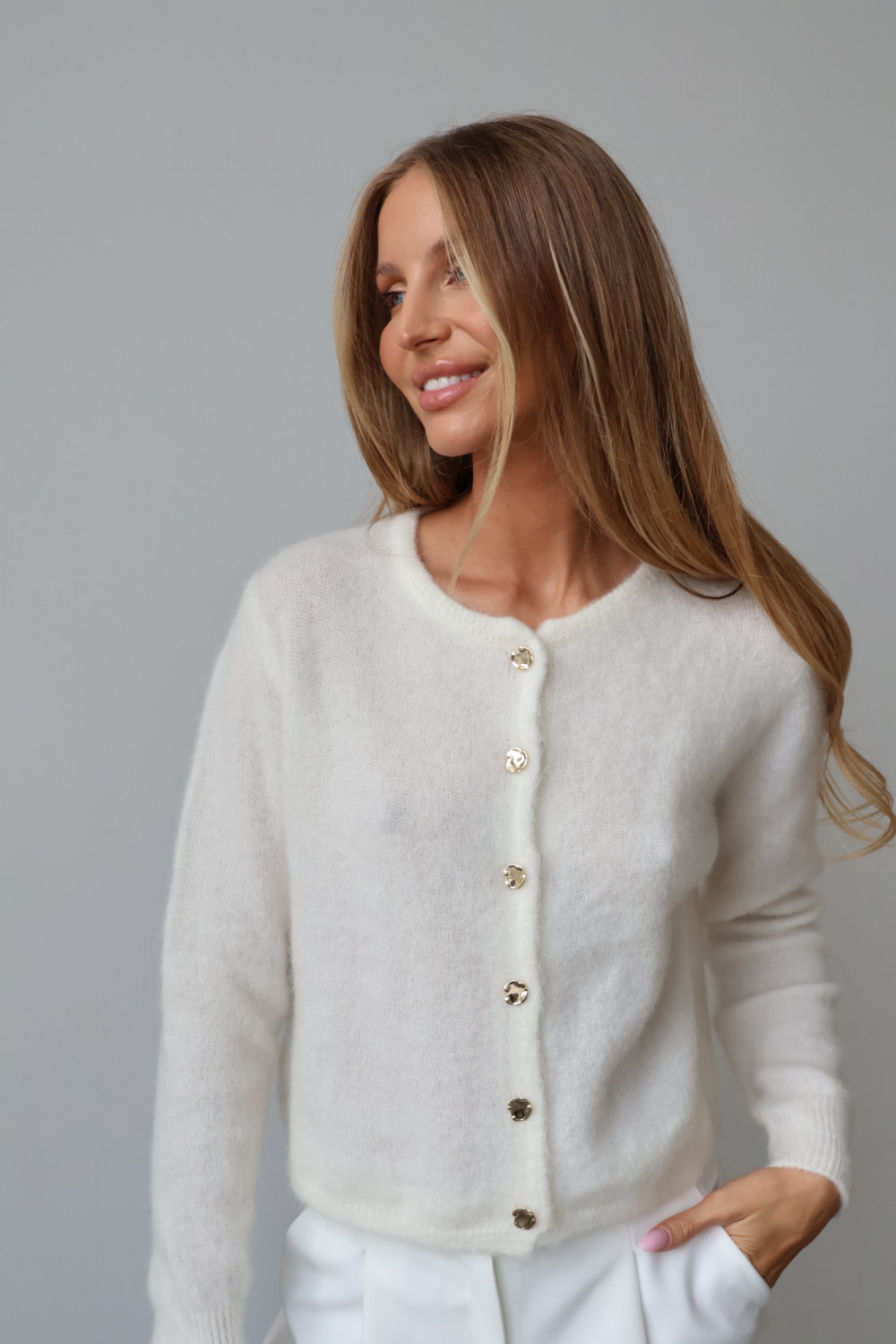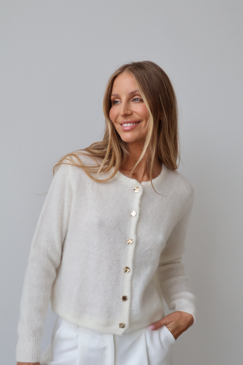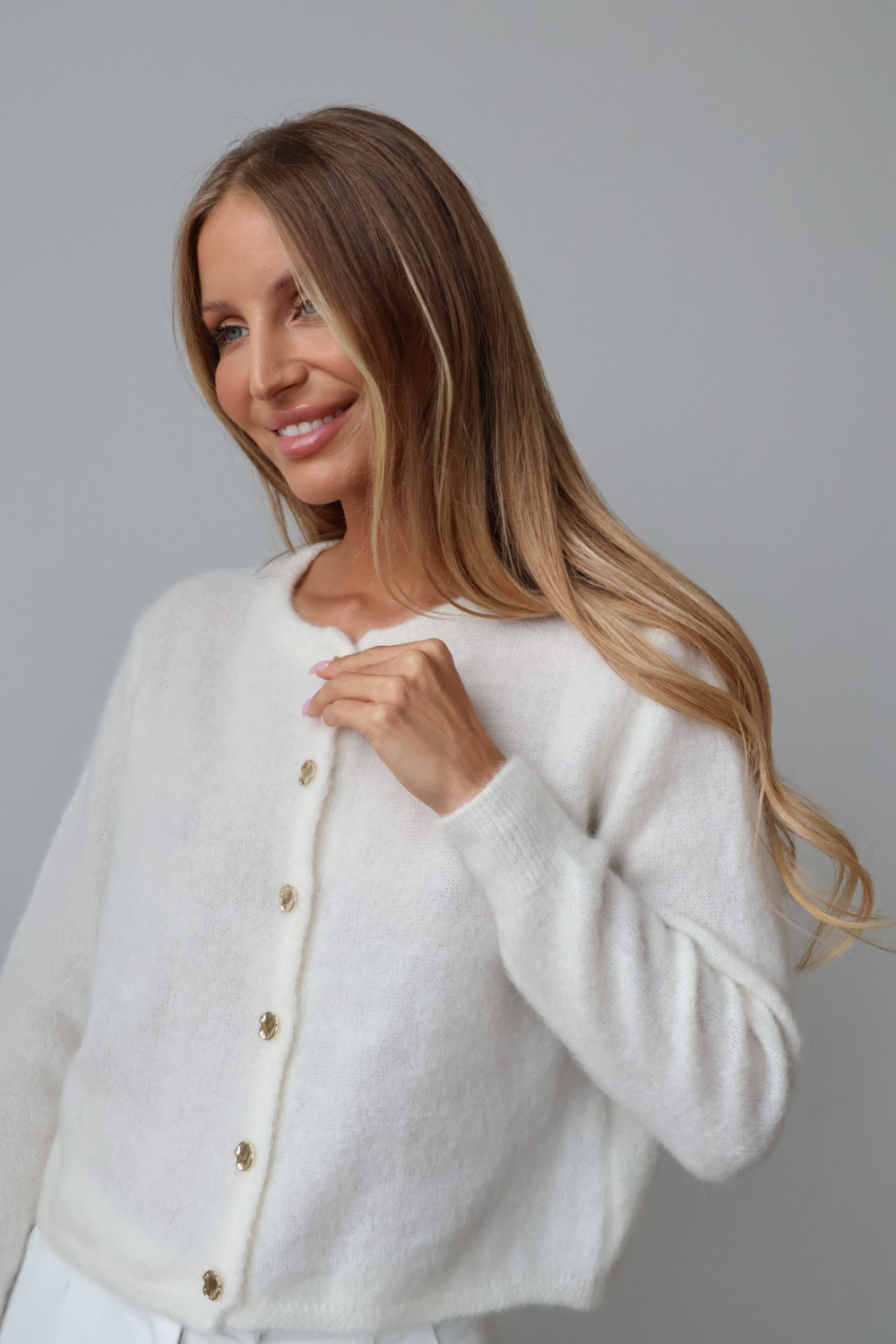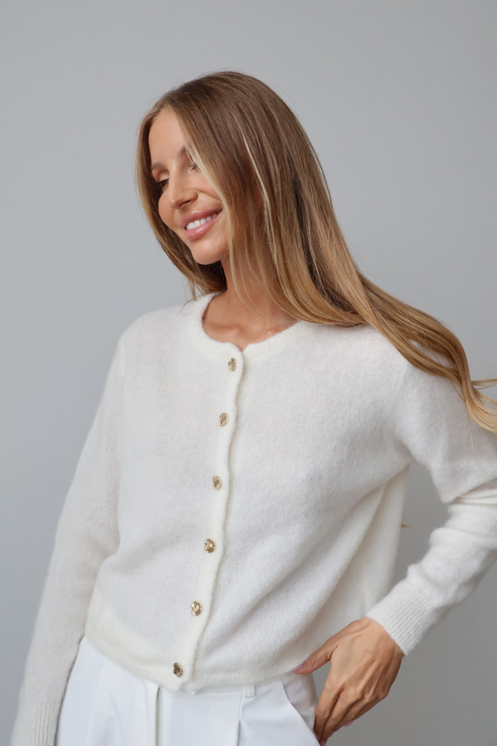 Kardigan z kid moherem i wełną merino premium ze złotymi guzikami premium śmietanka AURE