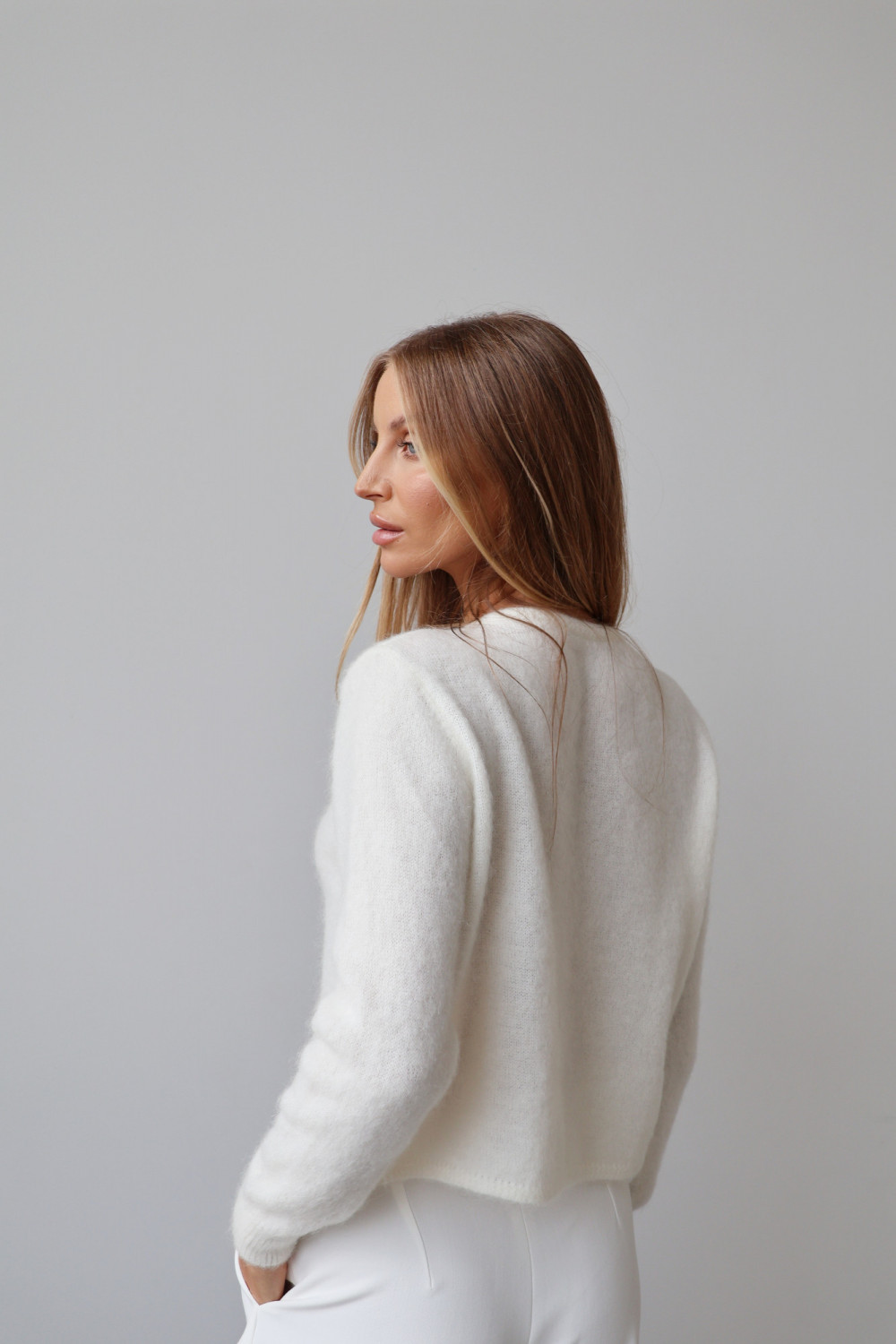 Kardigan AURE w odcieniu śmietanki to luksusowe połączenie elegancji, wygody i najwyższej jakości materiałów. Wykonany z mieszanki kid moheru i wełny merino premium, zapewnia miękkość, ciepło i delikatność w dotyku, jednocześnie zachowując lekkość i elegancki wygląd.