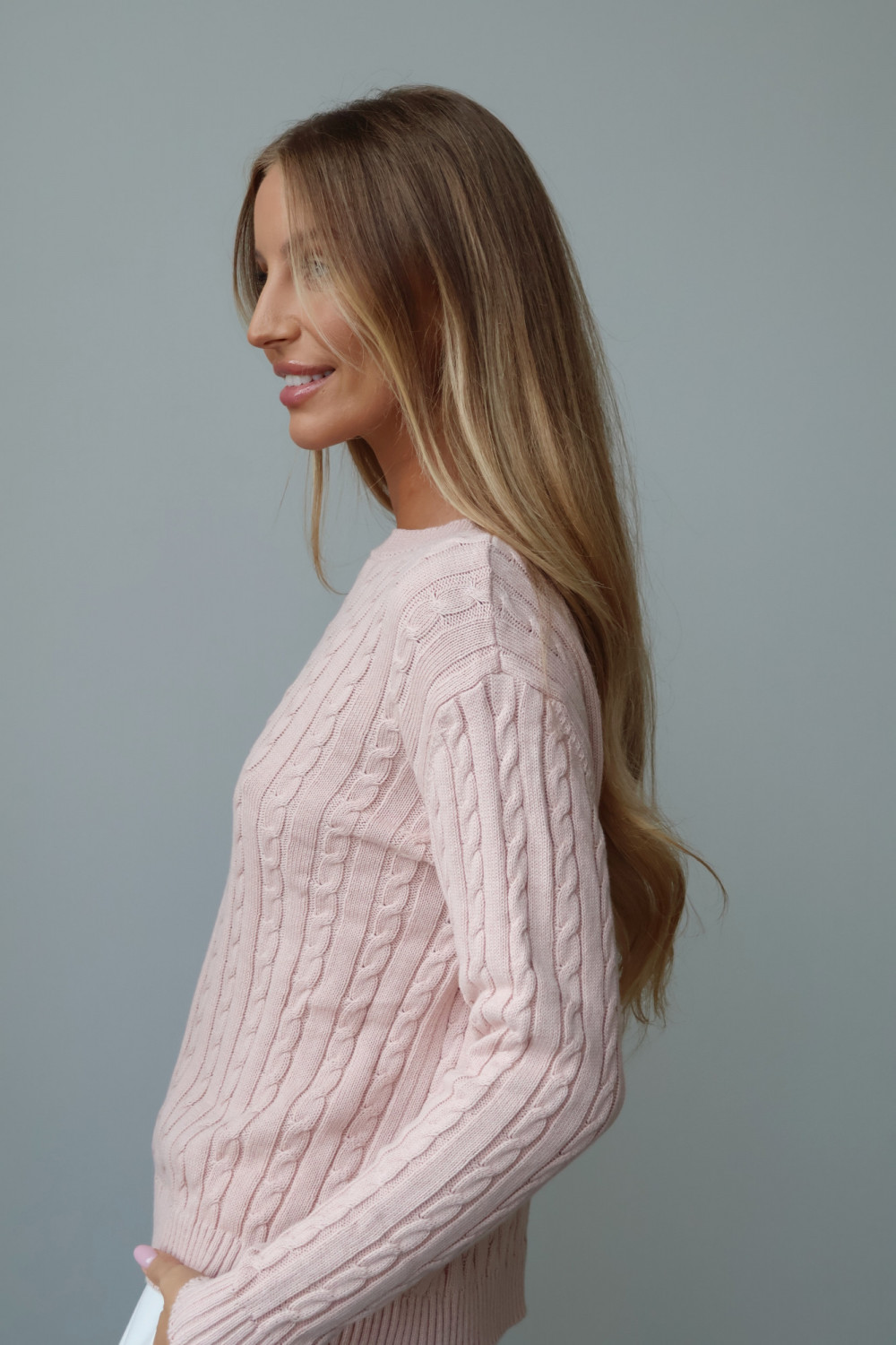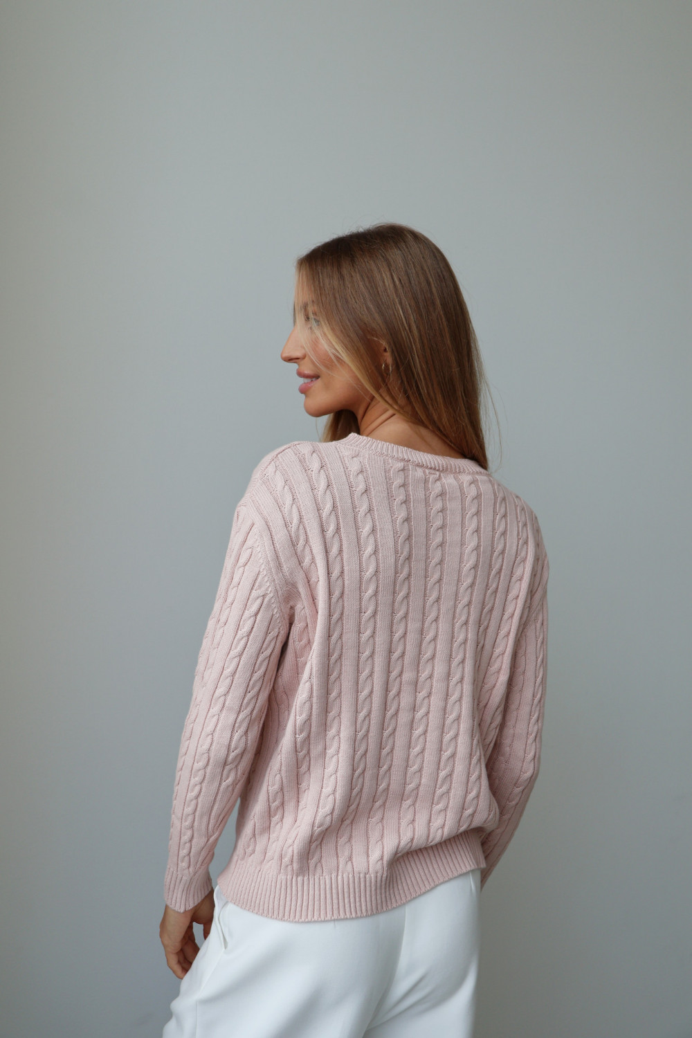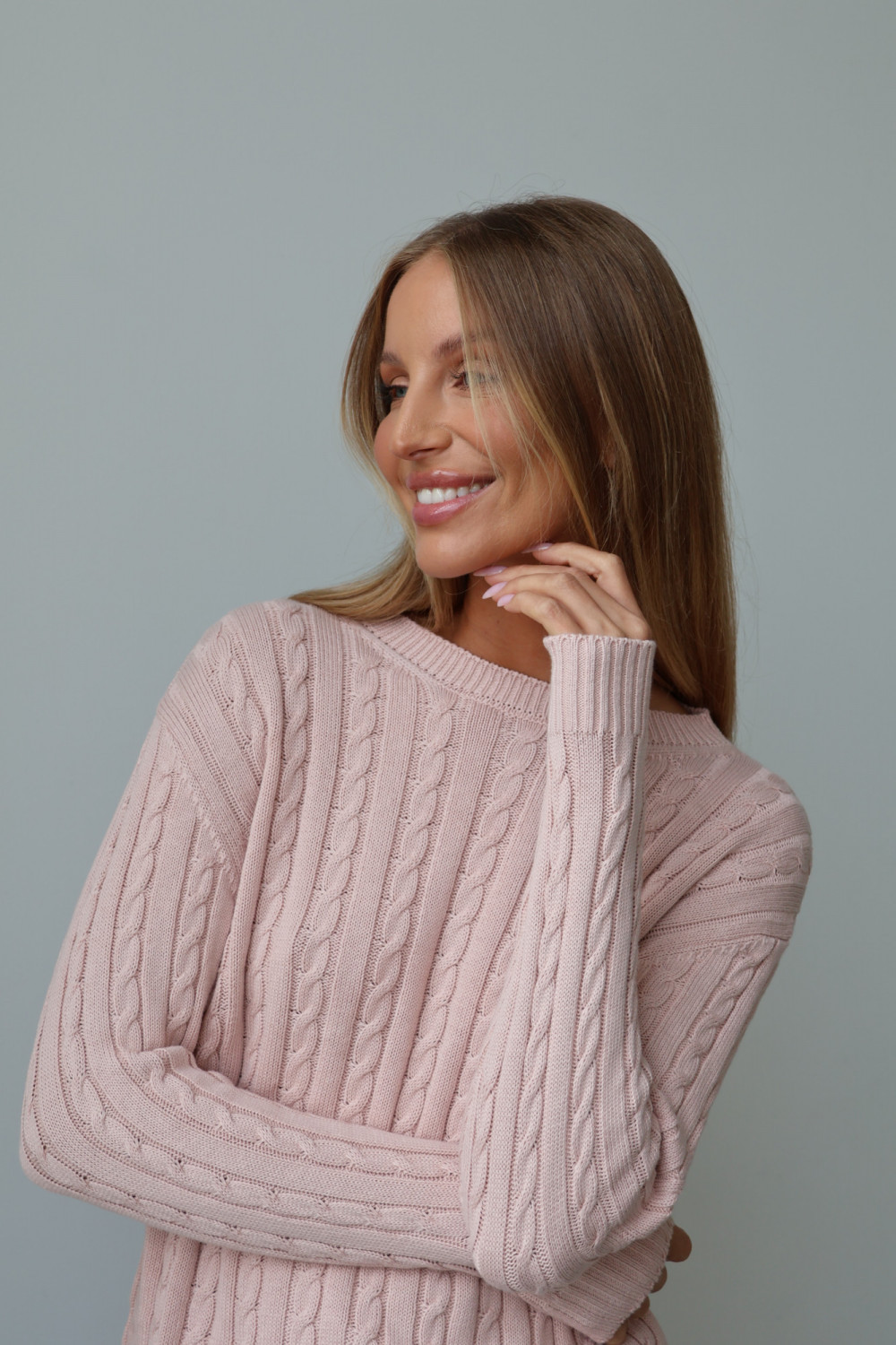 Sweter Oxford w pudrowym różu wykonany jest w 100% z wysokiej jakości bawełny, która jest miękka, przyjemna w dotyku i naturalnie oddychająca. Charakterystyczny warkoczowy splot nadaje swetrowi strukturę i subtelny, ponadczasowy urok. Klasyczny fason łączy komfort codziennego noszenia z eleganckim, wyrafinowanym wyglądem, idealnym do różnorodnych stylizacji.