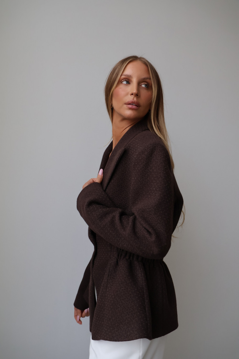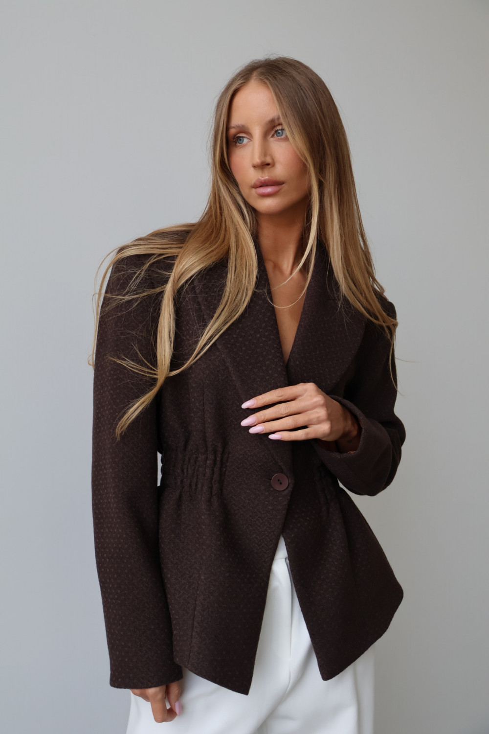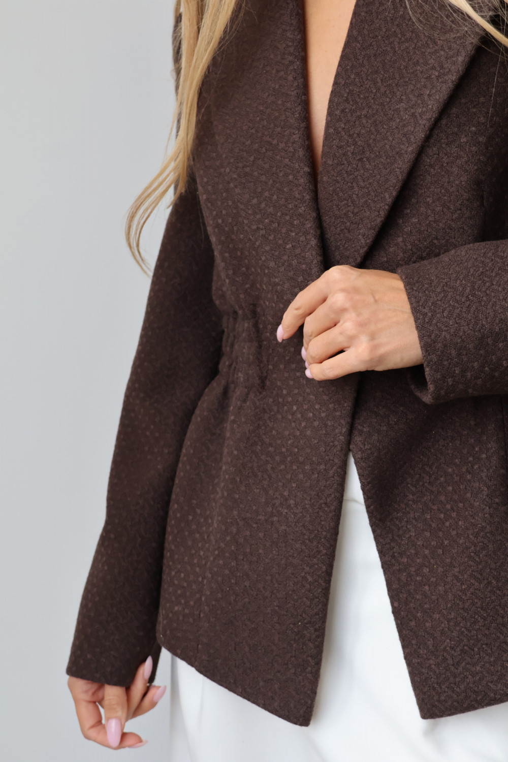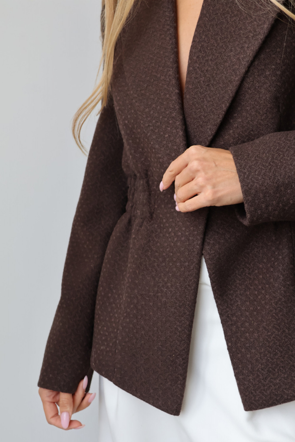 Marynarka ROYAL w odcieniu czekolady to eleganckie połączenie wygody i nowoczesnego stylu. Wykonana z wysokiej jakości materiału, zapewnia komfort noszenia i doskonałe dopasowanie do sylwetki dzięki praktycznemu ściągaczowi w talii, który podkreśla kobiecą sylwetkę.