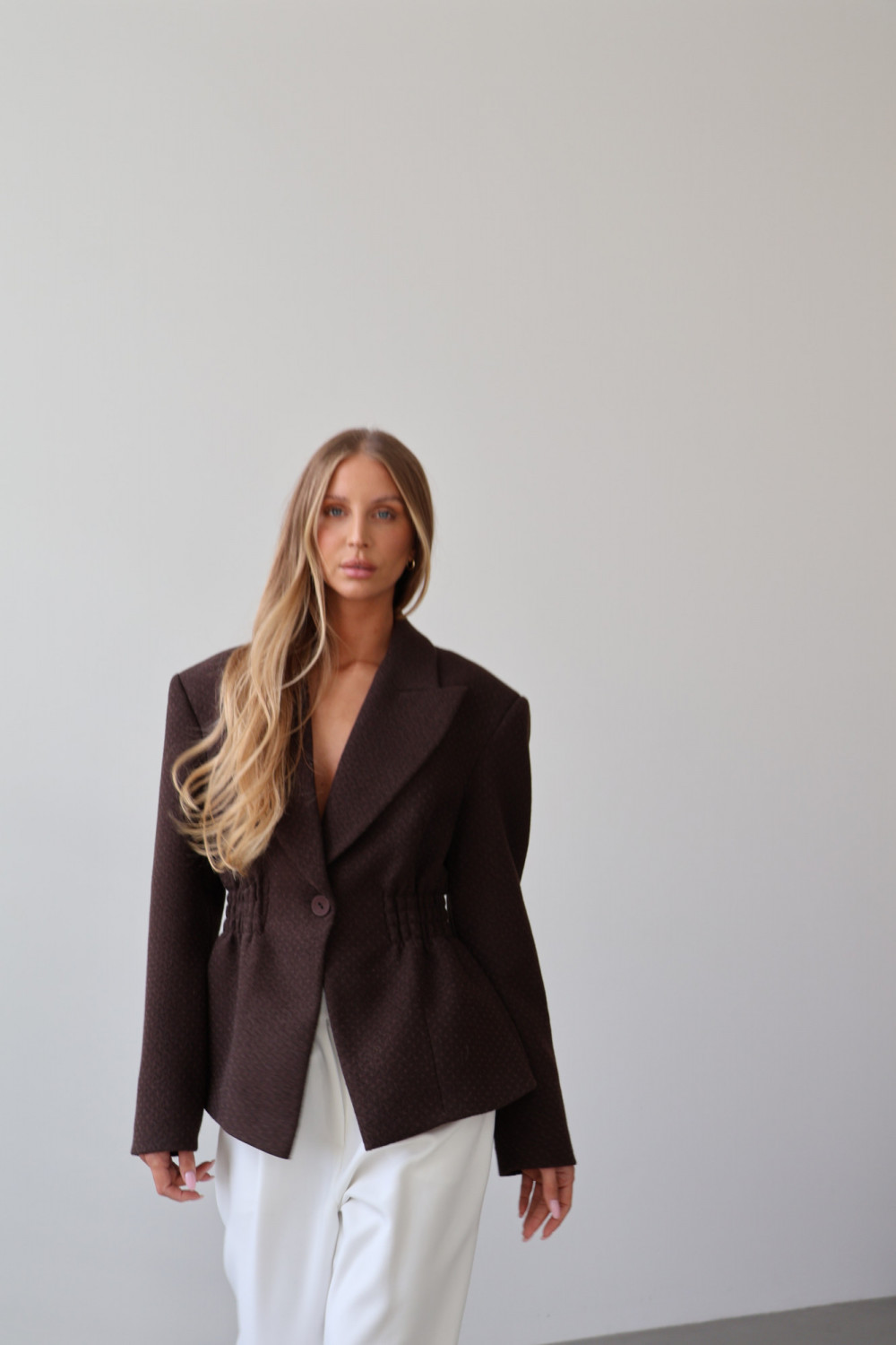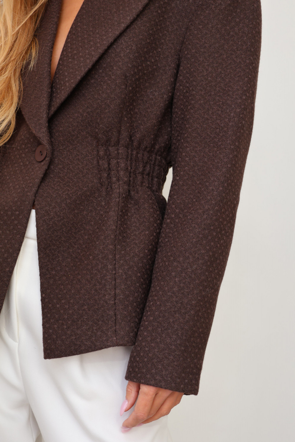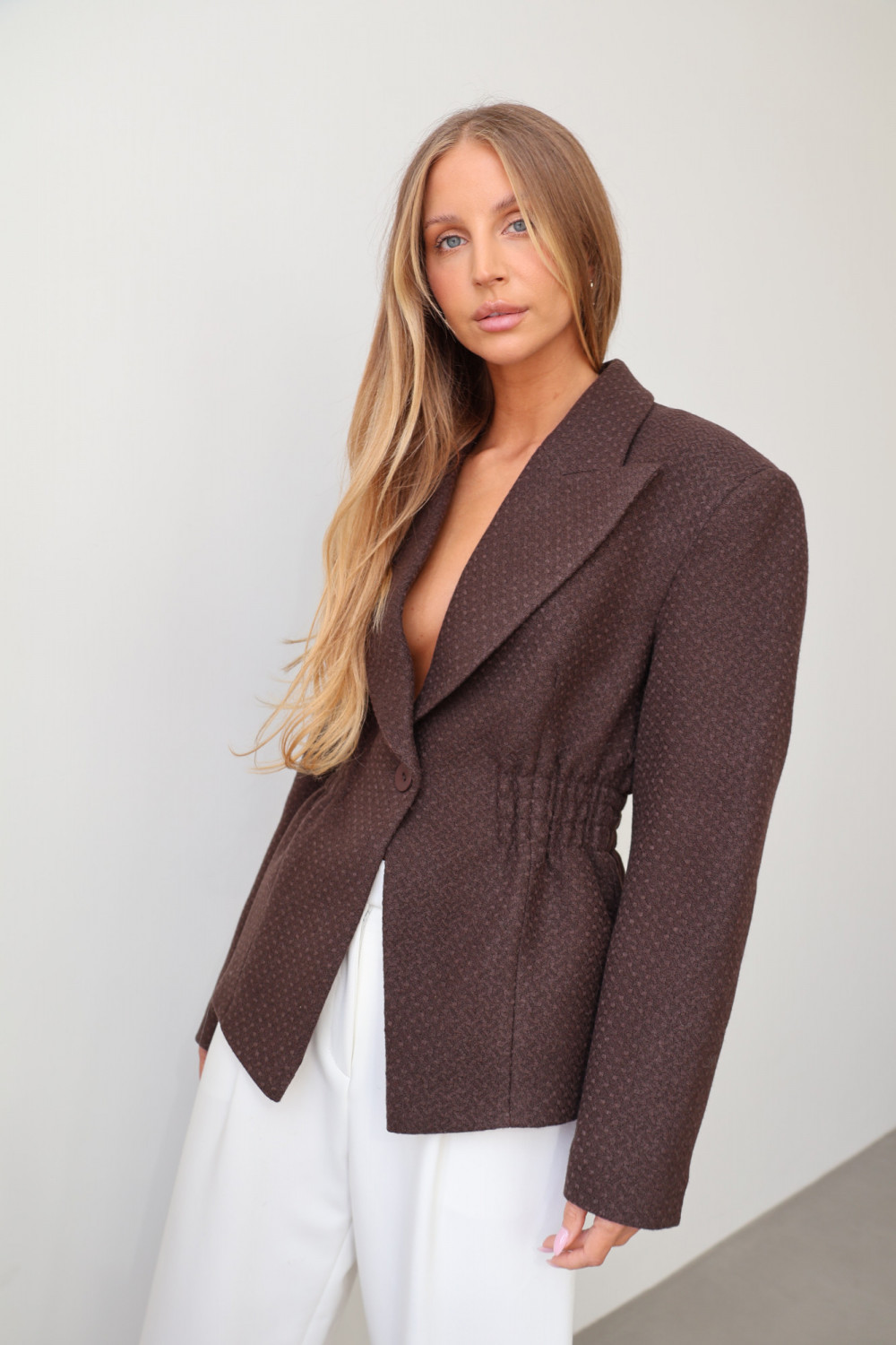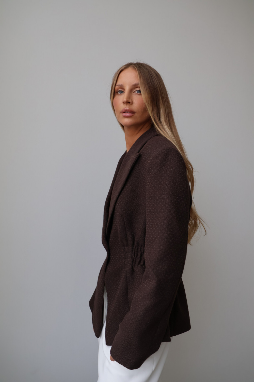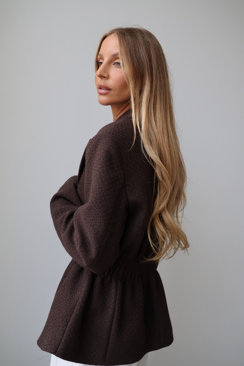 Marynarka ROYAL w odcieniu czekolady to eleganckie połączenie wygody i nowoczesnego stylu. Wykonana z wysokiej jakości materiału, zapewnia komfort noszenia i doskonałe dopasowanie do sylwetki dzięki praktycznemu ściągaczowi w talii, który podkreśla kobiecą sylwetkę.