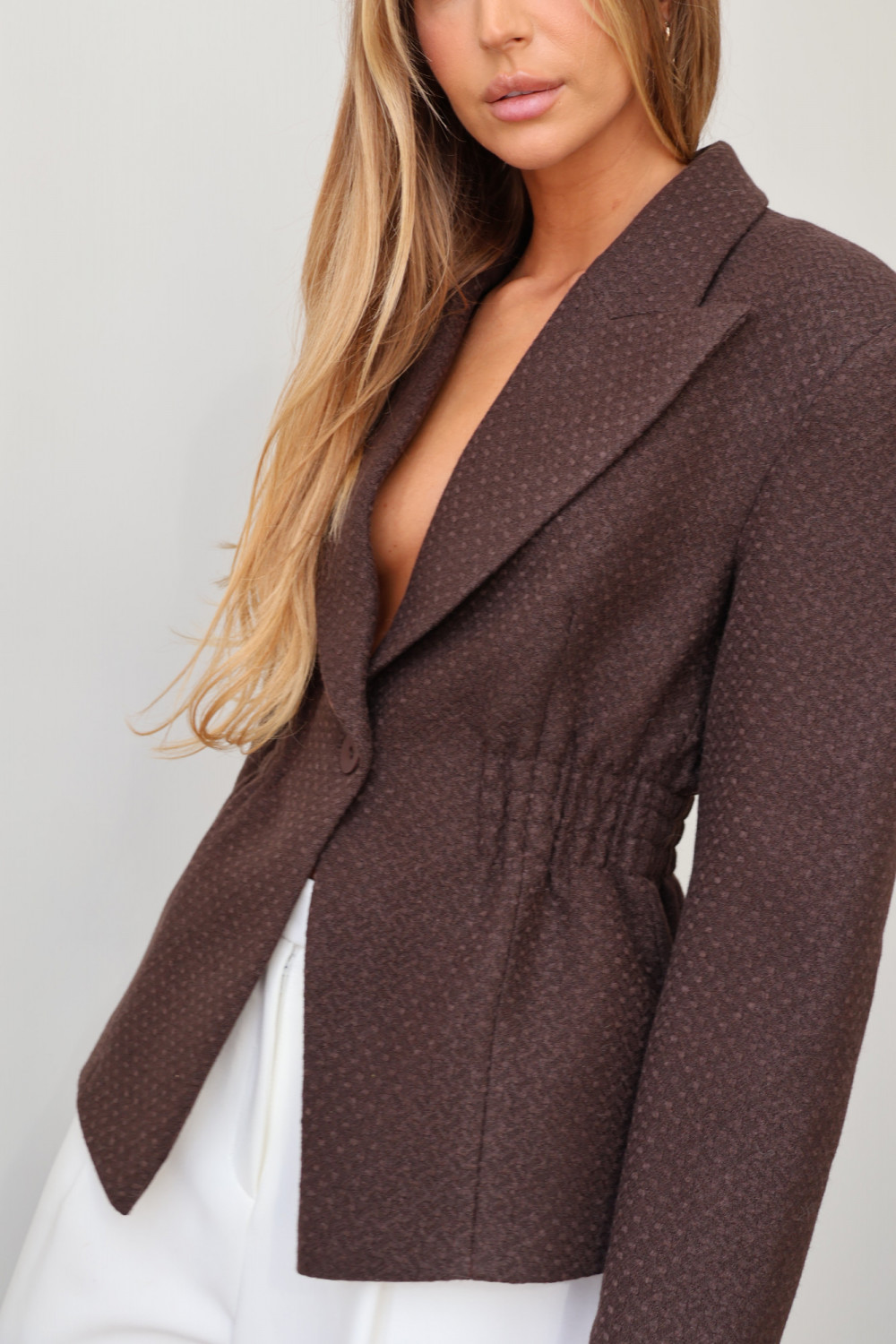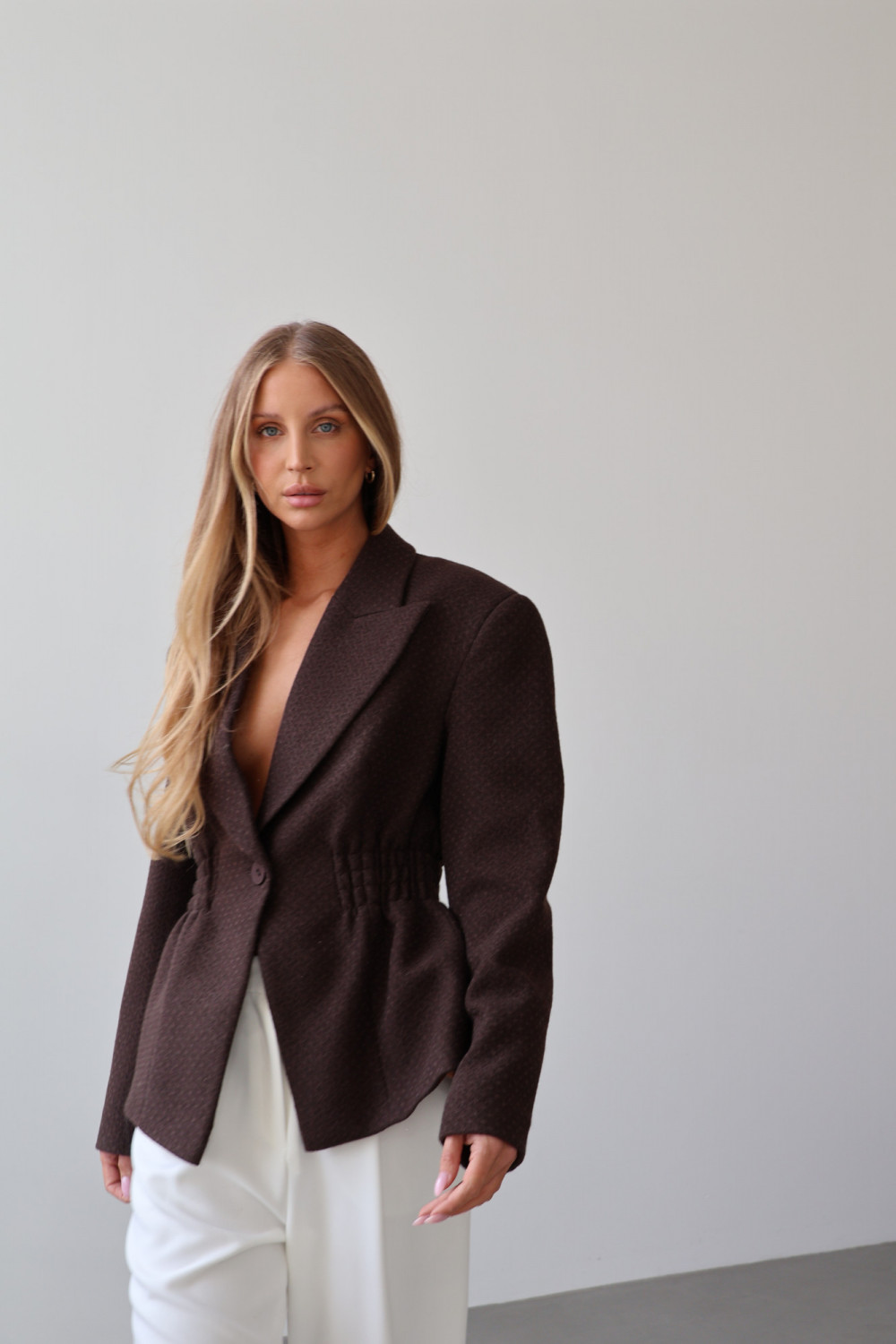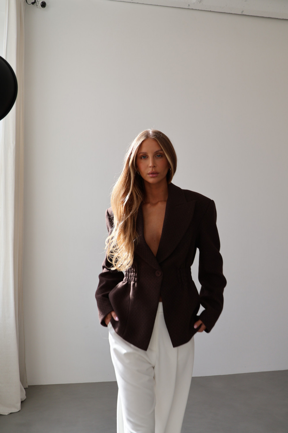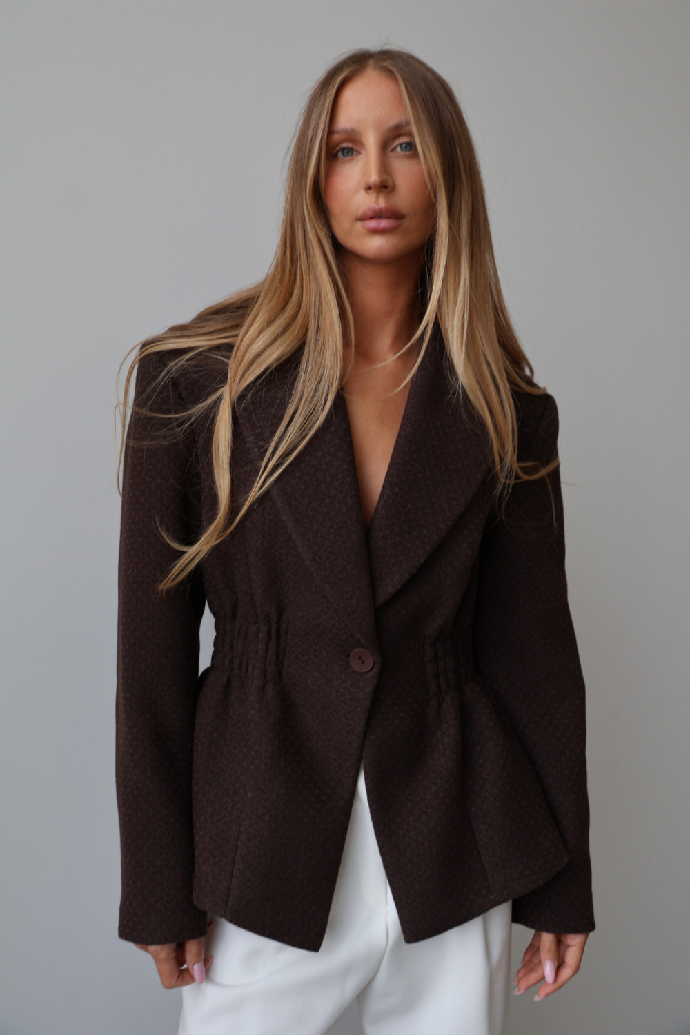 Marynarka ROYAL w odcieniu czekolady to eleganckie połączenie wygody i nowoczesnego stylu. Wykonana z wysokiej jakości materiału, zapewnia komfort noszenia i doskonałe dopasowanie do sylwetki dzięki praktycznemu ściągaczowi w talii, który podkreśla kobiecą sylwetkę.