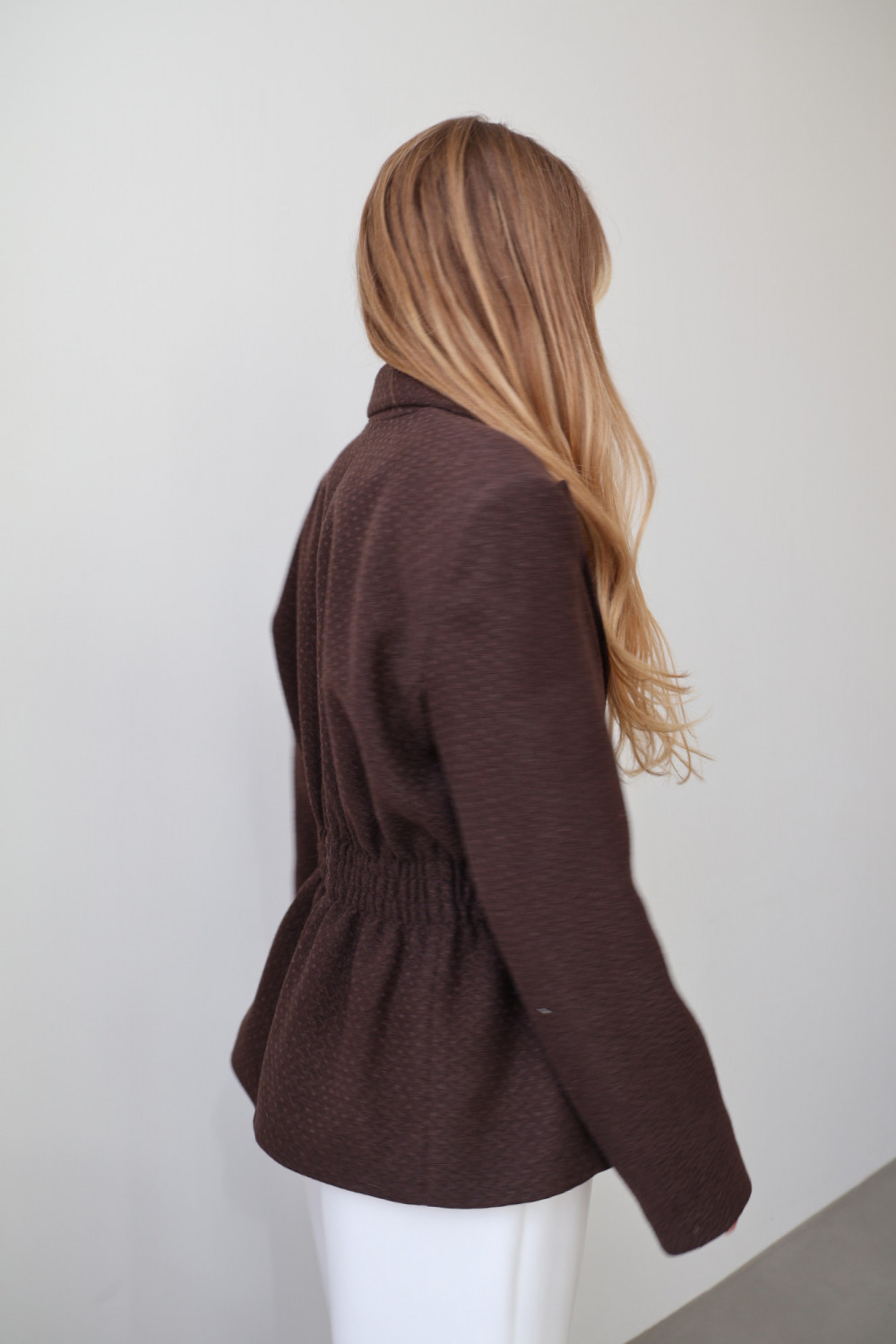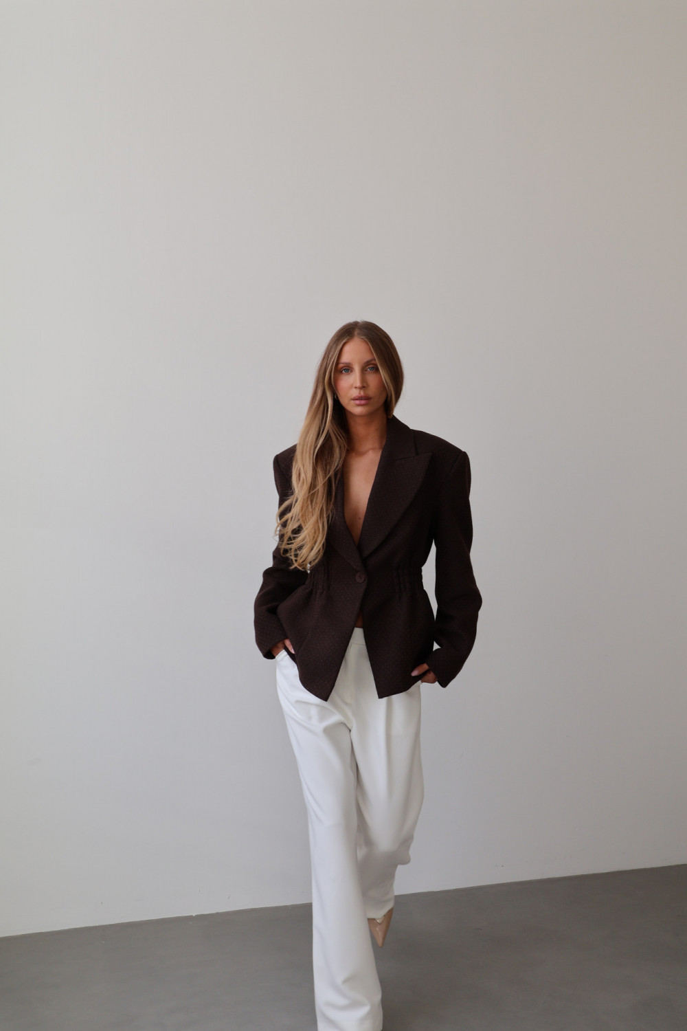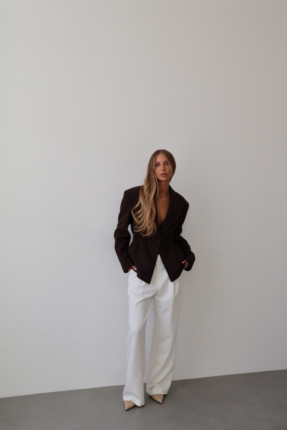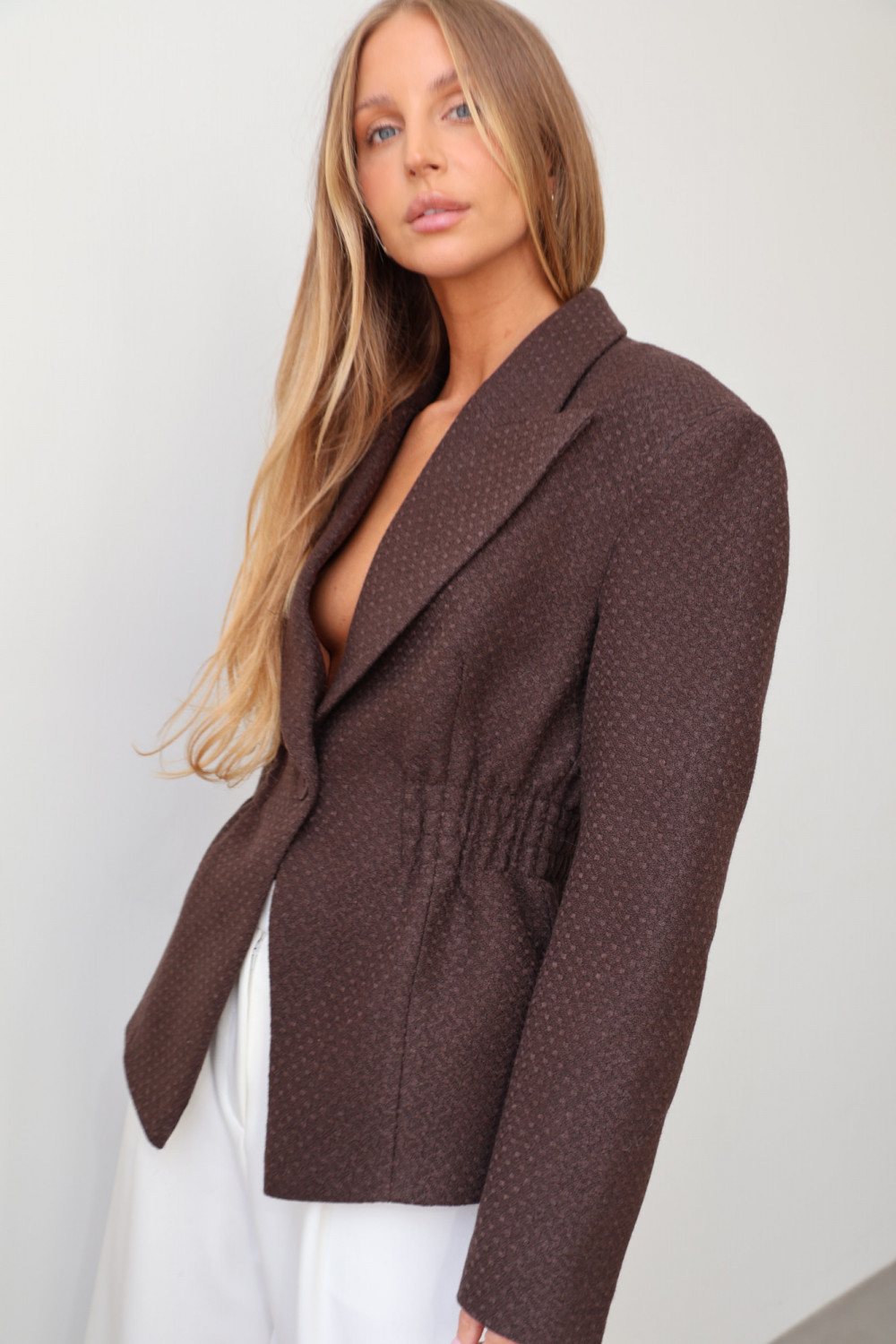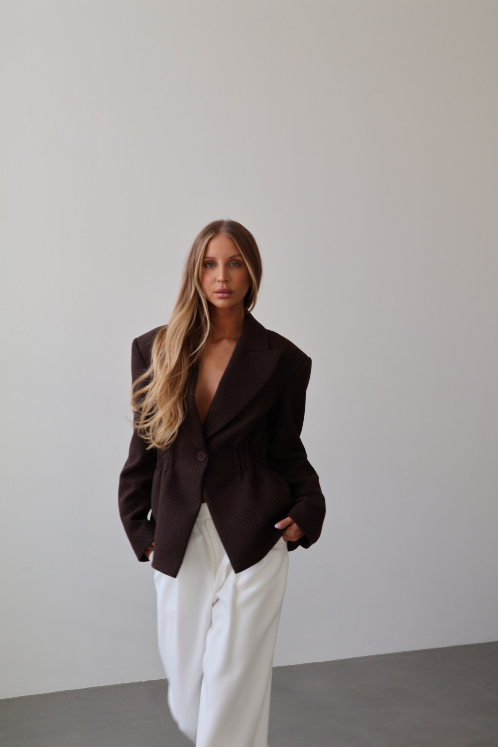 Marynarka ROYAL w odcieniu czekolady to eleganckie połączenie wygody i nowoczesnego stylu. Wykonana z wysokiej jakości materiału, zapewnia komfort noszenia i doskonałe dopasowanie do sylwetki dzięki praktycznemu ściągaczowi w talii, który podkreśla kobiecą sylwetkę.