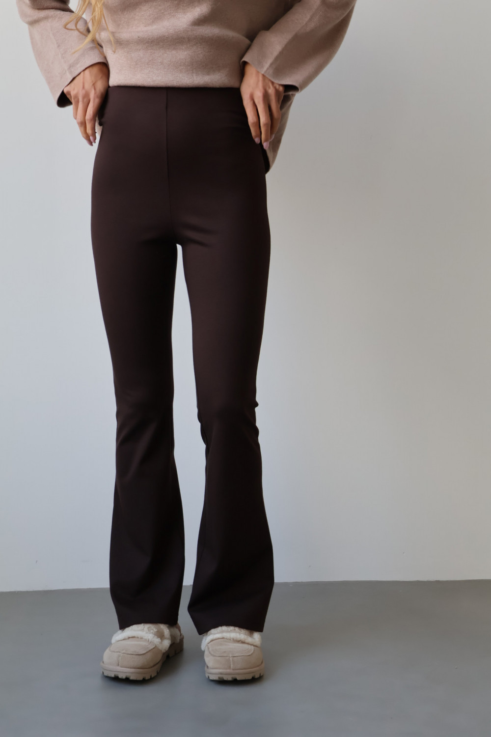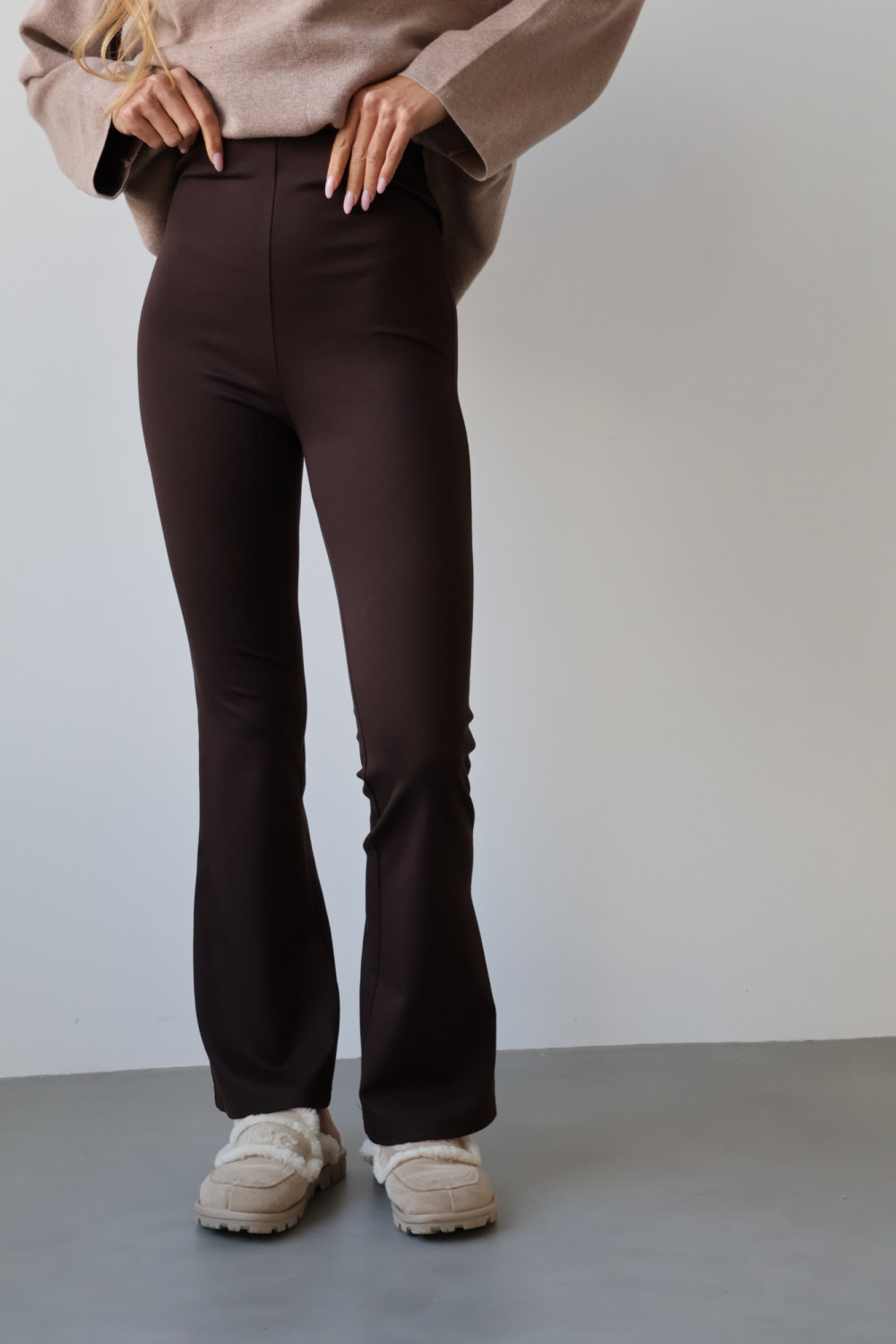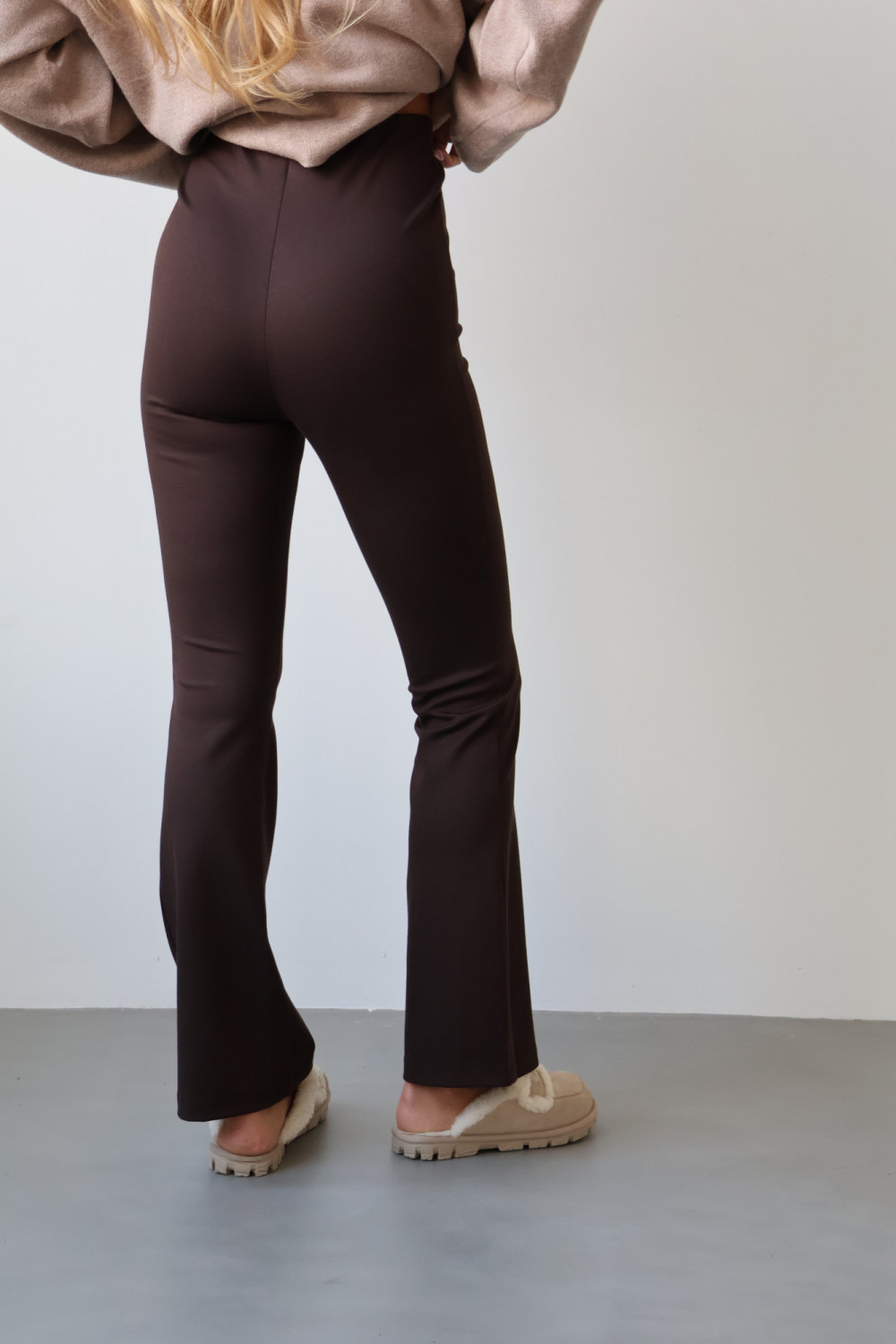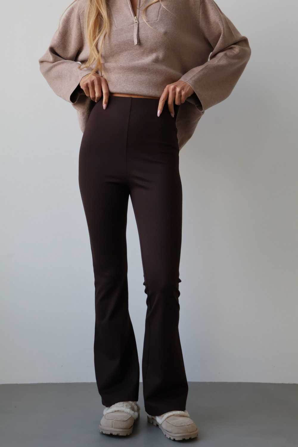 Rozszerzany krój nogawek nadaje legginsom lekkości i modnego charakteru, tworząc efektowny look zarówno w casualowych, jak i bardziej eleganckich stylizacjach. Głęboki, czekoladowy kolor sprawia, że legginsy SKIMS łatwo zestawić z różnymi elementami garderoby, podkreślając stylowy i ponadczasowy charakter outfitu.