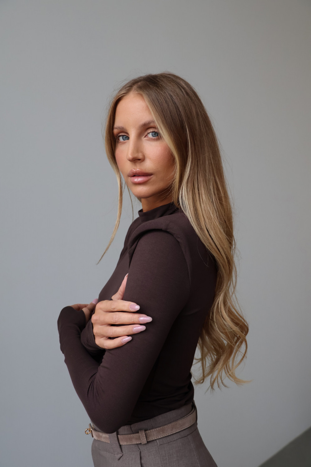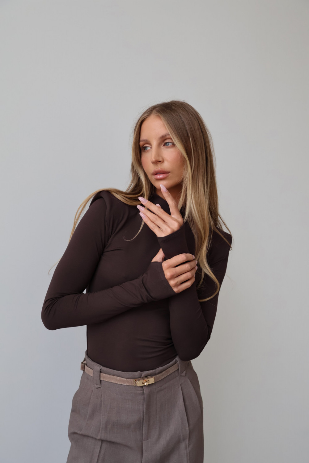 Poduszki na ramionach nadają golfowi modnego, subtelnie awangardowego charakteru, podkreślając sylwetkę i dodając stylowego akcentu każdej stylizacji. Głęboki, czekoladowy kolor wprowadza elegancję i uniwersalność, dzięki czemu golf AMELINE świetnie komponuje się zarówno z casualowymi, jak i bardziej formalnymi zestawami.