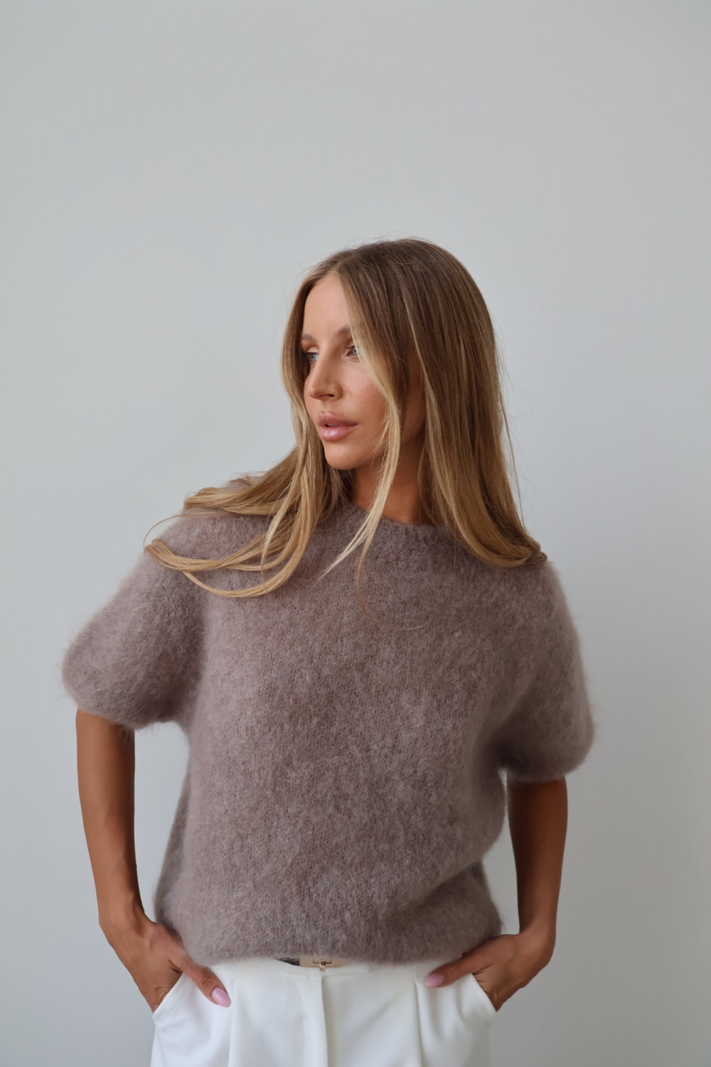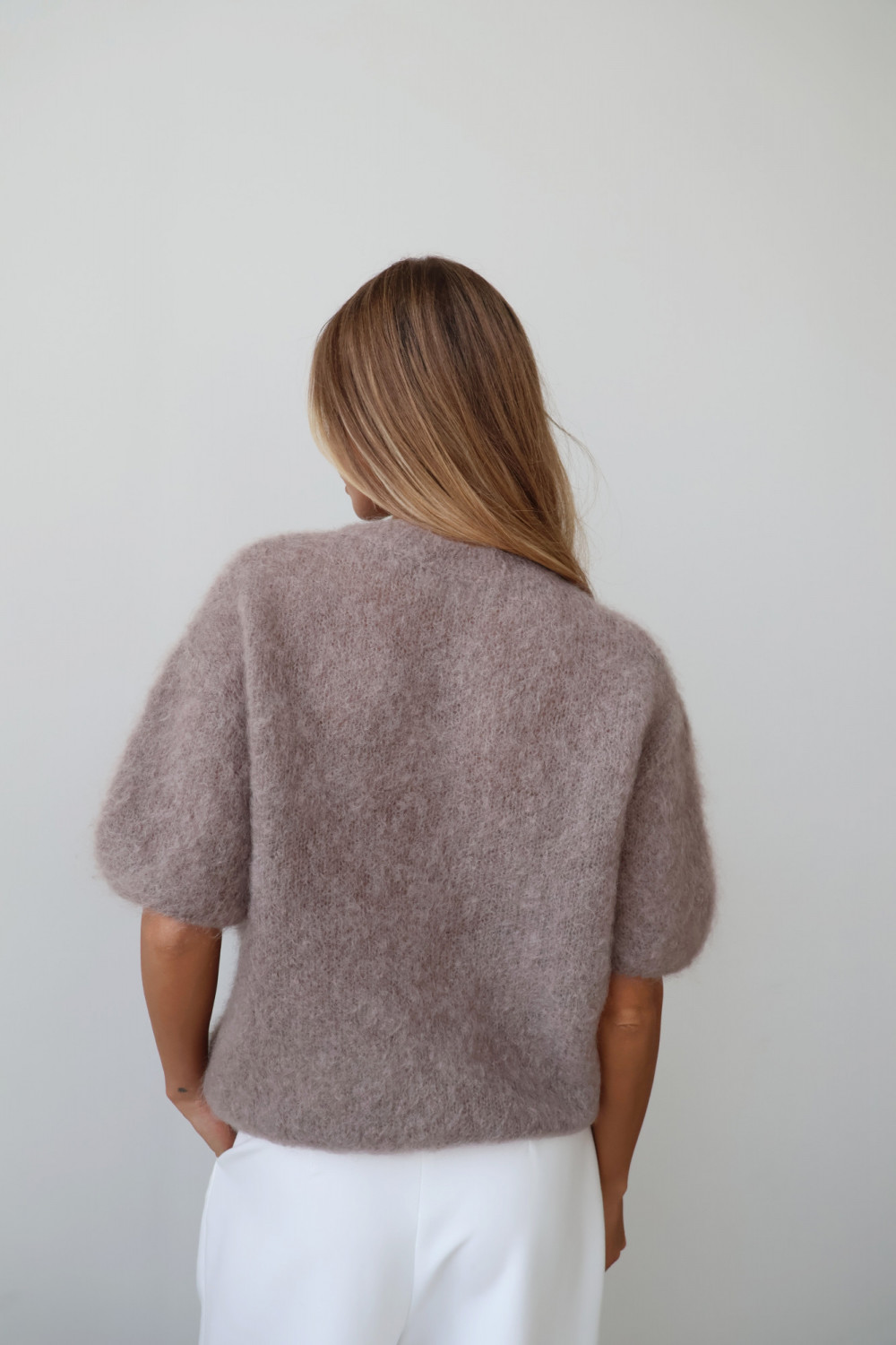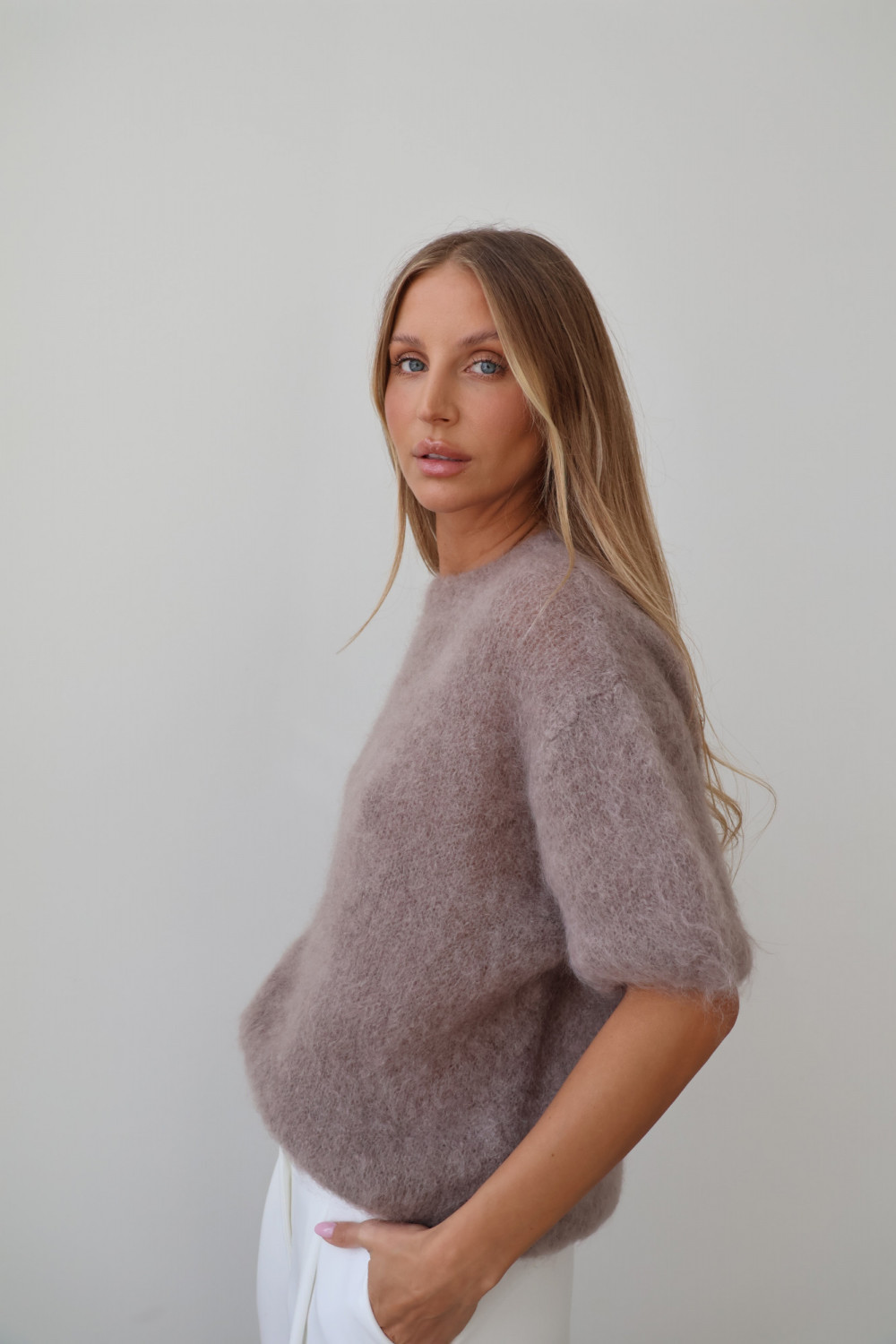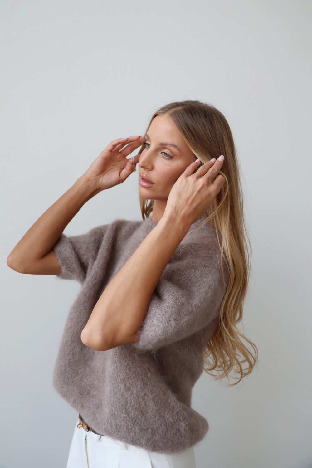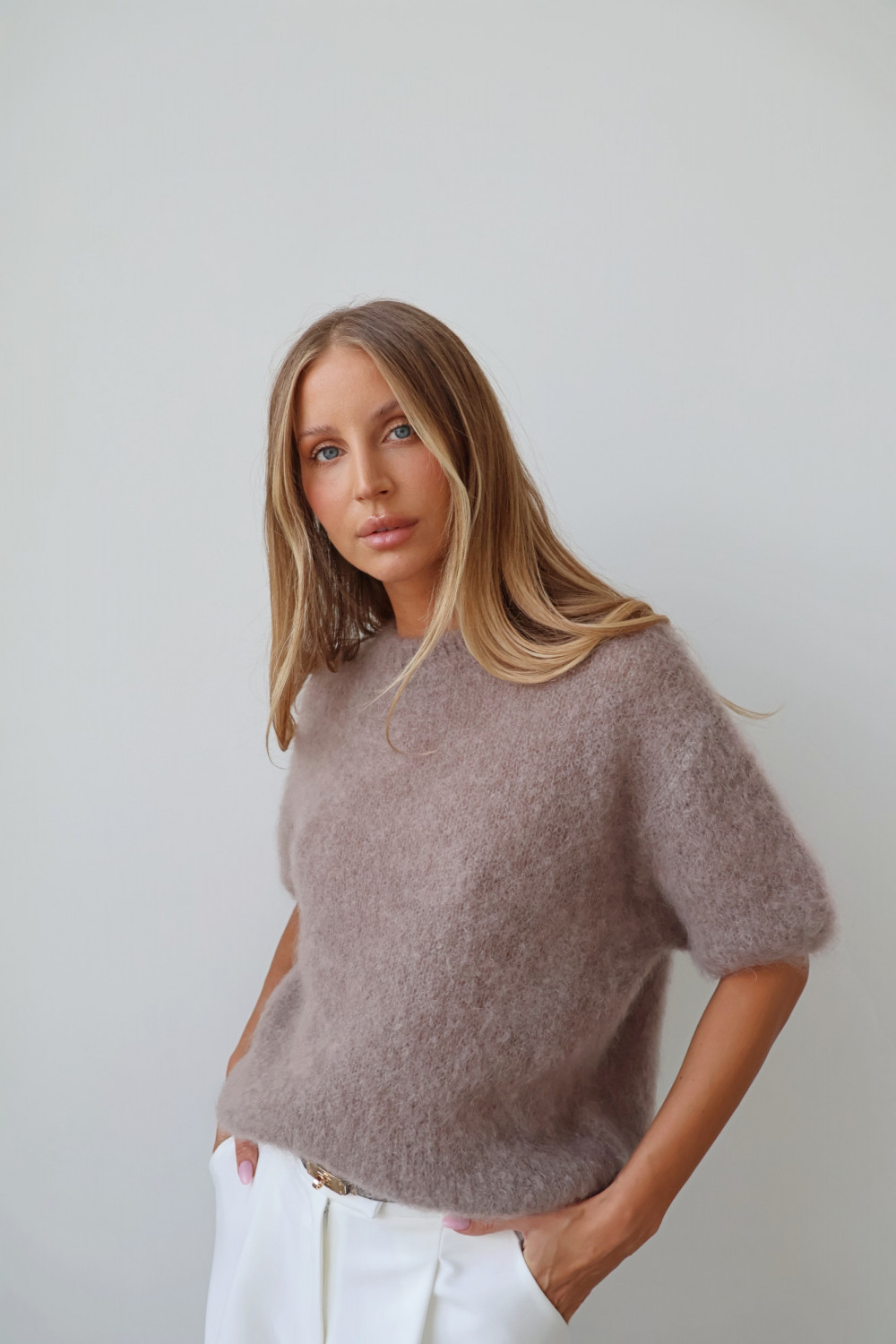 Sweter Yara w odcieniu taupe wykonany jest z 80% moheru premium, który zachwyca lekkością, puszystością i naturalnym ciepłem. Krótki rękaw nadaje mu lekkości i nowoczesnego charakteru, a miękki materiał otula komfortem i jest przyjemny dla skóry. Klasyczny fason łączy subtelną elegancję z ponadczasowym stylem, tworząc idealny wybór dla osób ceniących luksusowy komfort i wyrafinowany wygląd.