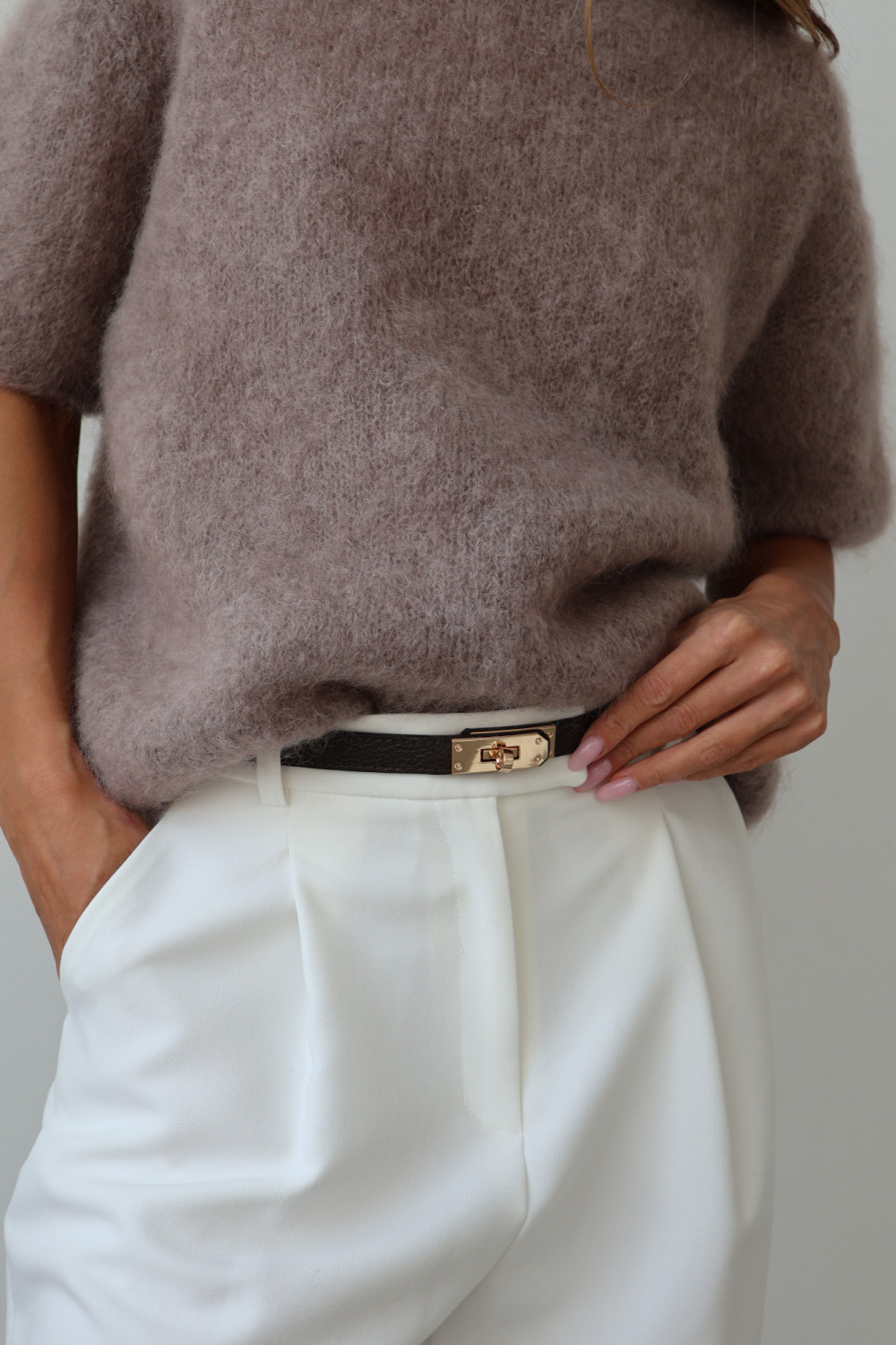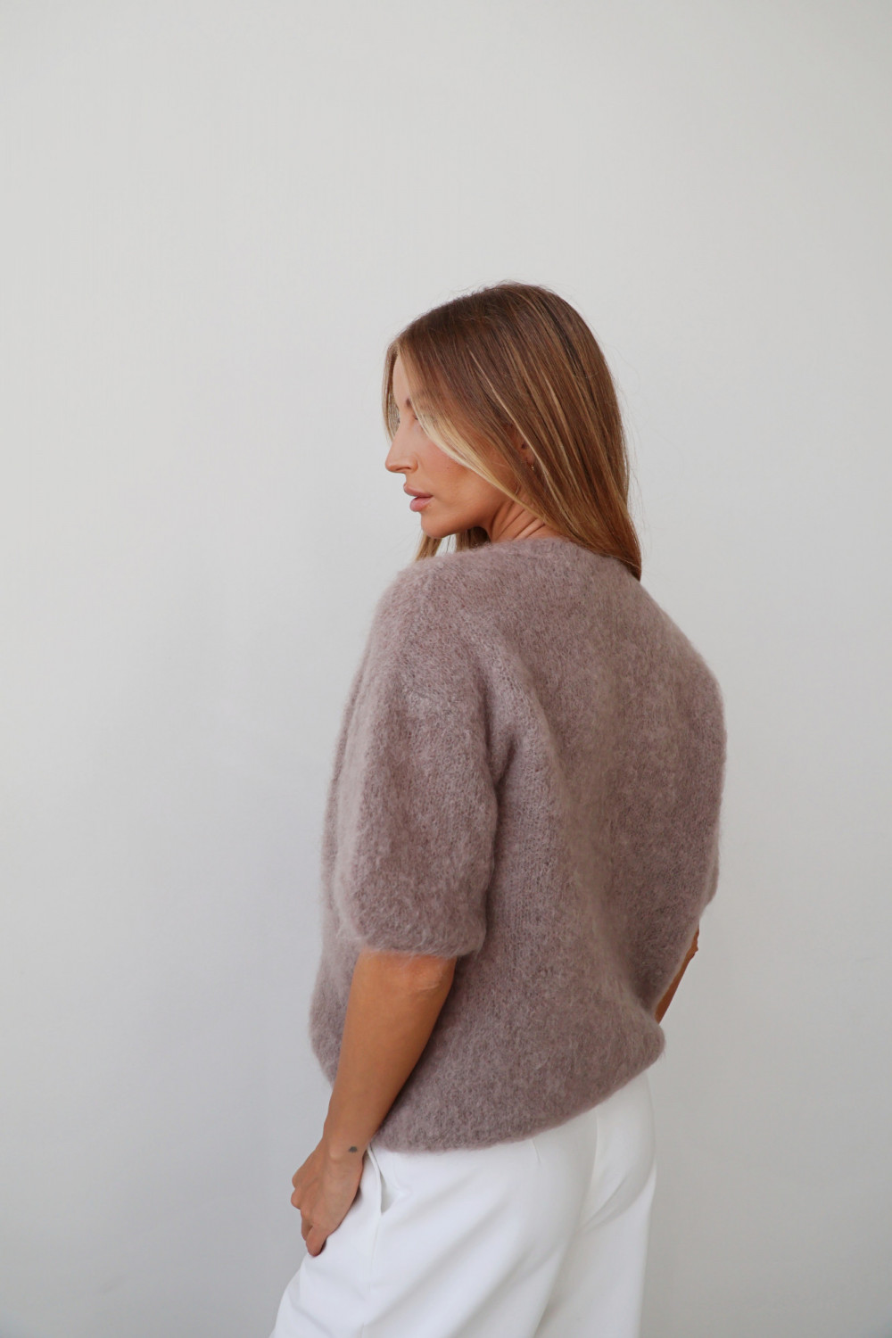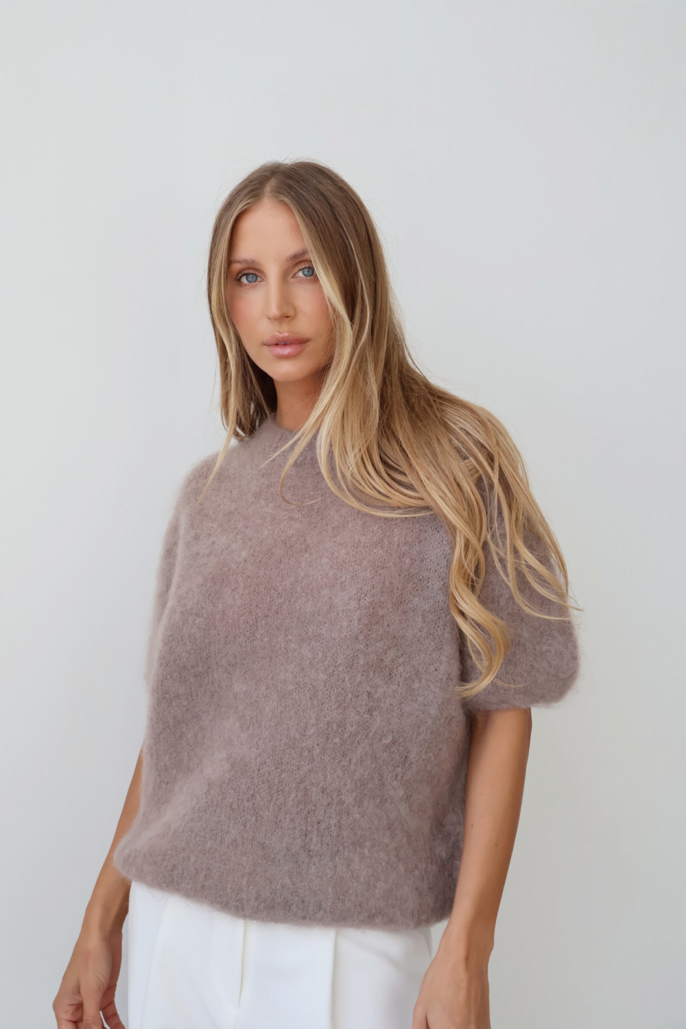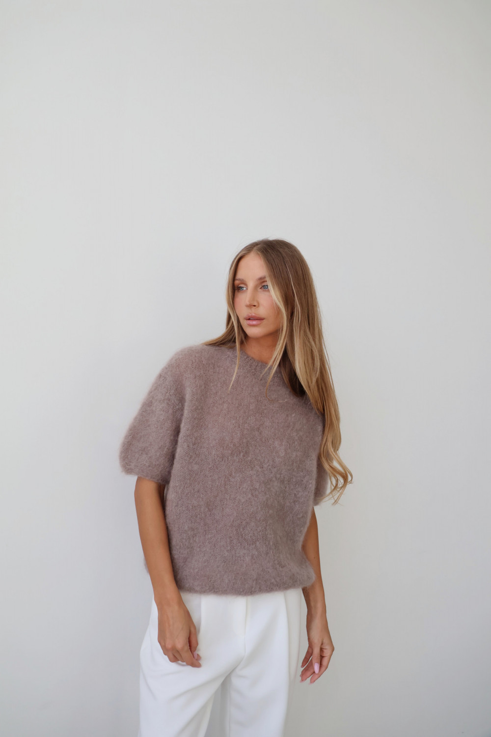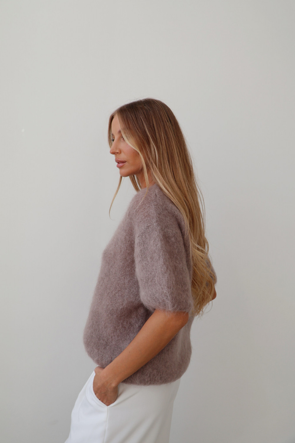 Sweter Yara w odcieniu taupe wykonany jest z 80% moheru premium, który zachwyca lekkością, puszystością i naturalnym ciepłem. Krótki rękaw nadaje mu lekkości i nowoczesnego charakteru, a miękki materiał otula komfortem i jest przyjemny dla skóry. Klasyczny fason łączy subtelną elegancję z ponadczasowym stylem, tworząc idealny wybór dla osób ceniących luksusowy komfort i wyrafinowany wygląd.