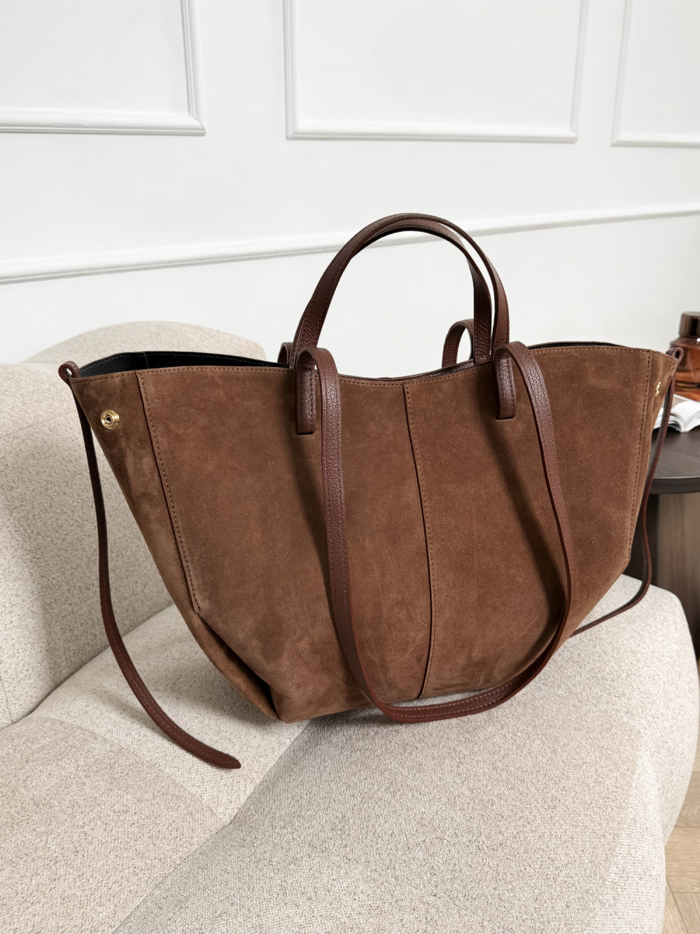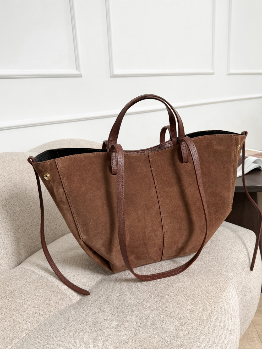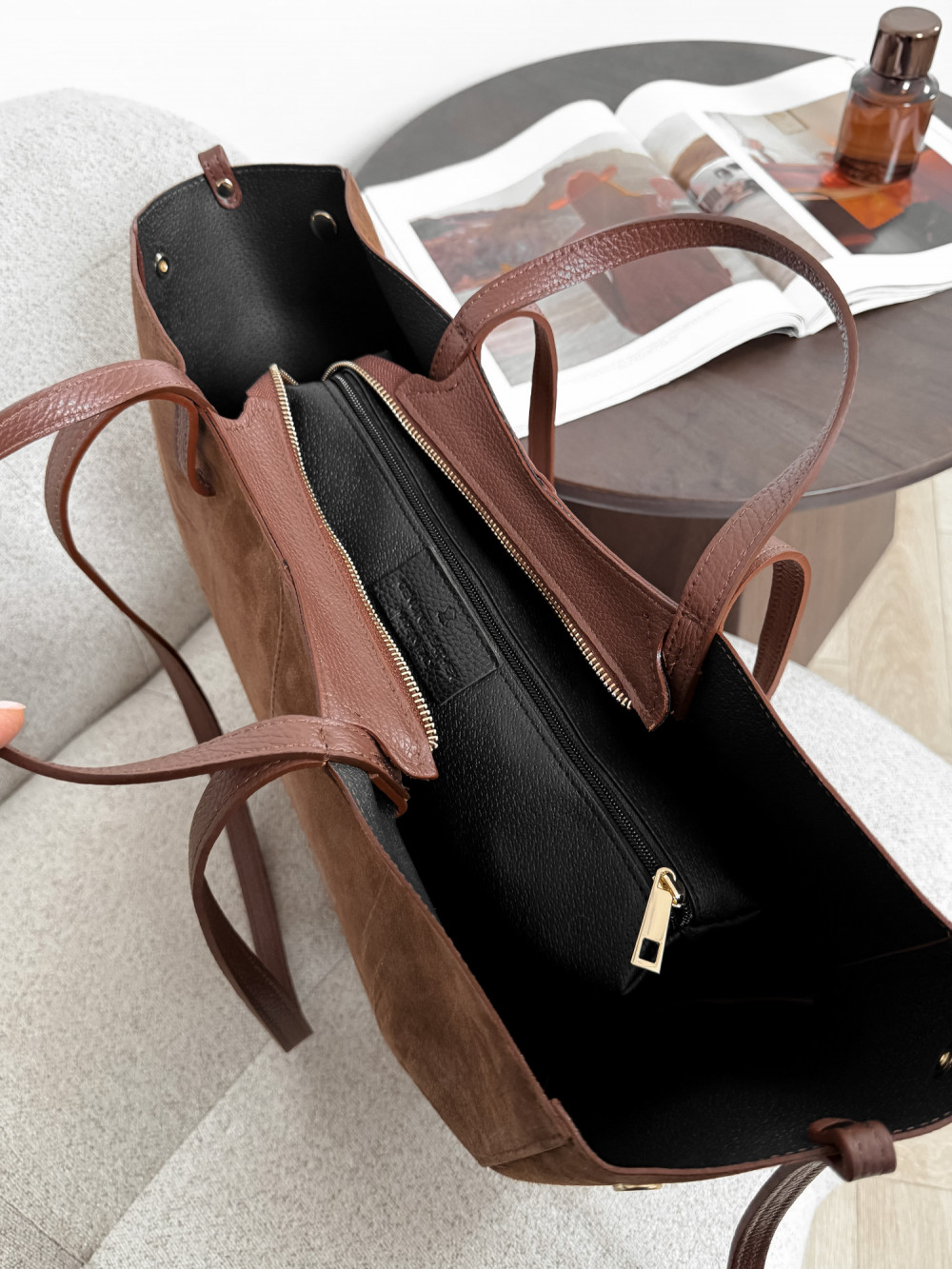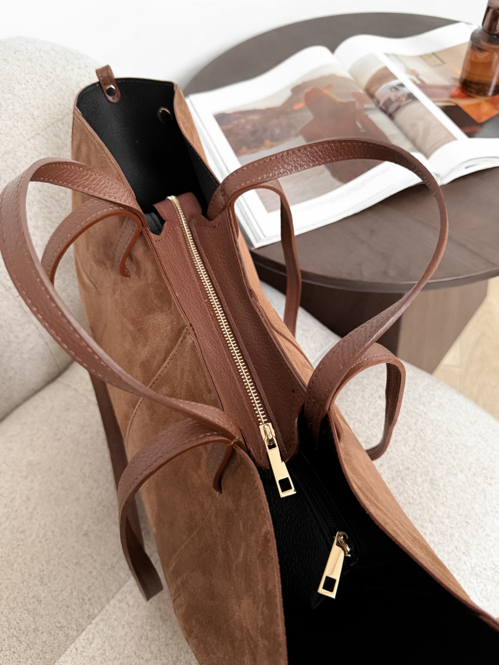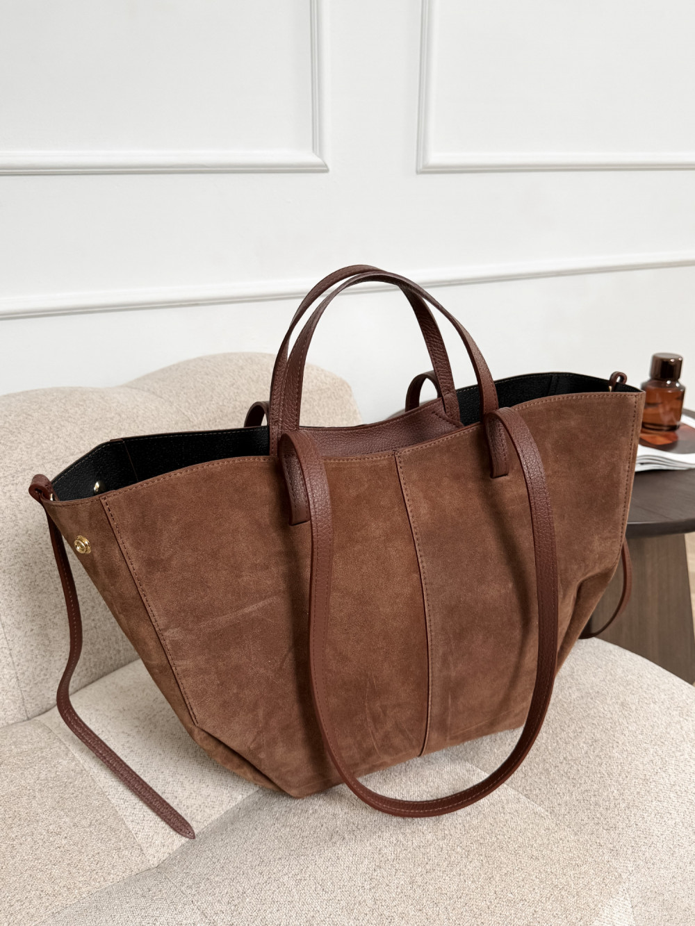 Torebka SOLENE MAXI w odcieniu kasztan to połączenie luksusu, funkcjonalności i nowoczesnej klasyki. Wykonana z najwyższej jakości skóry zamszowej, zachwyca ciepłym, głębokim odcieniem, który nadaje jej elegancji i ponadczasowego charakteru. Duży rozmiar torebki sprawia, że jest idealnym wyborem dla kobiet ceniących przestronność i wygodę – pomieści wszystkie codzienne niezbędniki, zachowując przy tym stylowy wygląd.