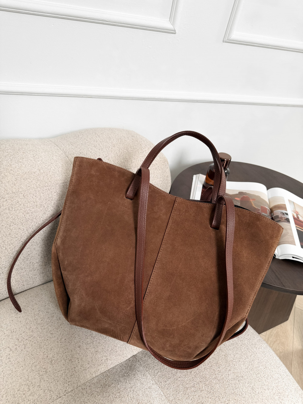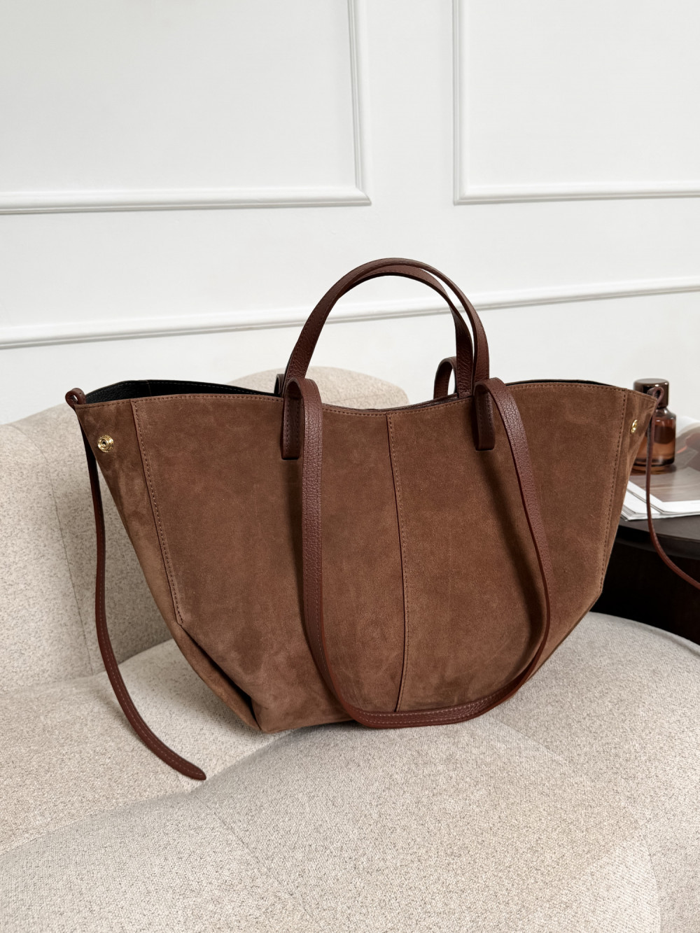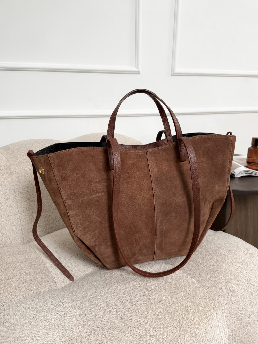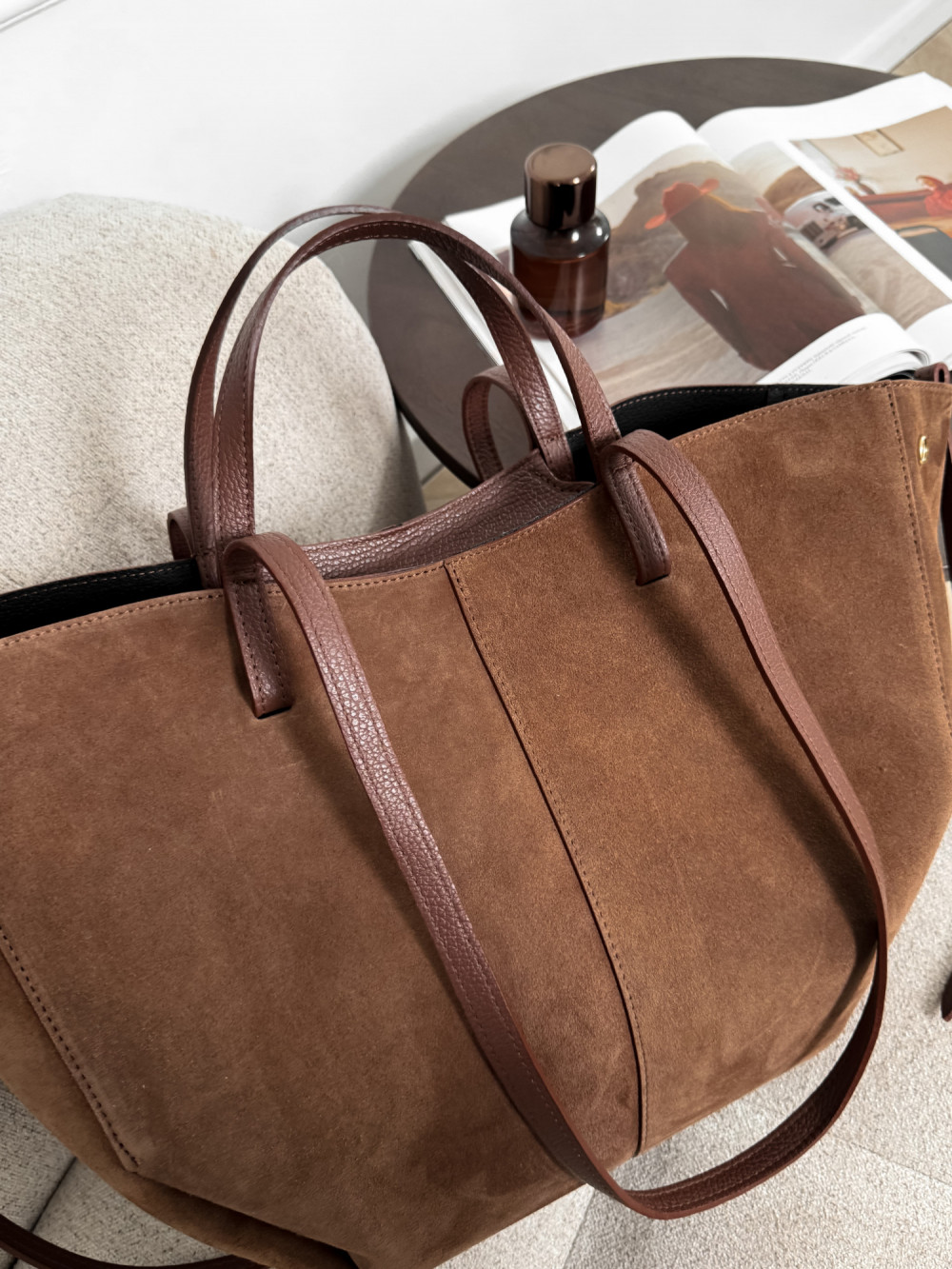 Torebka SOLENE MAXI w odcieniu kasztan to połączenie luksusu, funkcjonalności i nowoczesnej klasyki. Wykonana z najwyższej jakości skóry zamszowej, zachwyca ciepłym, głębokim odcieniem, który nadaje jej elegancji i ponadczasowego charakteru. Duży rozmiar torebki sprawia, że jest idealnym wyborem dla kobiet ceniących przestronność i wygodę – pomieści wszystkie codzienne niezbędniki, zachowując przy tym stylowy wygląd.