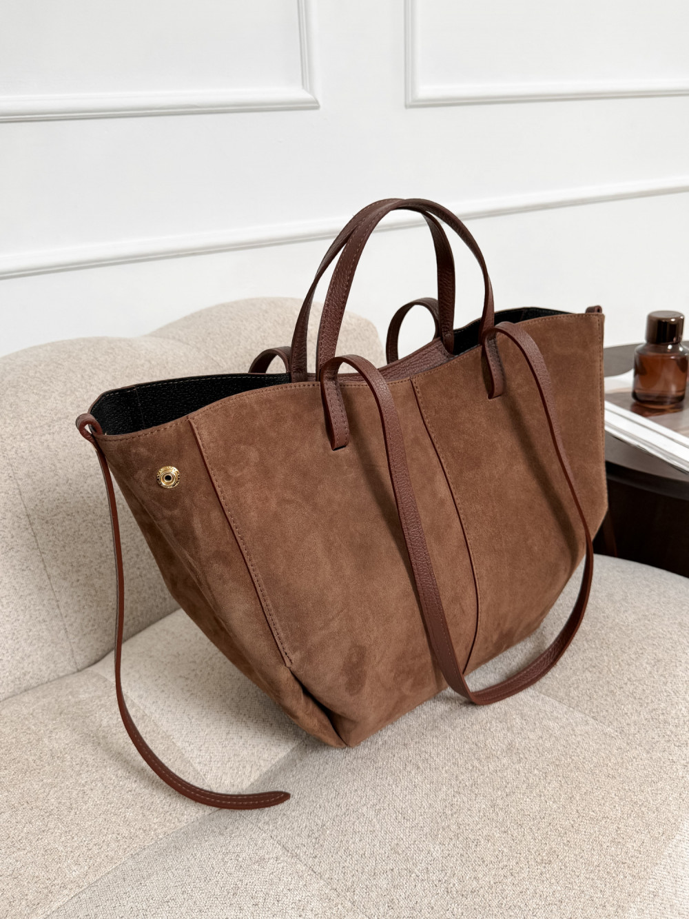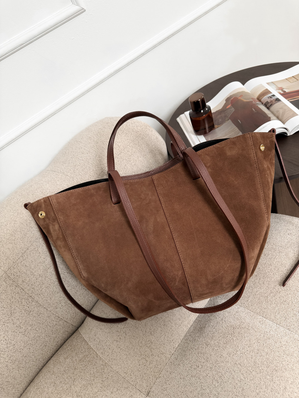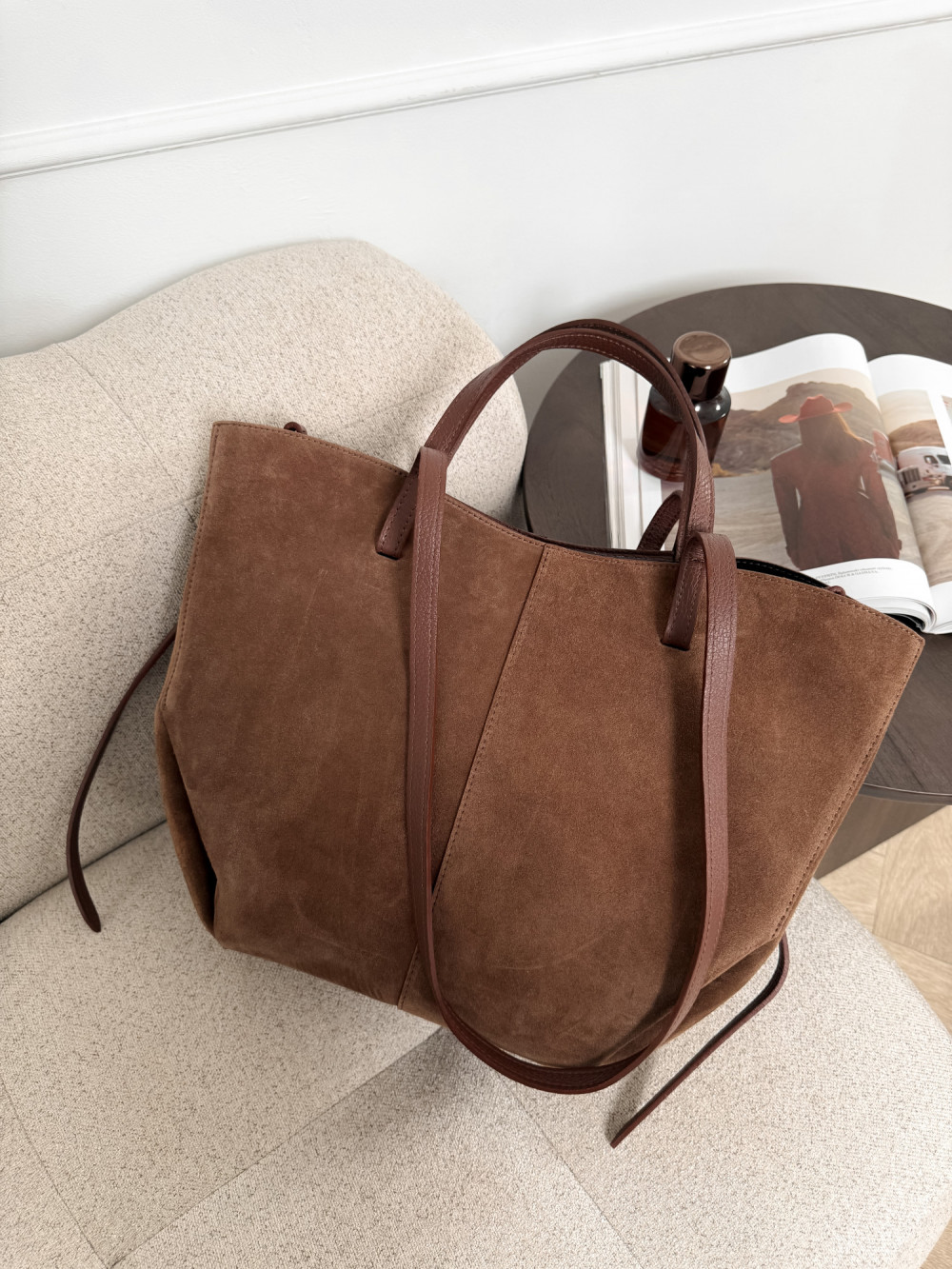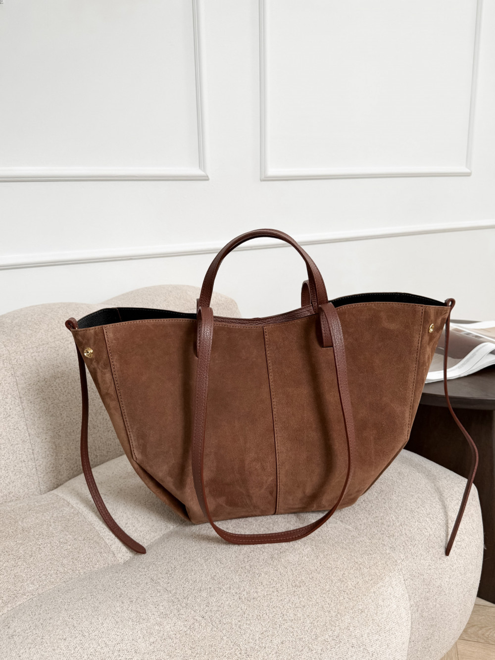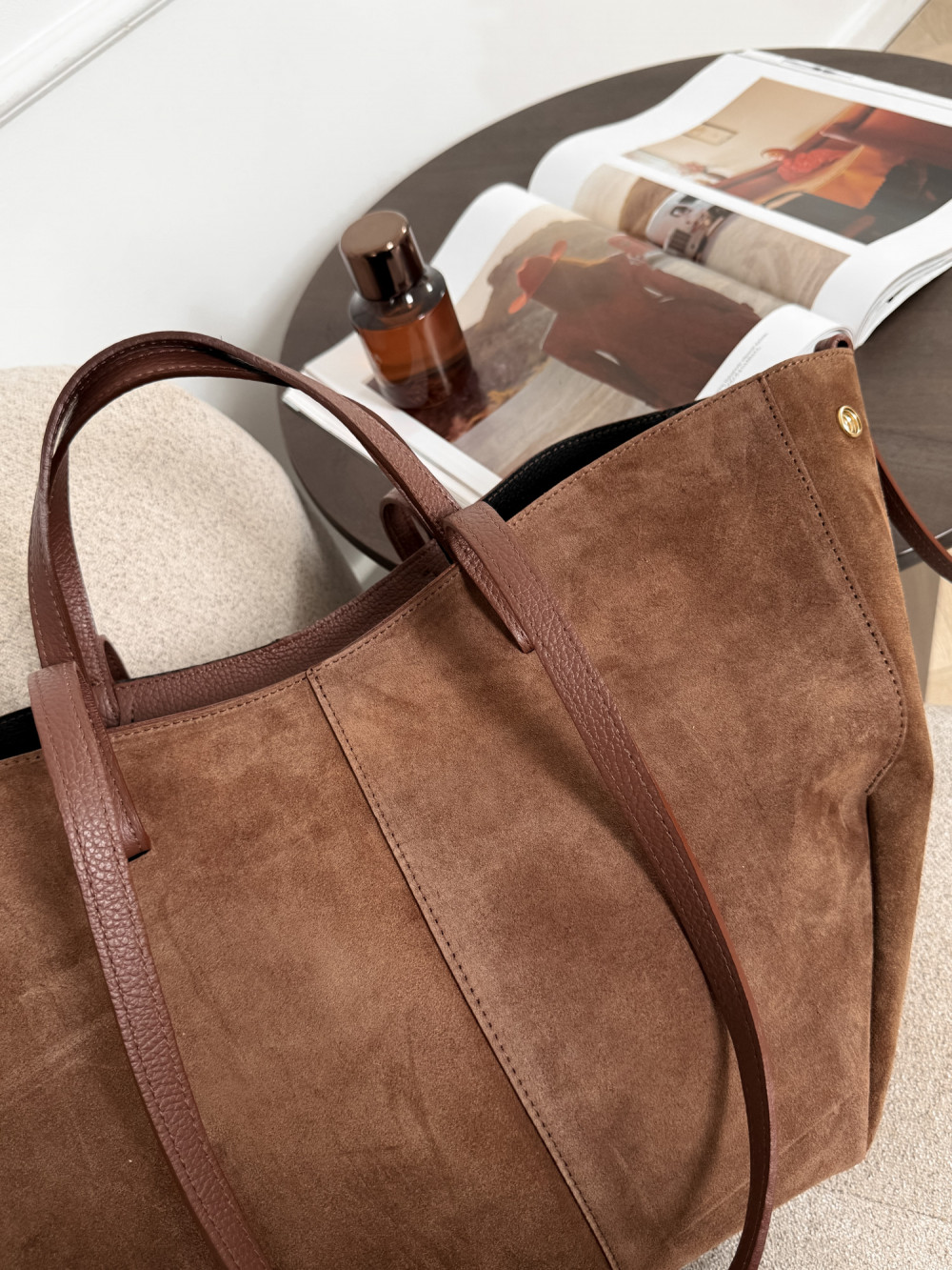 Torebka SOLENE MAXI w odcieniu kasztan to połączenie luksusu, funkcjonalności i nowoczesnej klasyki. Wykonana z najwyższej jakości skóry zamszowej, zachwyca ciepłym, głębokim odcieniem, który nadaje jej elegancji i ponadczasowego charakteru. Duży rozmiar torebki sprawia, że jest idealnym wyborem dla kobiet ceniących przestronność i wygodę – pomieści wszystkie codzienne niezbędniki, zachowując przy tym stylowy wygląd.