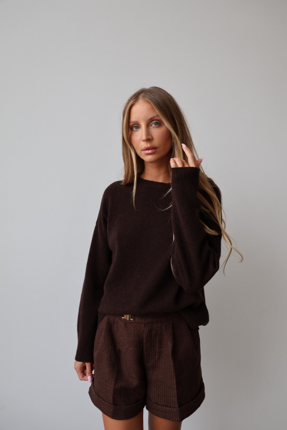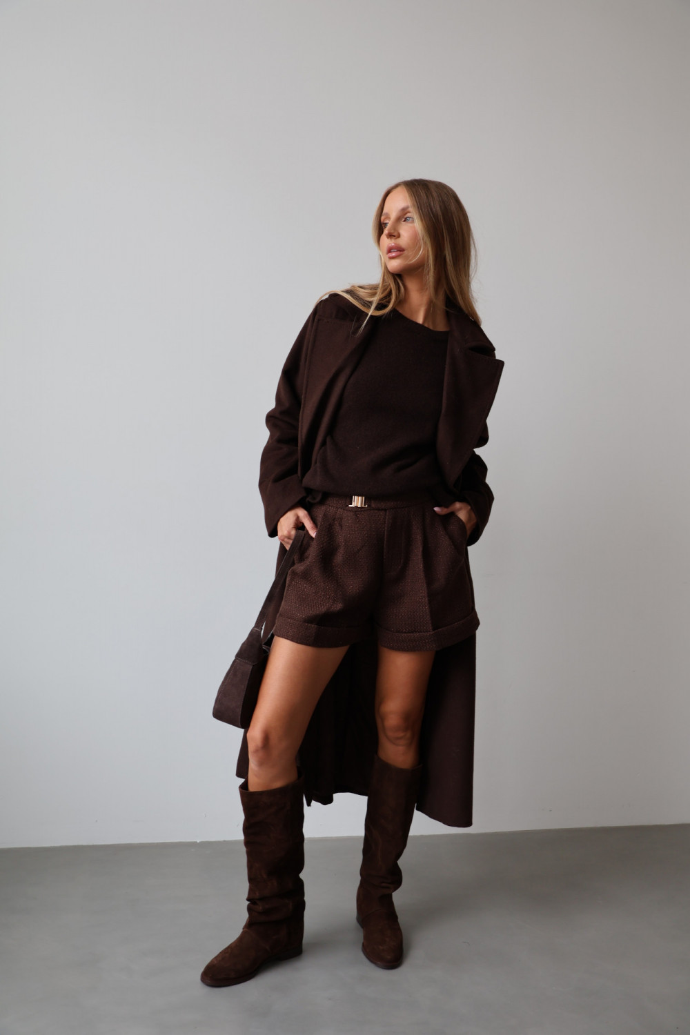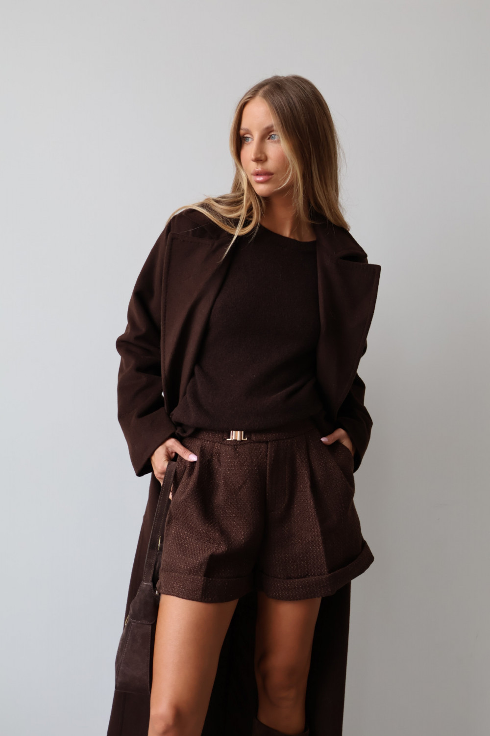 Szorty Biarri w czekoladowym odcieniu łączą lekkość wiskozy z ciepłem i miękkością wełny, tworząc wyjątkowo komfortowy i elegancki materiał. Wysoki stan ozdobiony złotą klamrą subtelnie podkreśla sylwetkę, a starannie dopracowany krój nadaje ponadczasowej klasy każdej stylizacji. Idealne połączenie luksusowego minimalizmu i codziennego komfortu.