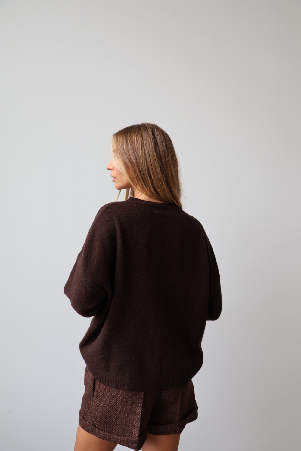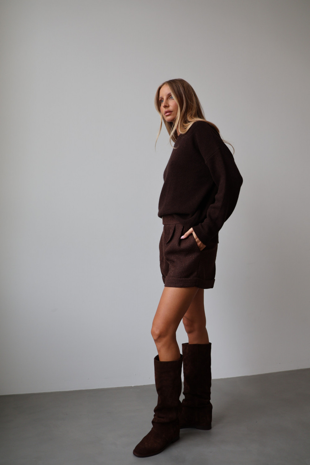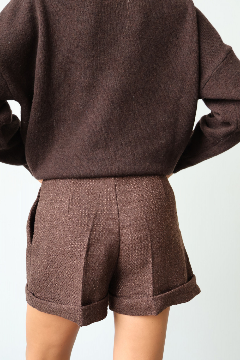 Szorty Biarri w czekoladowym odcieniu łączą lekkość wiskozy z ciepłem i miękkością wełny, tworząc wyjątkowo komfortowy i elegancki materiał. Wysoki stan ozdobiony złotą klamrą subtelnie podkreśla sylwetkę, a starannie dopracowany krój nadaje ponadczasowej klasy każdej stylizacji. Idealne połączenie luksusowego minimalizmu i codziennego komfortu.