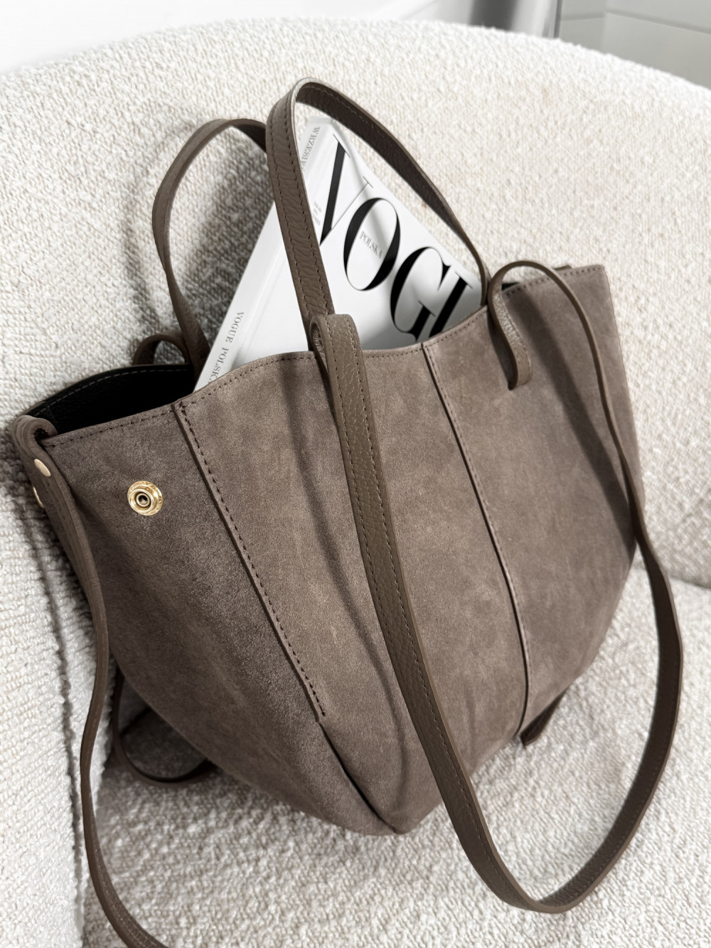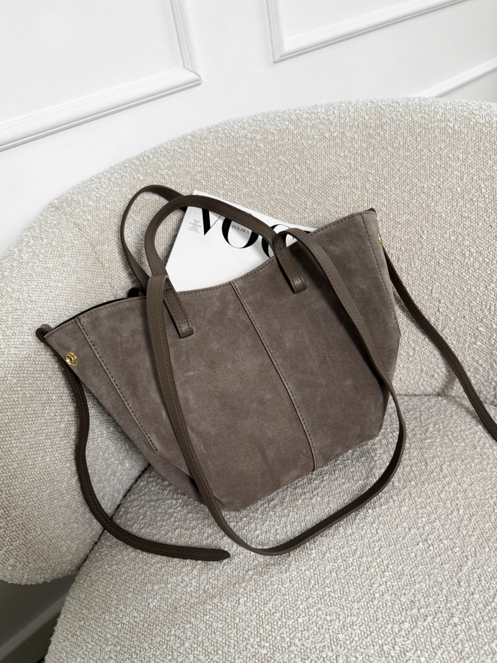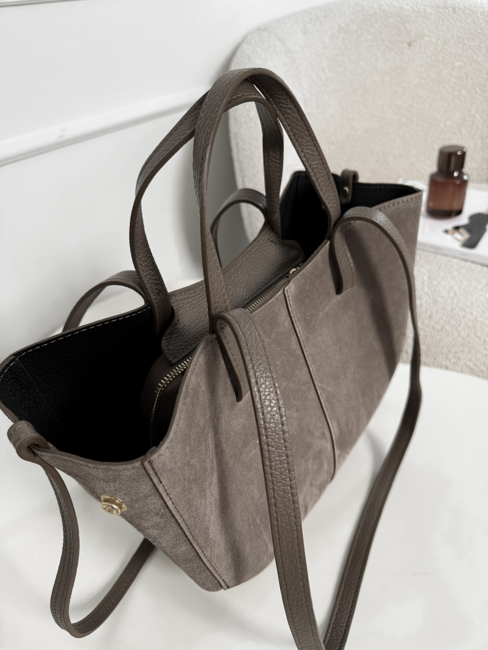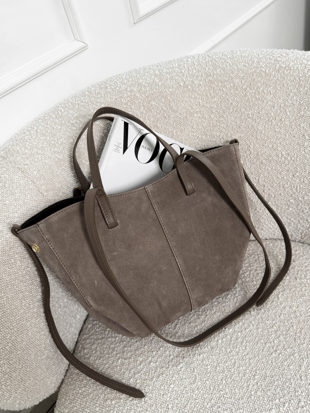 Torebka SOLENE w zamszu taupe to elegancki wybór dla kobiet ceniących ponadczasowy styl i wygodę.