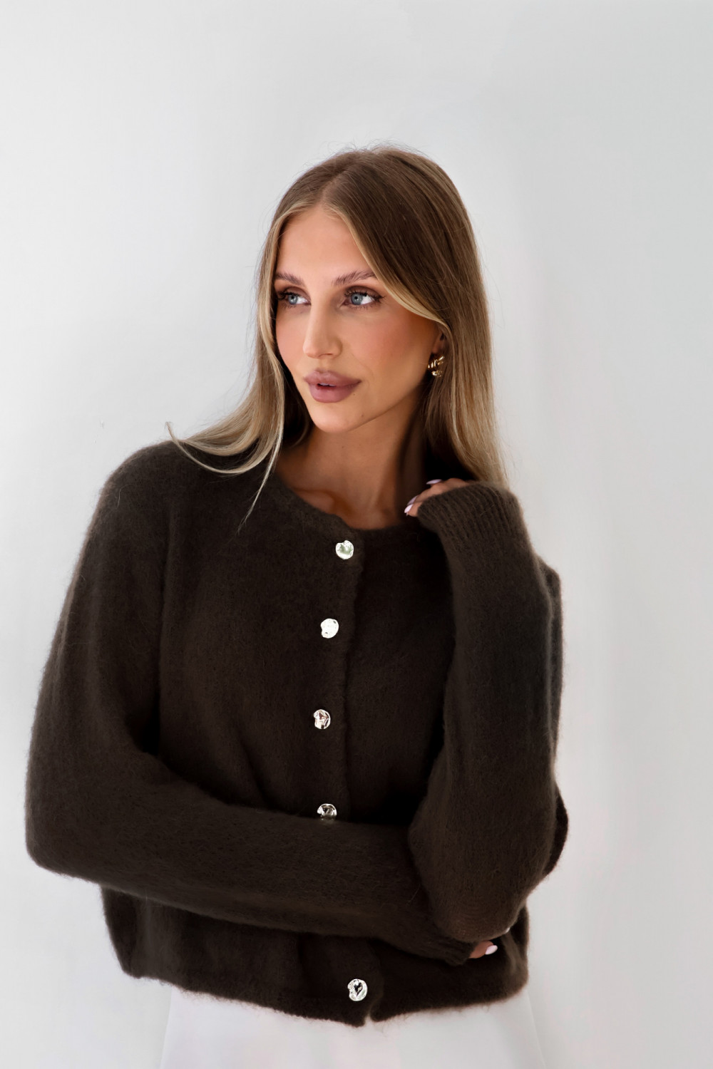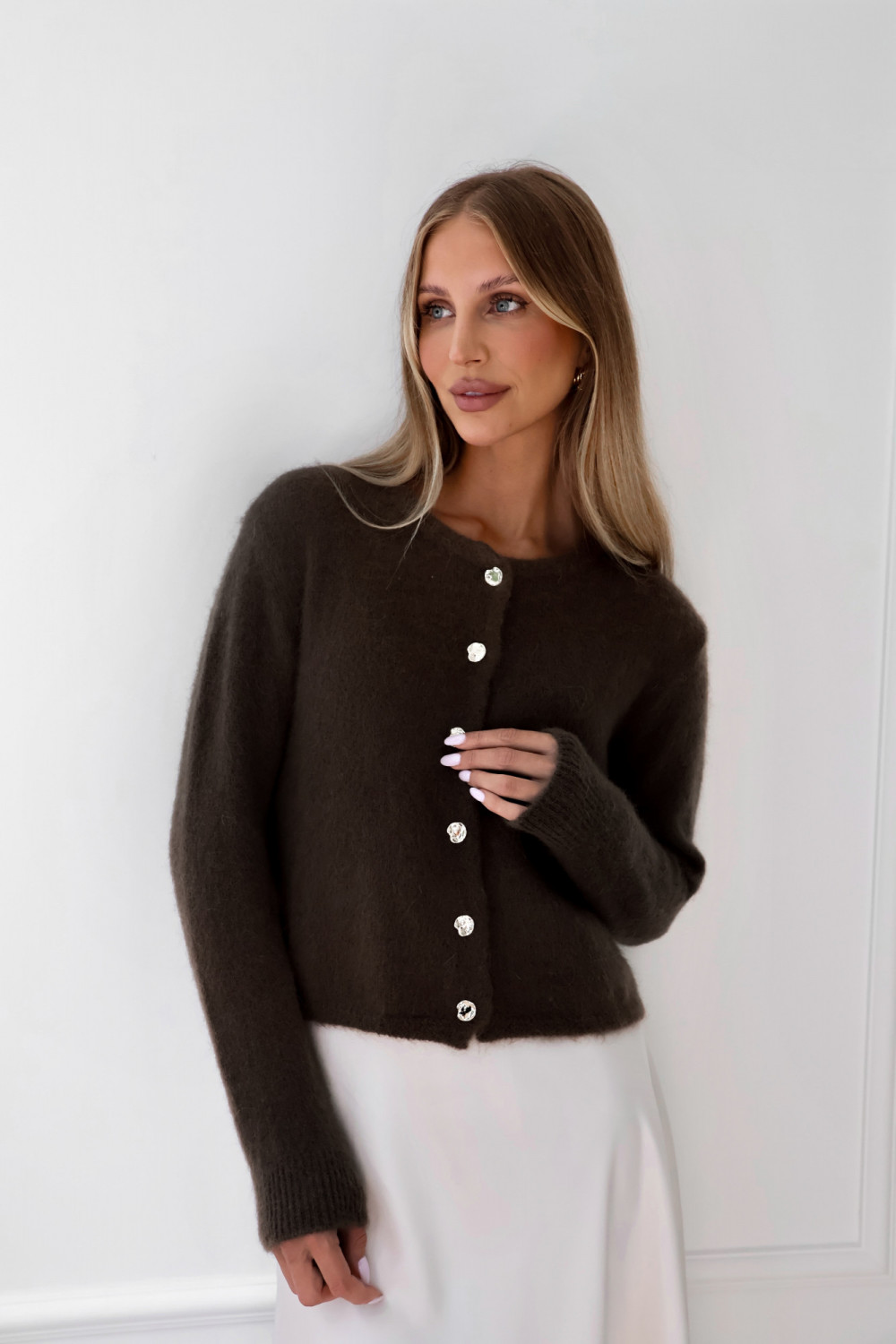Kardigan z kid moherem i wełną merino premium ze złotymi guzikami premium gorzka czekolada AURE