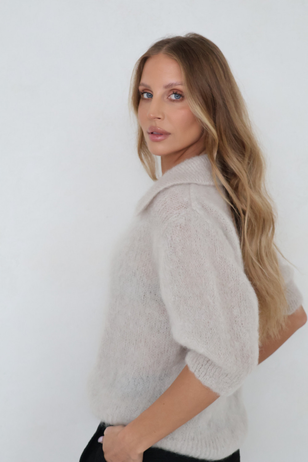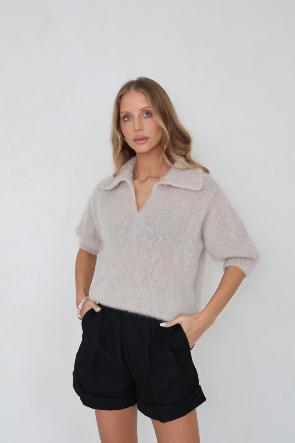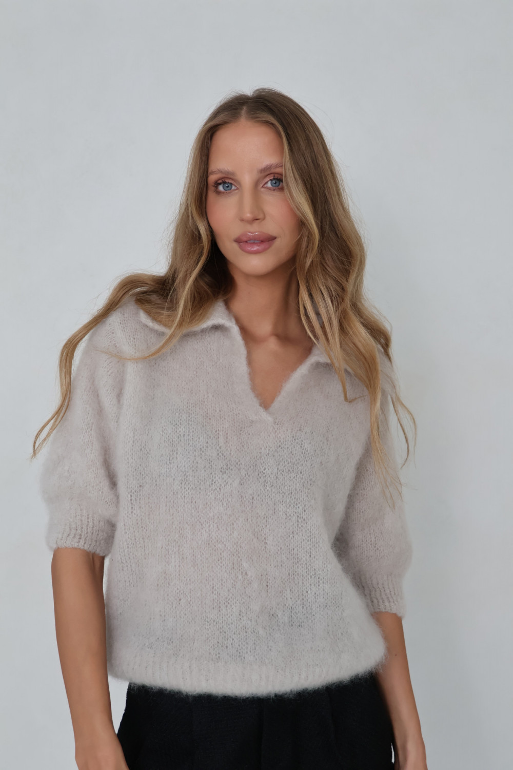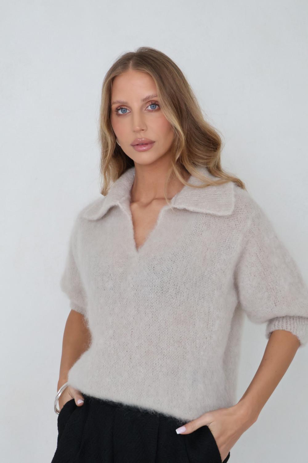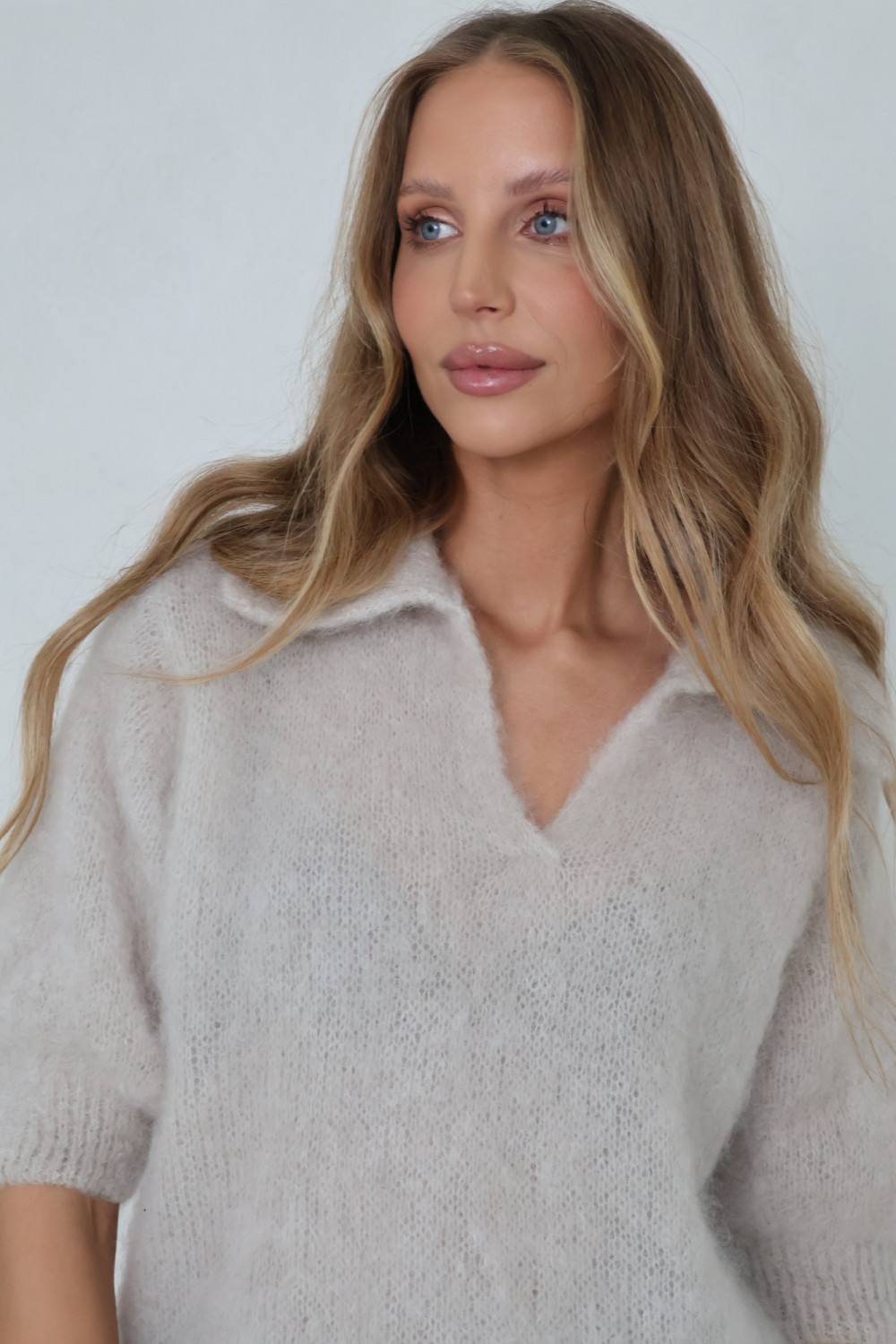 Sweter polo 81% kid moher premium jasny beż POLENE